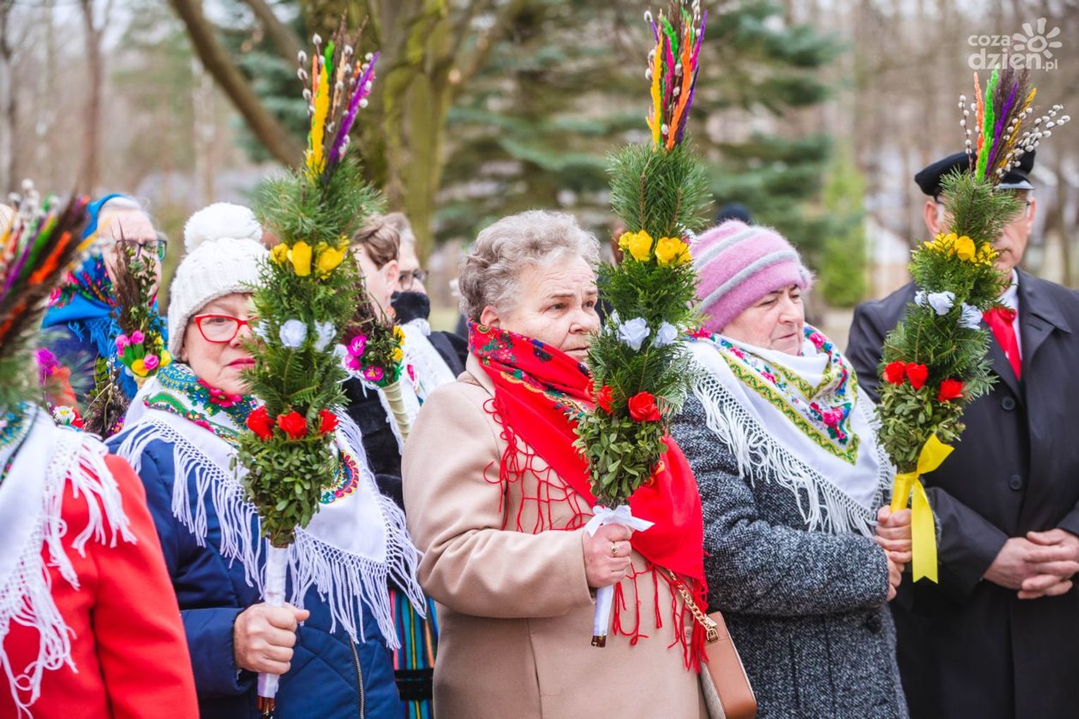 - Mamy jajo zrobione ze styropianu z nałożonymi kolorowymi cekinami i inne przeplatane nitką. To jest żmudna praca, ale te prace cieszą się dużą popularnością. Mamy też palmy. Kwiatki są ręcznie robione z bibuły i dekorujemy ją tują, która rośnie w ogródku. Oczywiście są też koszyczki. Wszystko w wystroju wielkanocnym, ozdobione bibułą - wylicza Hanna Jaroszek z Zespołu Folklorystycznego "Piątkowy Stok" ze Zwolenia.