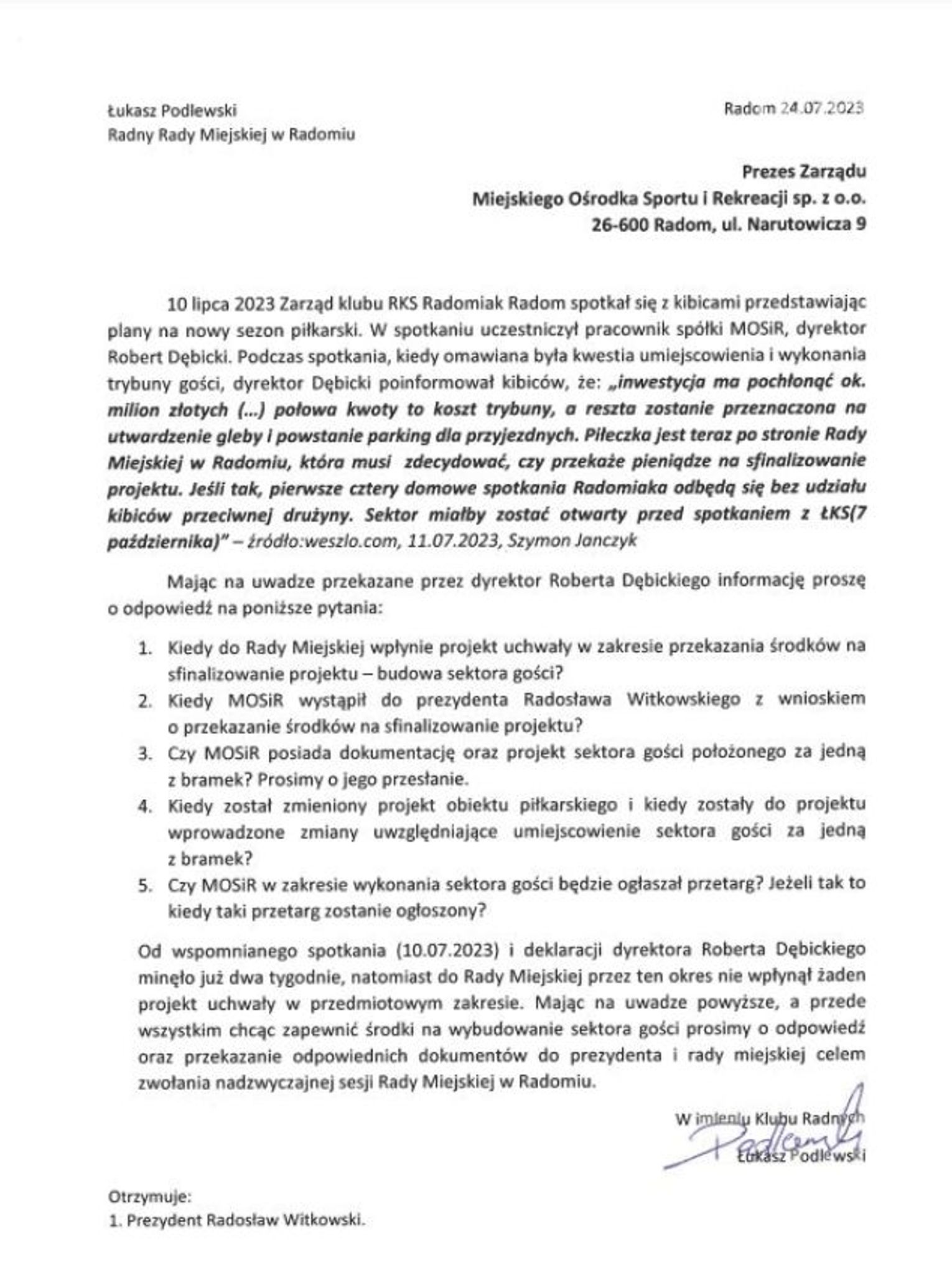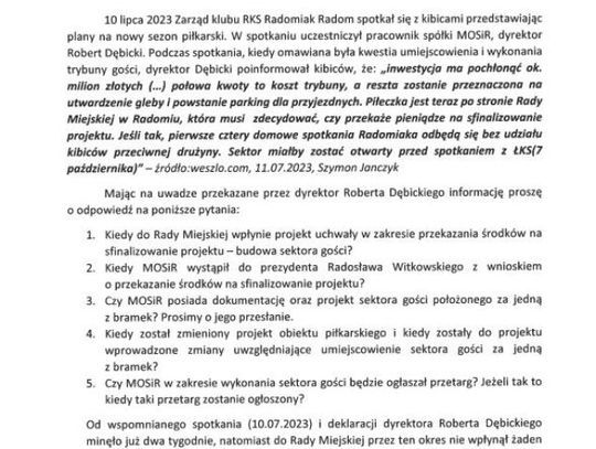 - Od wspomnianego spotkania (10.07.2023) i deklaracji dyrektora Roberta Dębickiego minęło już dwa tygodnie, natomiast do Rady Miejskiej przez ten okres nie wpłynął żaden projekt uchwały w przedmiotowym zakresie. Mając na uwadze powyższe, a przede wszystkim chcąc zapewnić środki na wybudowanie sektora gości prosimy o odpowiedź oraz przekazanie odpowiednich dokumentów do prezydenta i Rady Miejskiej celem zwołania nadzwyczajnej sesji Rady Miejskiej w Radomiu - pisze w imieniu klub radnych PiS, przewodniczący Łukasz Podlewski.