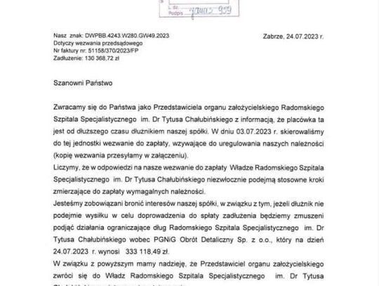 - Mamy nadwykonania niezapłacone przez Narodowy Fundusz Zdrowia za drugi kwartał tego roku, czego dotyczy ta faktura. Jednocześnie mamy informację od NFZ, że 15 sierpnia dostaniemy informację czy i w jakiej kwocie te nadwykonania zostaną nam opłacone. Kontrahenci chcą, żebyśmy płacili im na czas, a z drugiej strony nasz narodowy płatnik nie wywiązuje się ze swoich zobowiązań - mówi Jerzy Zawodnik, zastępca dyrektora ds. eksploatacyjnych Radomskiego Szpitala Specjalistycznego.