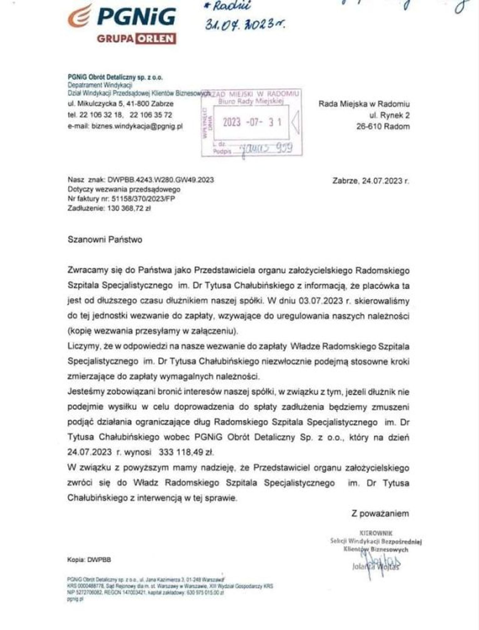 Spółka PGNiG skierowała list do radnych, w których prosi o interwencję wobec zaległości Radomskiego Szpitala Specjalistycznego, które wynoszą (na 24 lipca br). 333 tys. 118 zł. - O trudnej sytuacji Radomskiego Szpitala Specjalistycznego wiemy od dawna. Nie zdawaliśmy sobie jednak sprawy, że należności takie jak za gaz czy prąd nie są płacone praktycznie od początku roku - informuje Katarzyna Pastuszka-Chrobotowicz, wiceprzewodniczący Rady Miejskiej, radna Prawa i Sprawiedliwości.