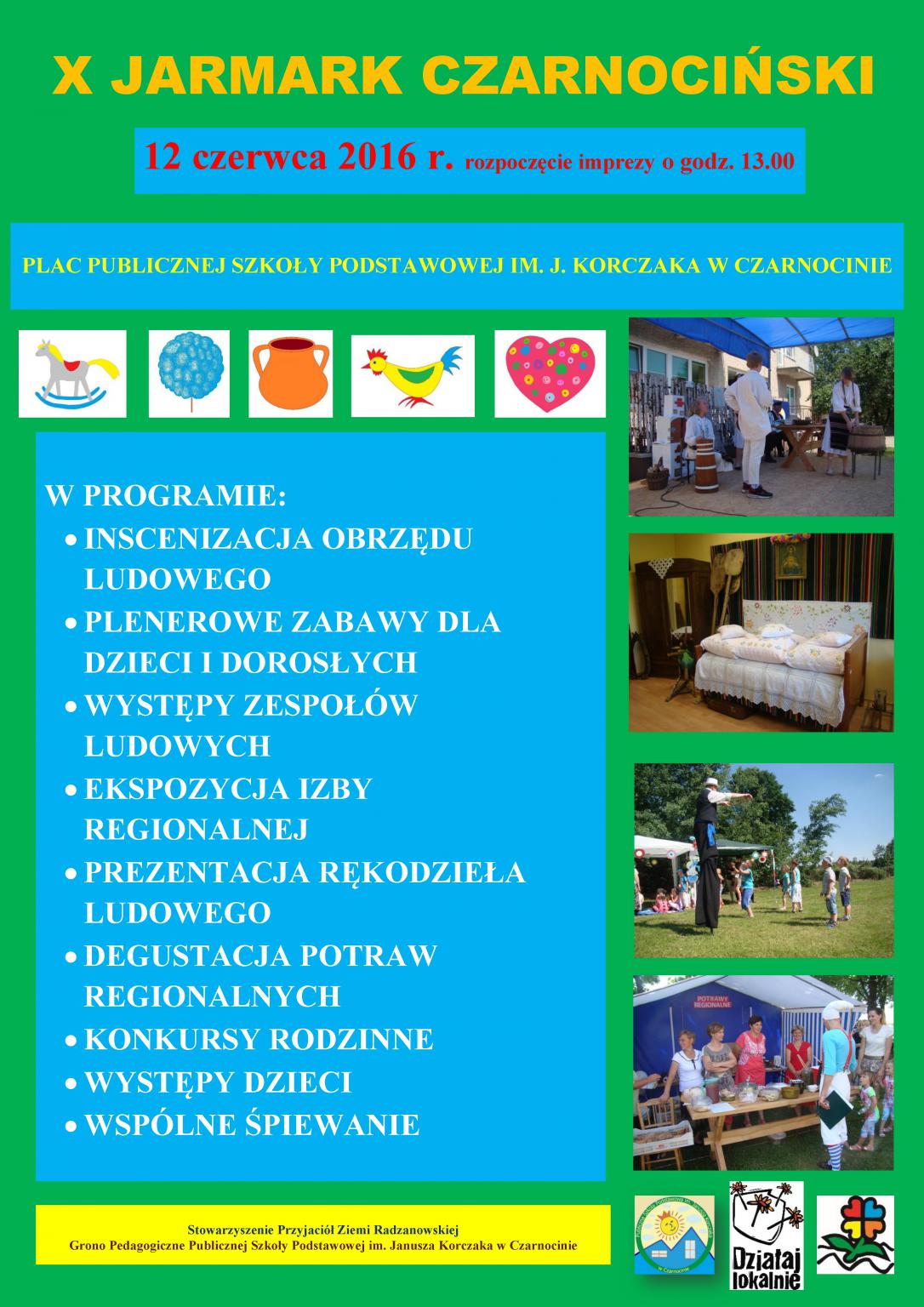 Występy uczniów i absolwentów szkoły, inscenizacja pt. „Ocalić od zapomnienia”, spektakl dla dzieci pt. „Witajcie w naszej bajce”, występ Kapeli Braci Tarnowskich z Domaniowa, wspólne śpiewanie, zabawy plenerowe dla dzieci i dorosłych, konkursy dla rodzin, balonowe kreacje dla każdego dziecka, pokaz olbrzymich baniek mydlanych, malowanie twarzy oraz cenne nagrody w loteryjce fantowej – takie atrakcje czekają na wszystkich, którzy przybędą w najbliższą niedzielę – 12 czerwca do Czarnocina (gmina Radzanów).
