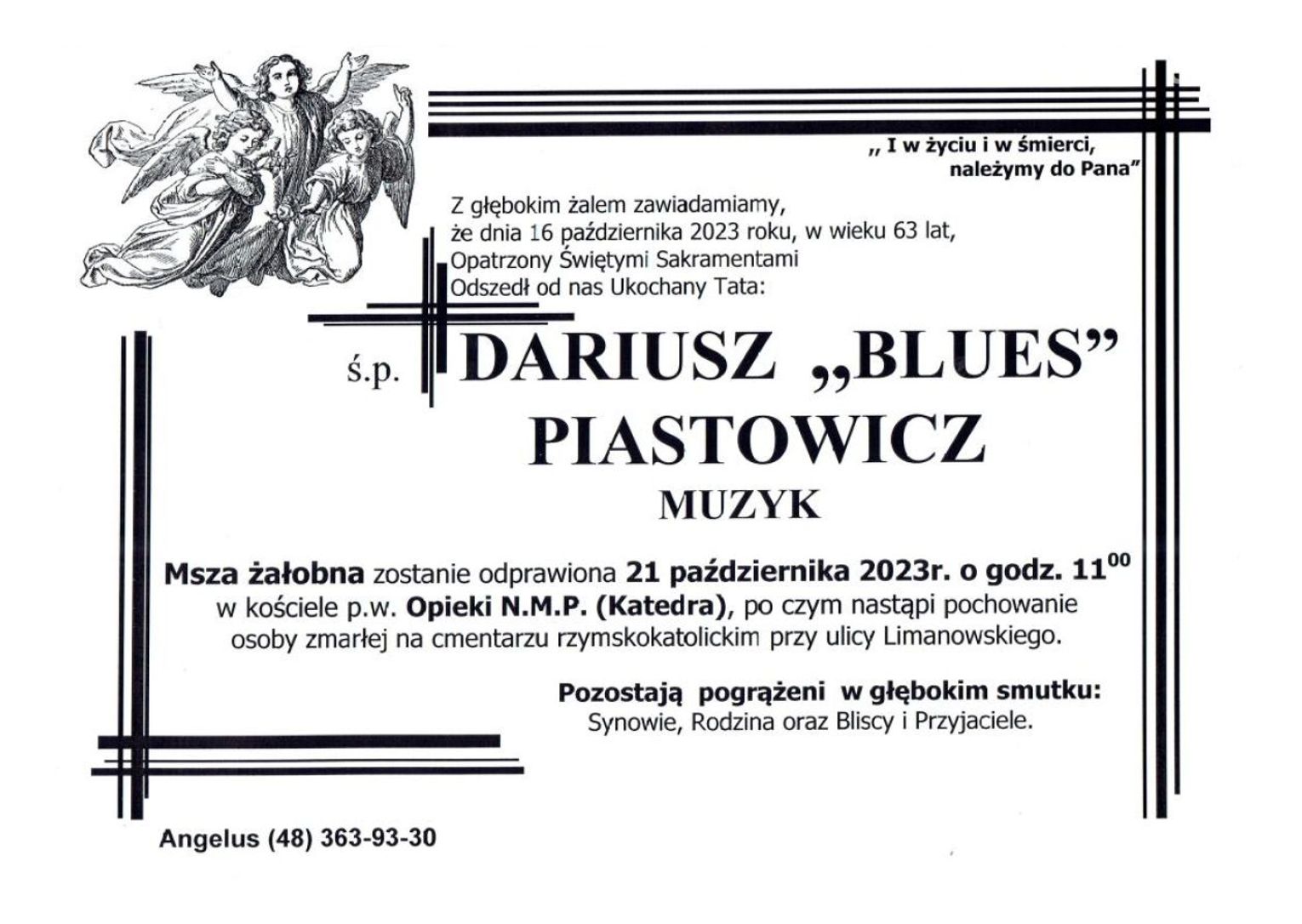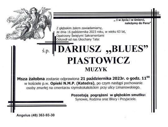 Dariusz "Blues" Piastowicz zmarł po długiej i ciężkiej chorobie. Miał 63 lata. Przez znajomych był określany mianem ojca radomskiego bluesa. Przez wiele lat pracował w radomskich instytucjach kultury. Był artystą i muzykiem.