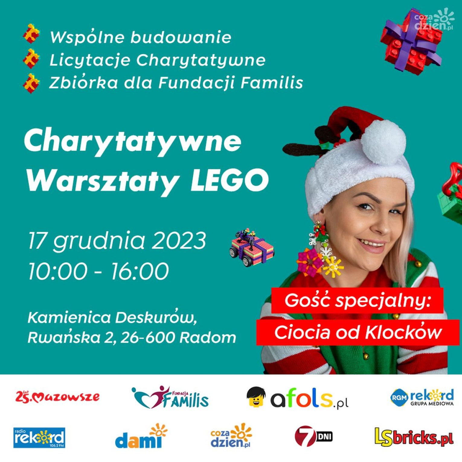 Charytatywne Warsztaty LEGO odbędą się w niedzielę, 17 grudnia od godz. 10 do 16 w Kamienicy Deskurów przy ul. Rwańskiej 2. Wstęp na wydarzenie oczywiście jest bezpłatny, a na wszystkich czekać będą setki tysięcy klocków do budowania, a także atrakcyjni goście. Zachęcamy do śledzenia wydarzenia na Facebooku, na którym na bieżąco będą pojawiać się informacje o przewidzianych atrakcjach - TUTAJ