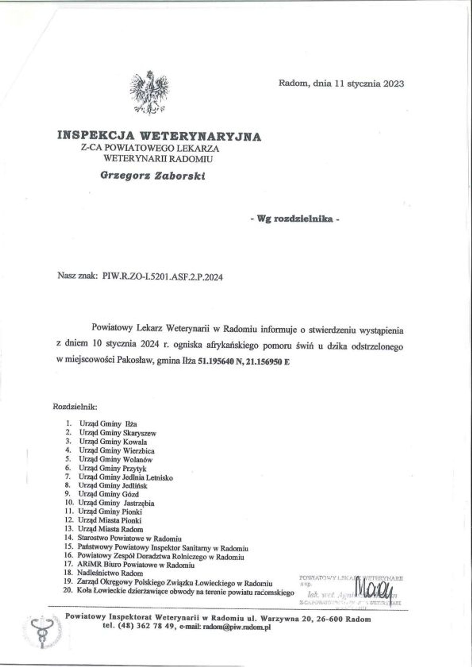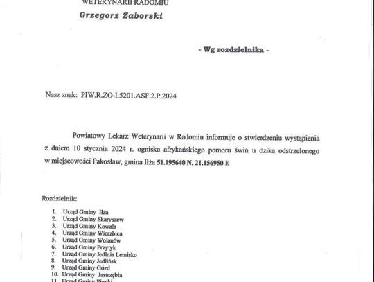 - Nie jest to bezpośrednie zagrożenie, jednak jest to dla nas takie ostrzeżenie, że w dalszym ciągu na tym terenie znajdują się jakieś ślady ASF. Jest to także przypomnienie dla rolników utrzymujących zwierzęta gospodarskie, że nadal muszą przestrzegać przepisów w zakresie bioasekuracji – tłumaczy Grzegorz Zaborski, Powiatowy Lekarz Weterynarii w Radomiu.