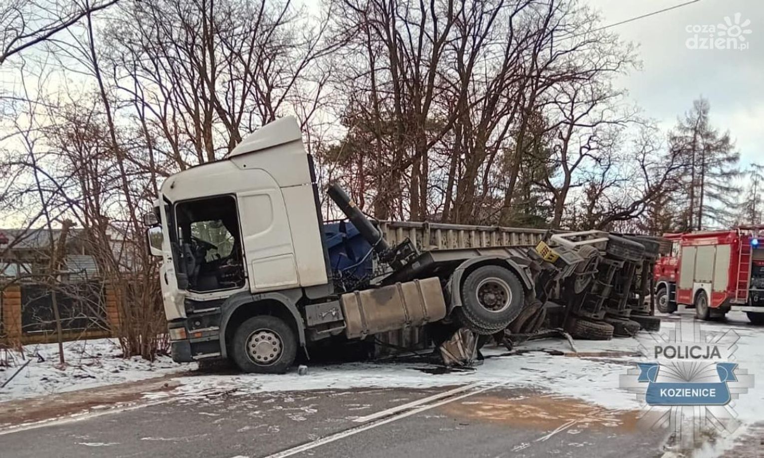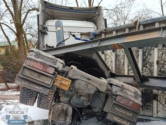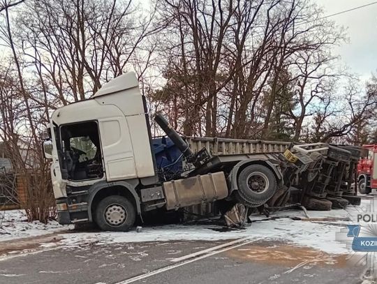 Na drodze krajowej 79 w miejscowości Grzybów (powiat kozienicki) kierujący pojazdem ciężarowym scania wraz z naczepą stracił panowanie nad pojazdem i zablokował drogę.
