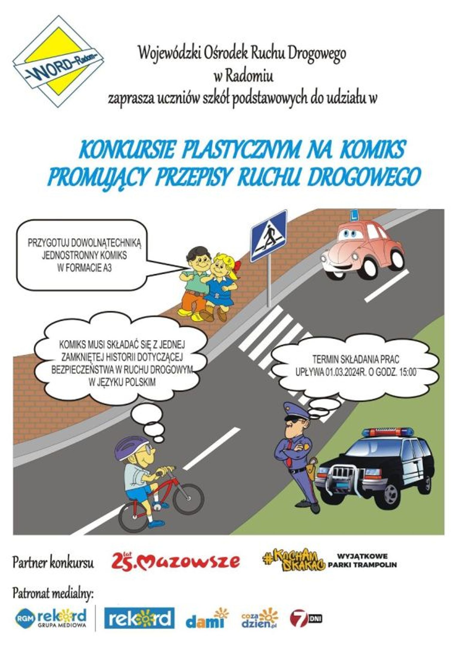 Równolegle można zgłaszać swoje prace w konkursie plastycznym, przewidzianym dla uczniów wszystkich uczniów szkół podstawowych z subregionu radomskiego. Podobnie jak poprzedni, będzie przebiegał dwuetapowo. Tym razem chętni poza wiedzą w zakresie brd muszą się również wykazać pomysłowością i kreatywnością, bo do wykonania jest komiks. Tutermin zgłaszania prac przez szkoły mija 01.03.2024 a szczegóły i regulamin znajdziecie tutaj: