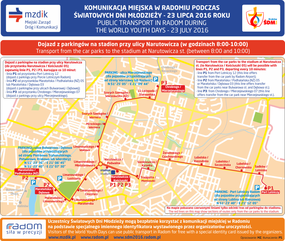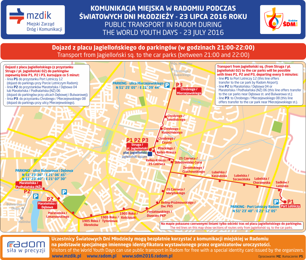 W godzinach około 12:00-14:00 i 16:00-18:00 będzie uruchomiona specjalna linia ŚDM, zapewniająca od godziny 12:00 dowóz uczestników uroczystości ze stadionu do Muzeum Wsi Radomskiej, a od 16:00 powrót do Śródmieścia.