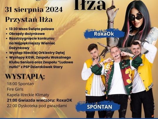 Dożynki rozpoczną się o godz. 13:30 od mszy świętej polowej na terenie Przystani w Iłży. Po niej odbędą się obrzędy dożynkowe, zostanie rozstrzygnięty konkurs na Najpiękniejszy Wieniec Dożynkowy. Przed publicznością zaprezentuje się Iłżecka Orkiestra Dęta, Koła Gospodyń Wiejskich, Zespół Wokalny Klubu Seniora oraz Zespół "Ludowe Nutki" z PSP w Dzierzkówku Starym.