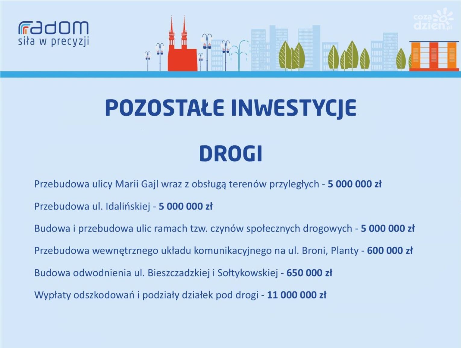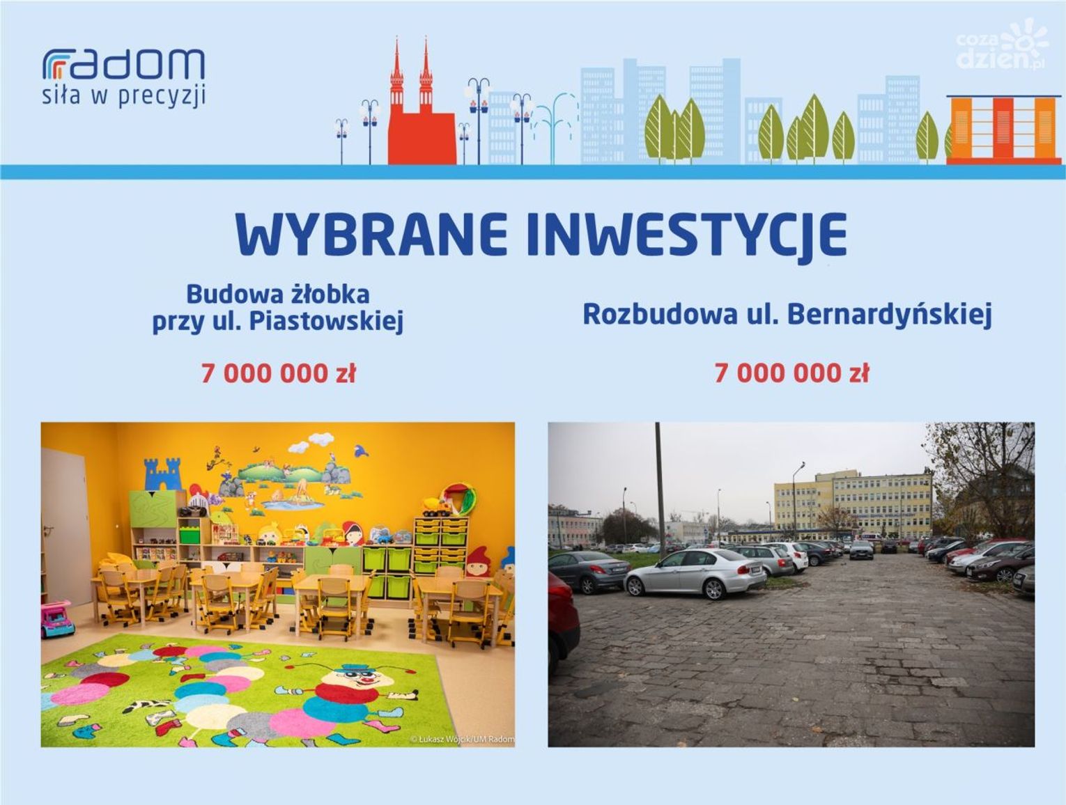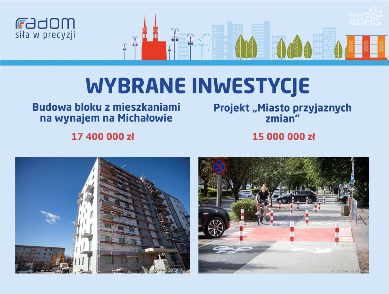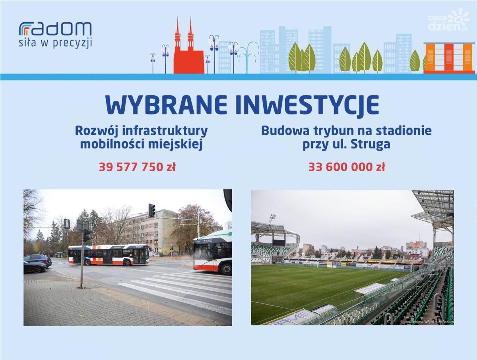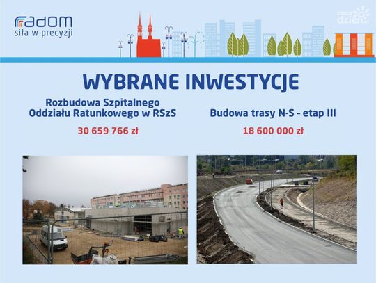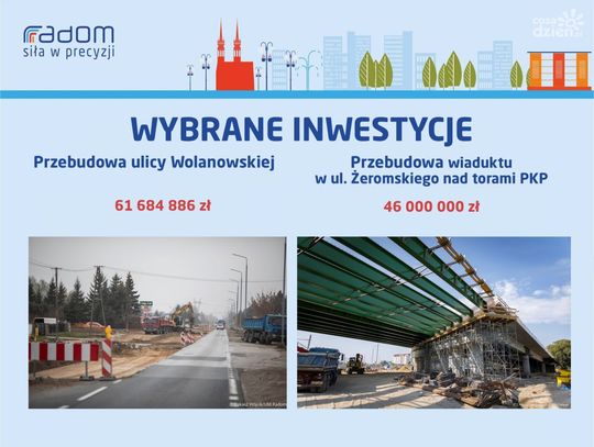 Rekordowy w przyszłym roku ma być budżet na inwestycje. To kwota ponad 415 mln zł. Największe inwestycje to przede wszystkim kontynuacja już rozpoczętych zadań. Mowa m.in. o przebudowie ulicy Wolanowskiej (61 mln zł), przebudowie wiaduktu w ul. Żeromskiego nad torami PKP (46 mln zł), budowie trybun na stadionie przy ul. Struga (33 mln), rozbudowie Szpitalnego Oddziału Ratunkowego w szpitalu na Tochtermana (30 mln zł) czy III etapie budowy trasy N-S (18 mln zł). Realizowany będzie też program Miasto Przyjaznych Zmian. To jednak nie koniec inwestycji związanych z infrastrukturą. - Tworzy się nowa strefa inwestycyjna w okolicy ul. Energetyków - na układ komunikacyjny i parking przeznaczymy pięć milionów złotych. Do tego przebudowa ul. Idalińskiej - również pięć milionów złotych, podobnie jak realizacja czynówek. Również inwestycja oczekiwana przez mieszkańców, czyli odwodnienie ul. Bieszczadzkiej i Sołtykowskiej - 650 tys. zł. To kwota na dokumentację i realizację w partnerstwie z Wodociągami Miejskimi. Planujemy także zakup nowych, niskoemisyjnych autobusów dla MPK - wymienia Katarzyna Kalinowska, wiceprezydent Radomia.