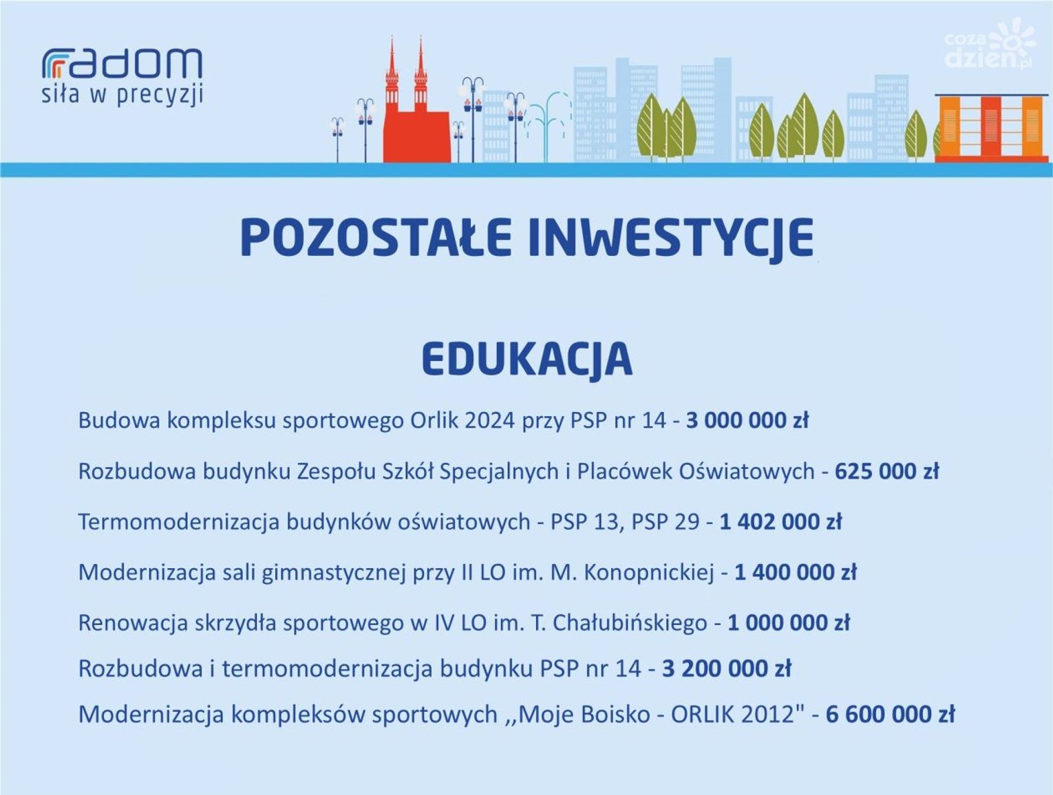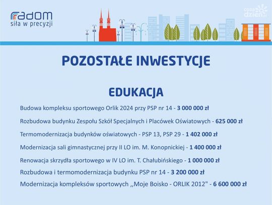 Wiele będzie się działo również w temacie oświaty. Przy PSP nr 14 powstanie Orlik, a pozostałe boiska z tego programu przejdą remont. W IV Liceum Ogólnokształcącym renowację przejdzie skrzydło sportowe. To jednak nie wszystko. - Kończymy rozbudowę Zespołu Szkół Specjalnych i Placówek Oświatowych przy ul. Lipskiej, termomodernizację PSP nr 13 i PSP nr 29, modernizację sali gimnastycznej przy LO im. Konopnickiej - mówi Kalinowska.