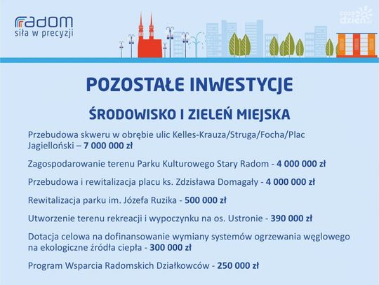 W zakresie kultury, miasto przeznaczy dwa miliony złotych na przebudowę sali koncertowej Radomskiej Orkiestry Kameralnej. Miasto inwestycje również w zadania związane ze środowiskiem i zielenią miejską. Najwięcej, bo siedem milionów złotych, ma zostać przeznaczone na przebudowę skweru w obrębie ulic Kelles-Krauza, Struga, Focha i Placu Jagiellońskiego. - Ten bardzo ważny z perspektywy wizerunku miasta teren będzie przez nas przebudowywany. W ocenie jest już wniosek, który złożyliśmy w ramach programu Feniks w Narodowym Funduszu Ochrony Środowiska i Gospodarki Wodnej - tłumaczy Łukasz Molenda, wiceprezydent Radomia.