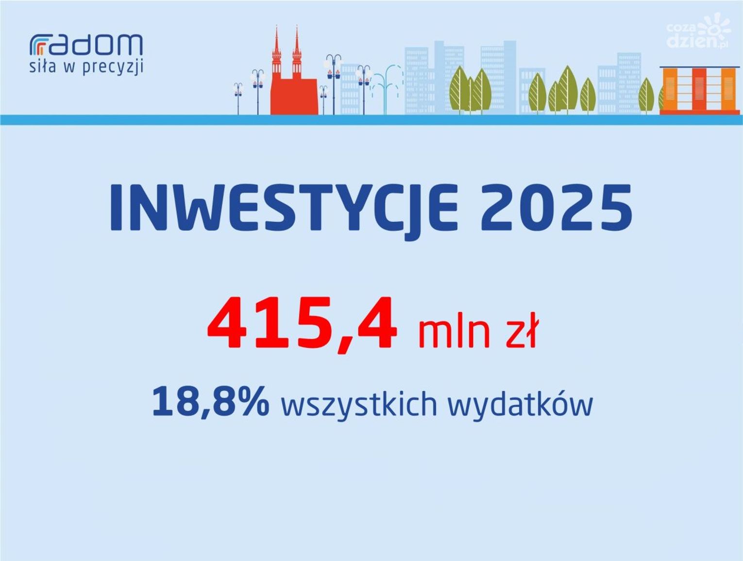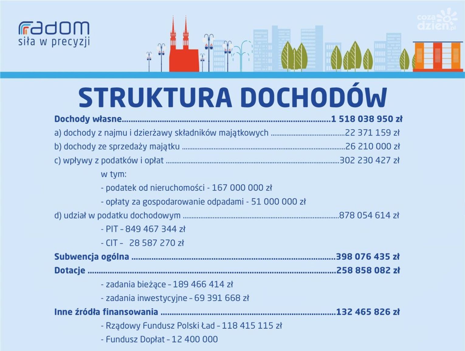 Zgodnie z zapisami ustawy, do 15 listopada samorządy mają obowiązek przedstawić radzie miejskiej projekt budżetu na przyszły rok. Tradycyjnie władze Radomia założenia przyszłorocznego budżetu przedstawiły na konferencji prasowej. Prezydent Radosław Witkowski określił ten projekt mianem "budżetu wielkich zmian". - Pierwsza wielka zmiana dotyka dochodów. Planujemy je na kwotę ponad 2 miliardów złotych. To wzrost o 524 mln zł. Kwestia wydatków - tu również rekord, bo przekraczają one 2 mld 200 mln zł. Poruszamy się już w wielkich wartościach i stąd określenie, że budżet na przyszły rok to budżet wielkich zmian - mówi Radosław Witkowski, prezydent Radomia.