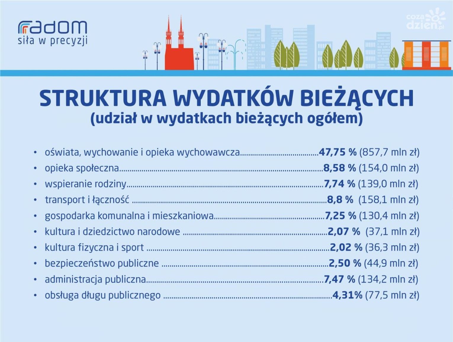 Jeśli chodzi o strukturę wydatków bieżących, najwięcej pieniędzy - blisko 860 mln zł - pochłonie oświata, wychowanie i opieka wychowawcza. To blisko 48 procent całego budżetu. Kolejne punkty to transport i łączność (158 mln zł), opieka społeczna (154 mln zł), wspieranie rodziny (139 mln zł) oraz gospodarka komunalna i mieszkaniowa (130 mln zł).