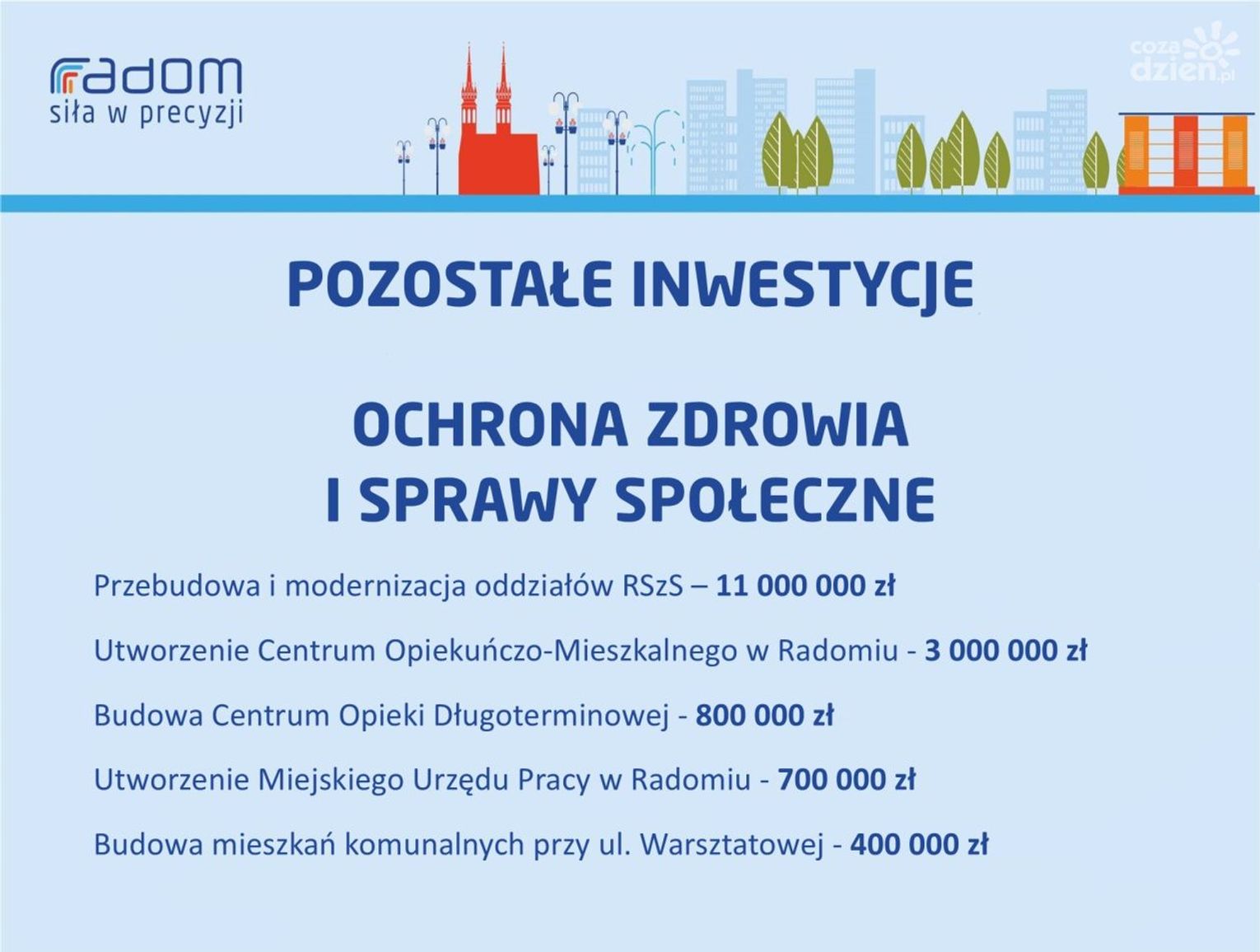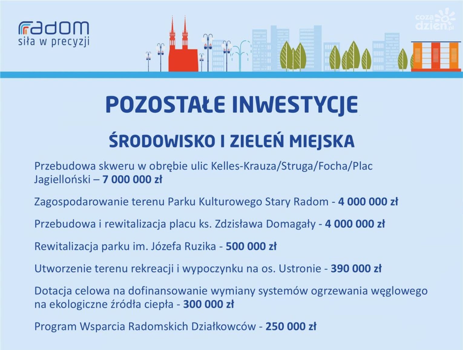 Przebudowę i rewitalizację ma też przejść plac ks. Zdzisława Domagały, a także park im. Józefa Ruzika. Zagospodarowany ma zostać teren Parku Kulturowego Stary Radom. Wsparcie mają otrzymać radomscy działkowcy, a także mieszkańcy kamienic. - Do tej pory jest wiele programów rządowych, jeśli chodzi o wymianę pieców, ale żaden z nich nie jest skierowany do mieszkańców kamienic. Chcemy pochylić się nad tym problemem, tak, aby w centrum naszego miasta można było oddychać pełną piersią - zapewnia Molenda.