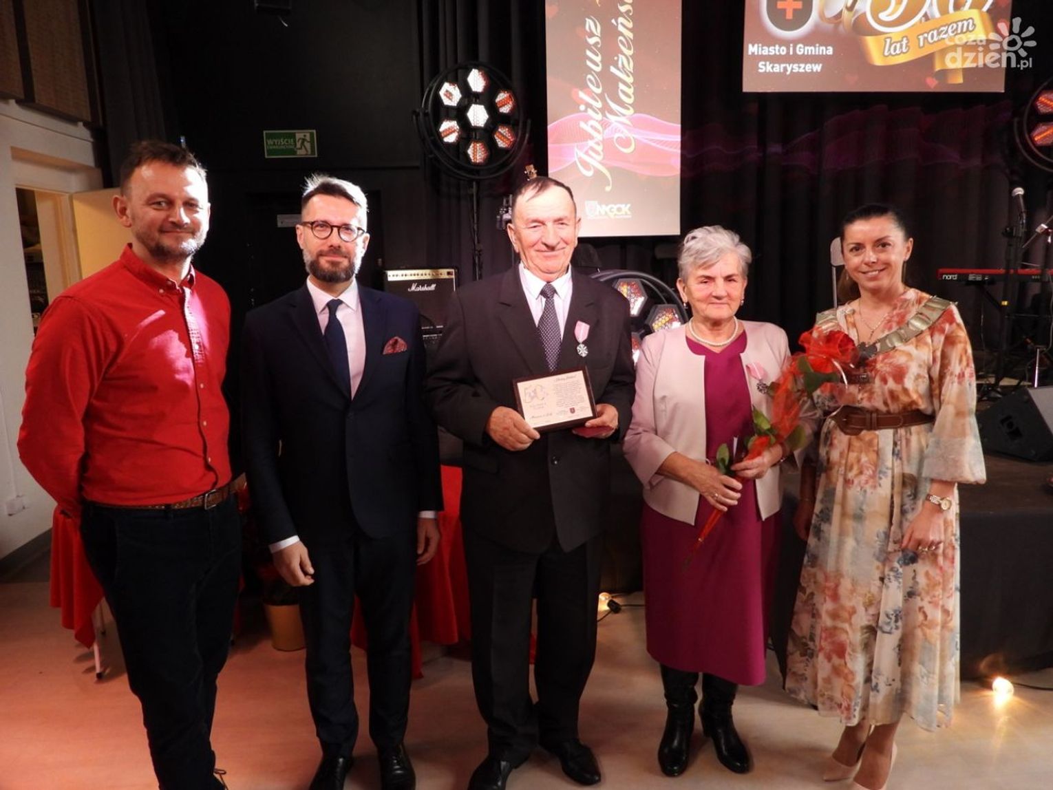 W uroczystości udział wzięli m. in. Burmistrz Miasta i Gminy Skaryszew Pani Justyna Grys, Przewodniczący Rady Miejskiej w Skaryszewie Pan Grzegorz Adamus, dyrektor Miejsko-Gminnego Ośrodka Kultury w Skaryszewie Daniela Rogali oraz Poseł na Sejm RP Pan Radosław Fogiel, którzy osobiście złożyli gratulacje parom obchodzącym jubileusz 50-lecia wspólnego życia.