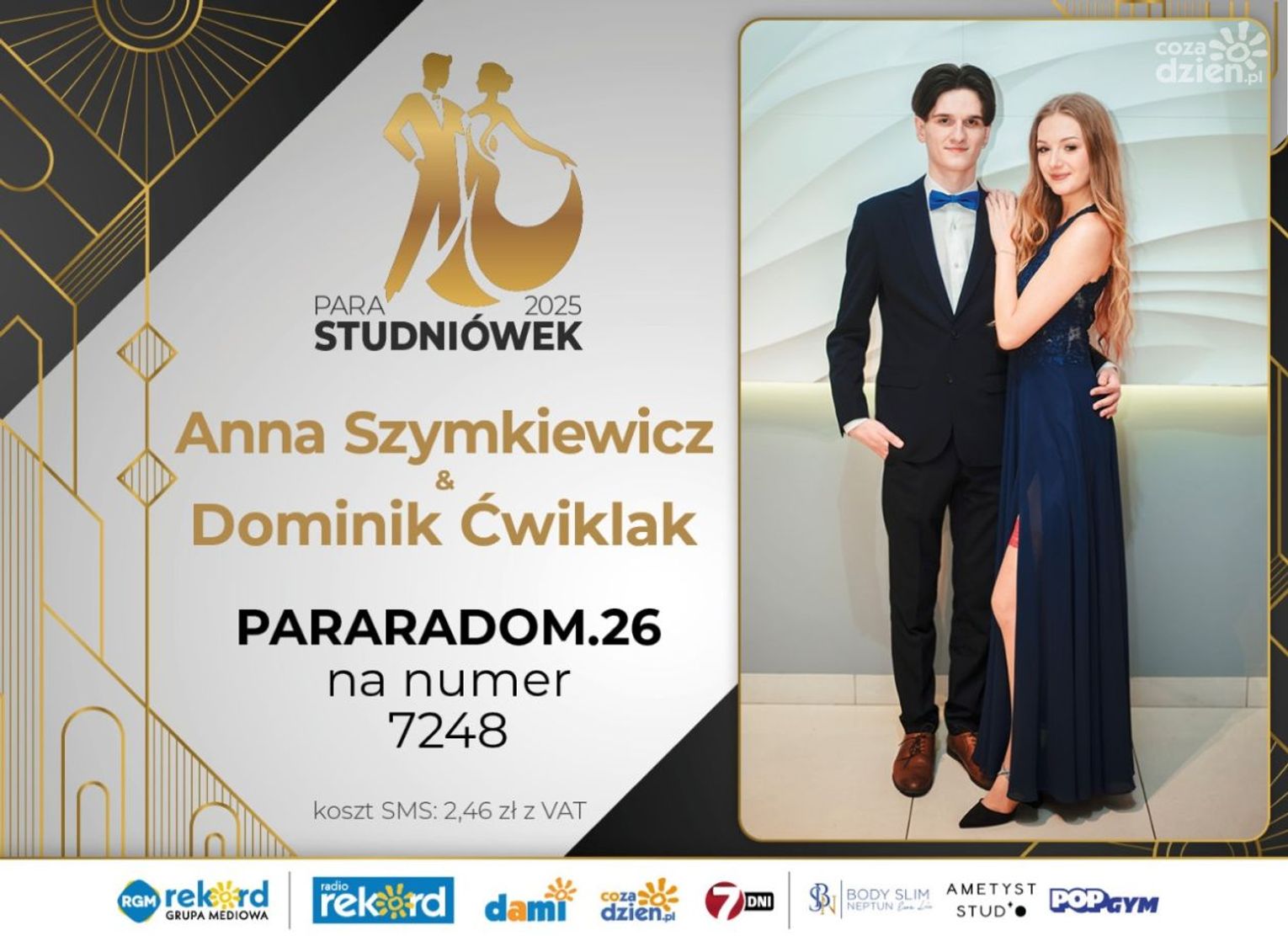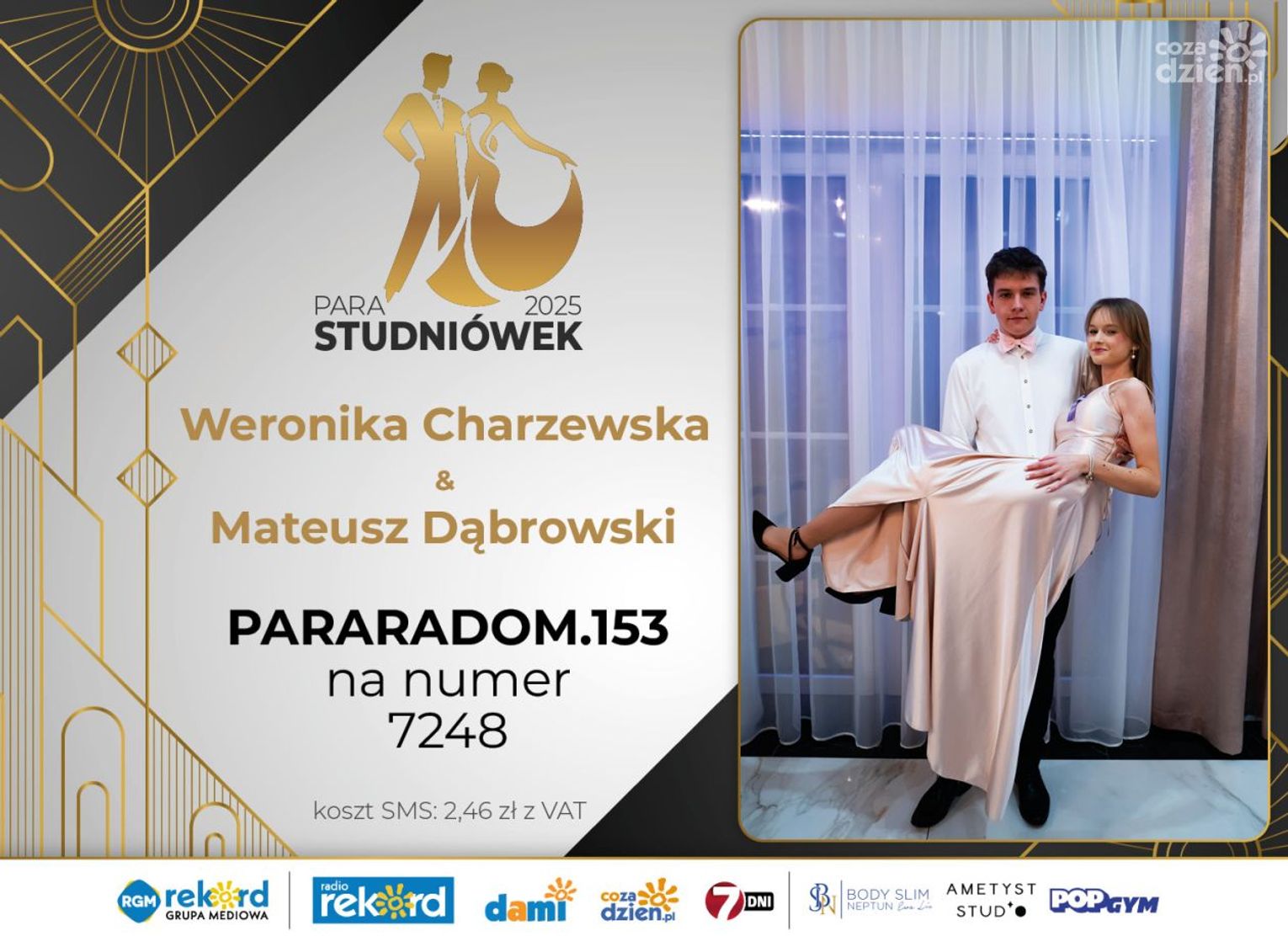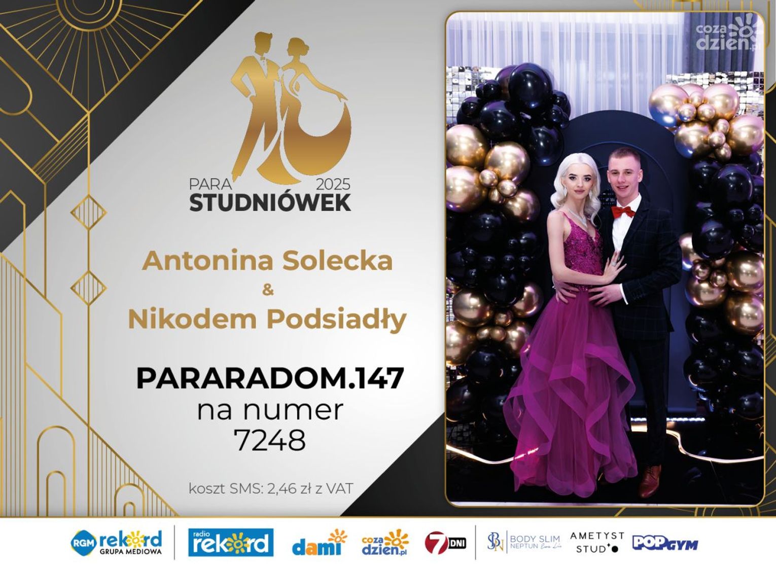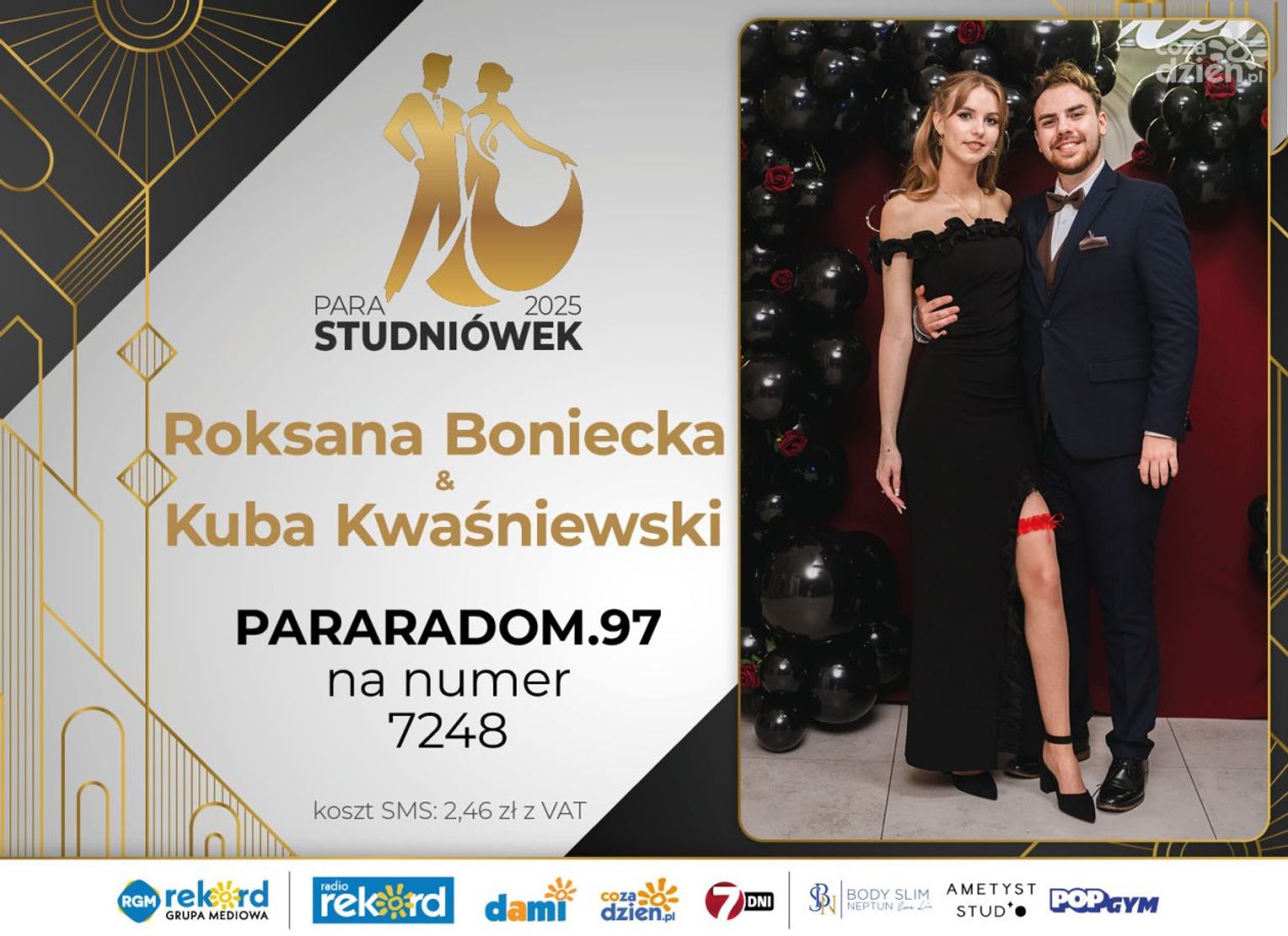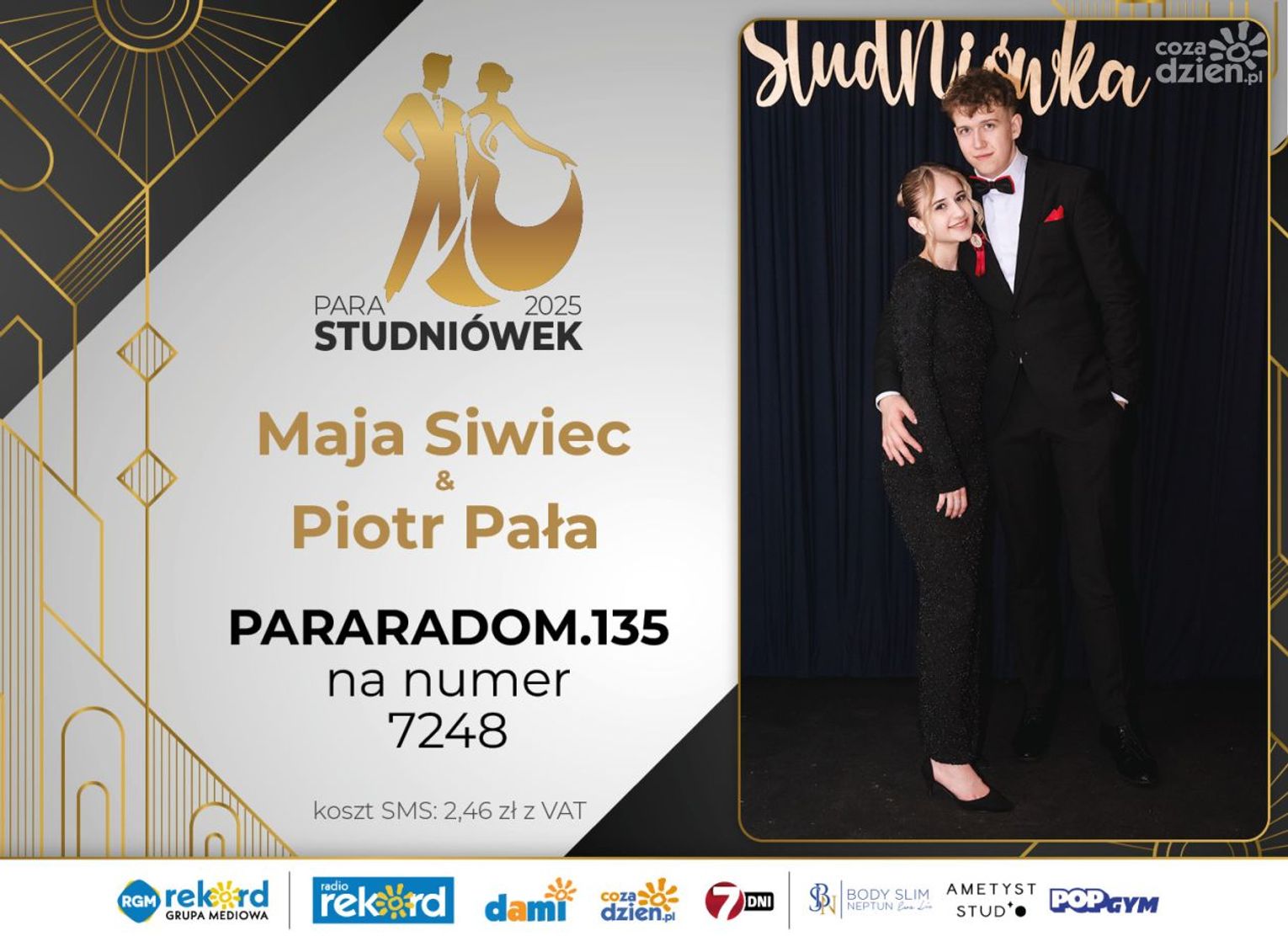 Wybór najpiękniejszej Pary Studniówek 2025 będzie przebiegał dwuetapowo. Pierwszym etapem plebiscytu będzie głosowanie za pomocą SMS-ów. Koszt jednej wiadomości SMS to 2zł + VAT. SMS wysyłamy na numer 7248. W treści SMS-a należy wpisać odpowiednio „PARARADOM” a za nim, po kropce przypisany numer, np. PARARADOM.1 Głosowanie rusza od 8 stycznia 2025 roku. Wyniki będzie można sprawdzać na bieżąco na portalu CoZaDzien.pl