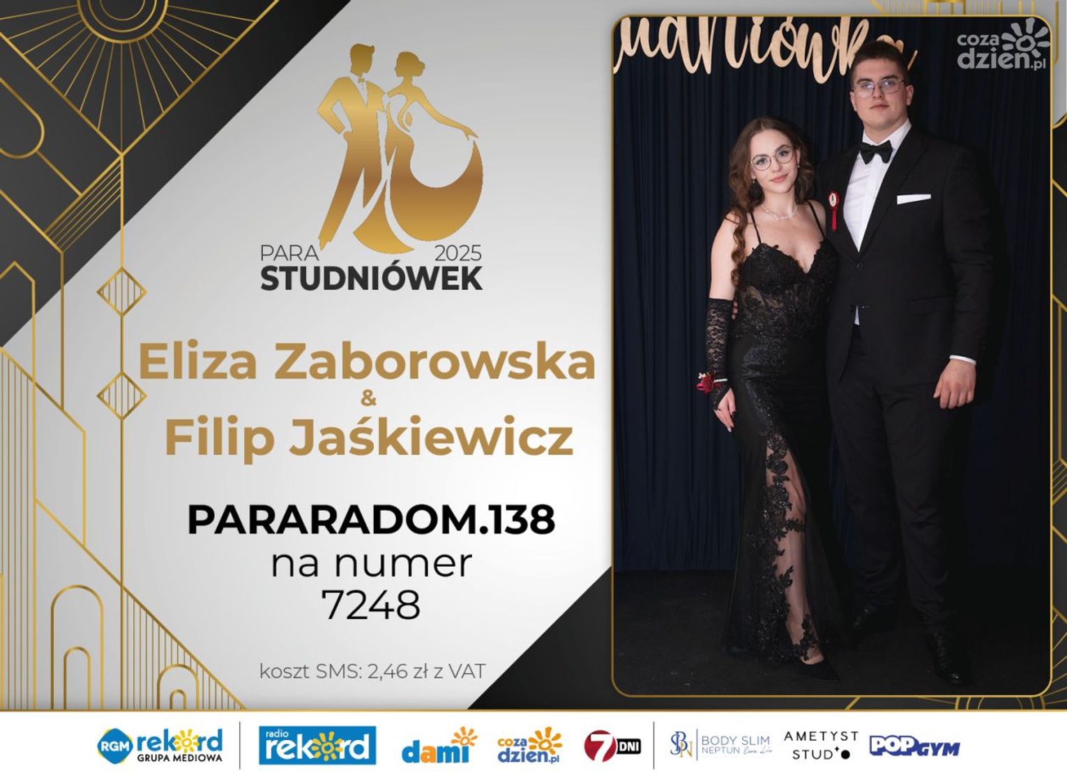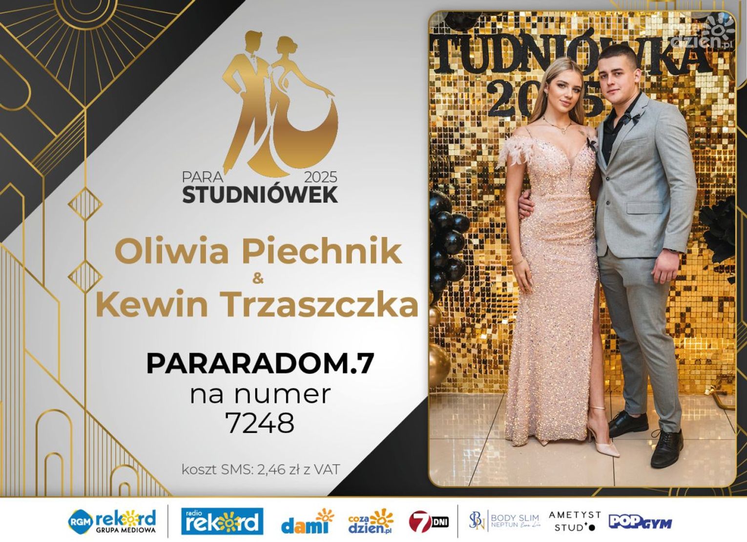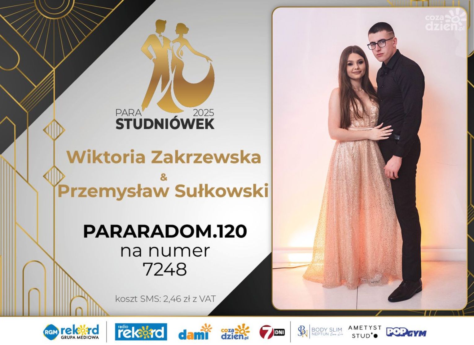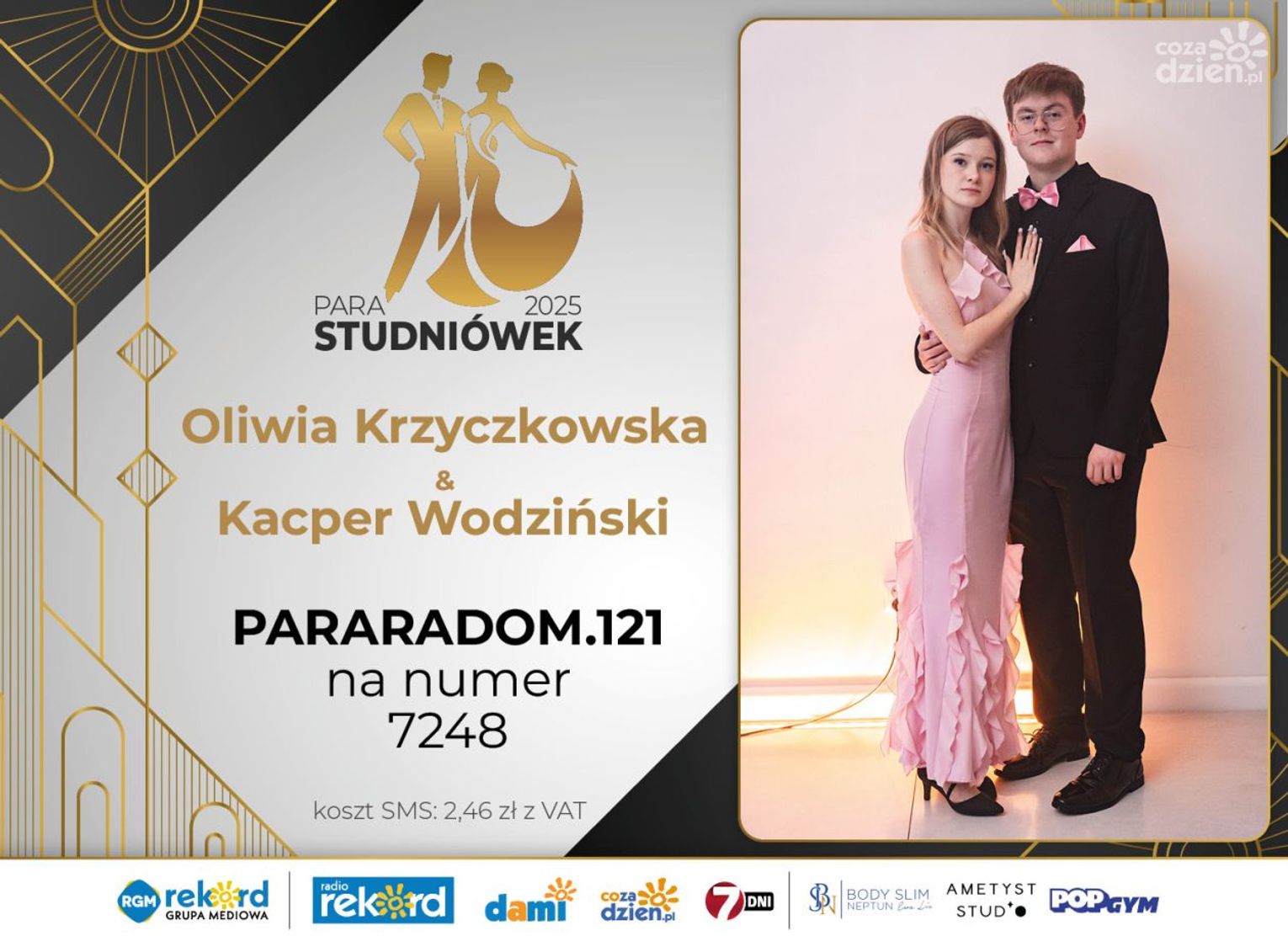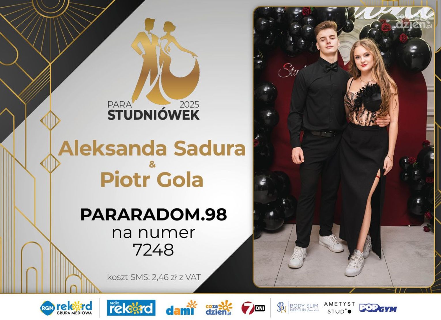 Wybór najpiękniejszej Pary Studniówek 2025 będzie przebiegał dwuetapowo. Pierwszym etapem plebiscytu będzie głosowanie za pomocą SMS-ów. Koszt jednej wiadomości SMS to 2zł + VAT. SMS wysyłamy na numer 7248. W treści SMS-a należy wpisać odpowiednio „PARARADOM” a za nim, po kropce przypisany numer, np. PARARADOM.1 Głosowanie rusza od 8 stycznia 2025 roku. Wyniki będzie można sprawdzać na bieżąco na portalu CoZaDzien.pl