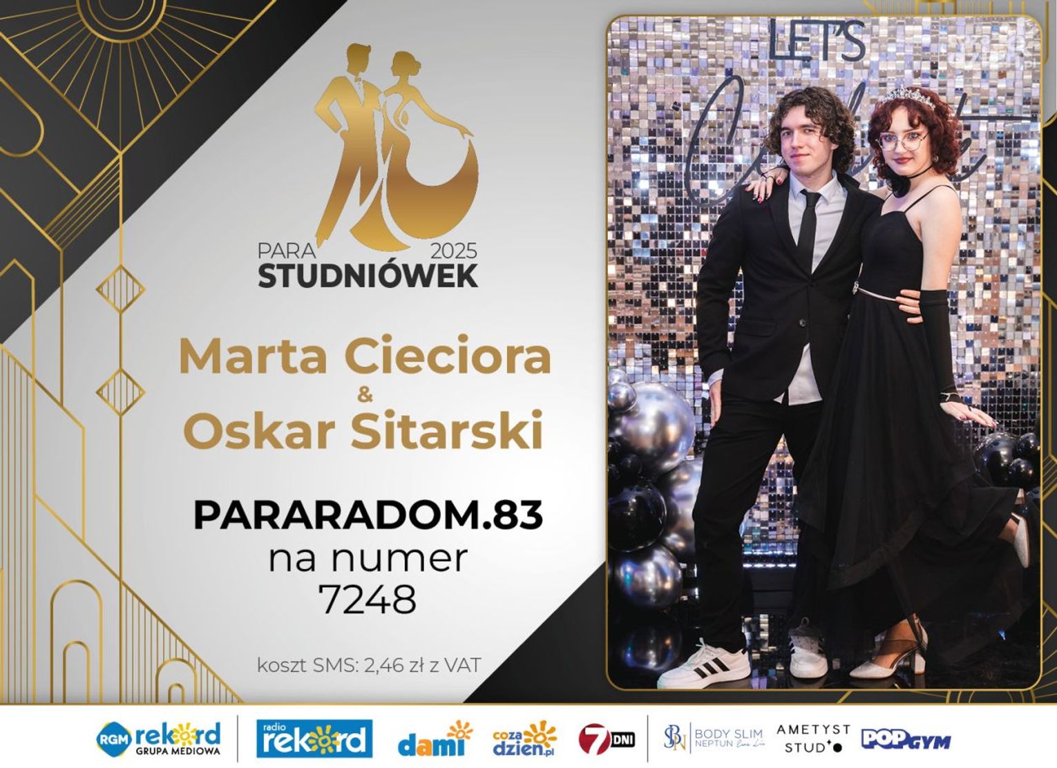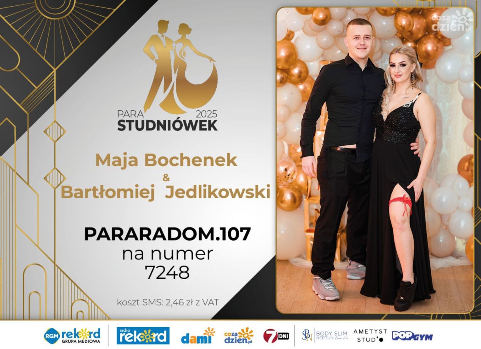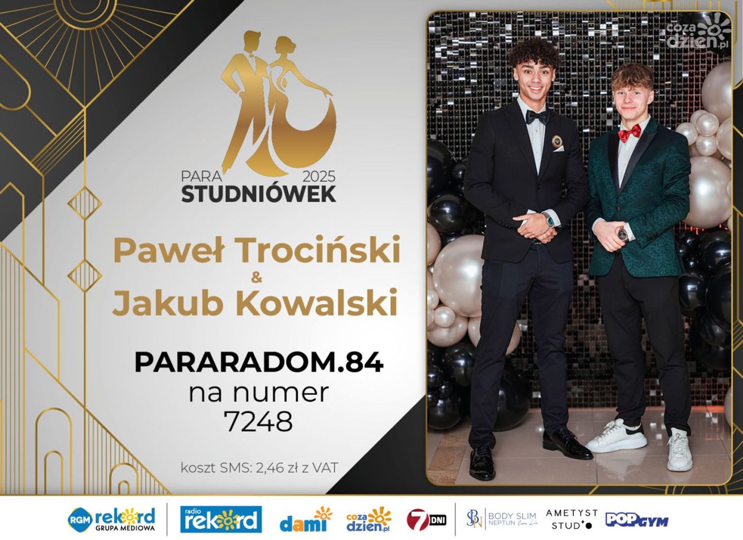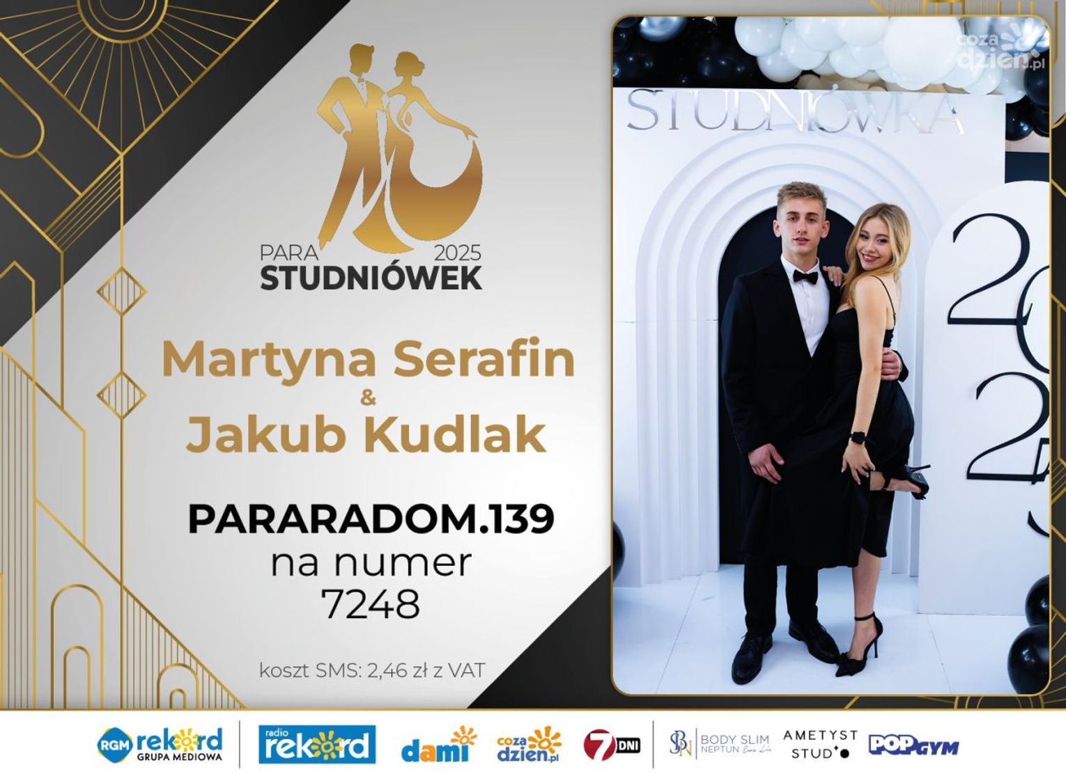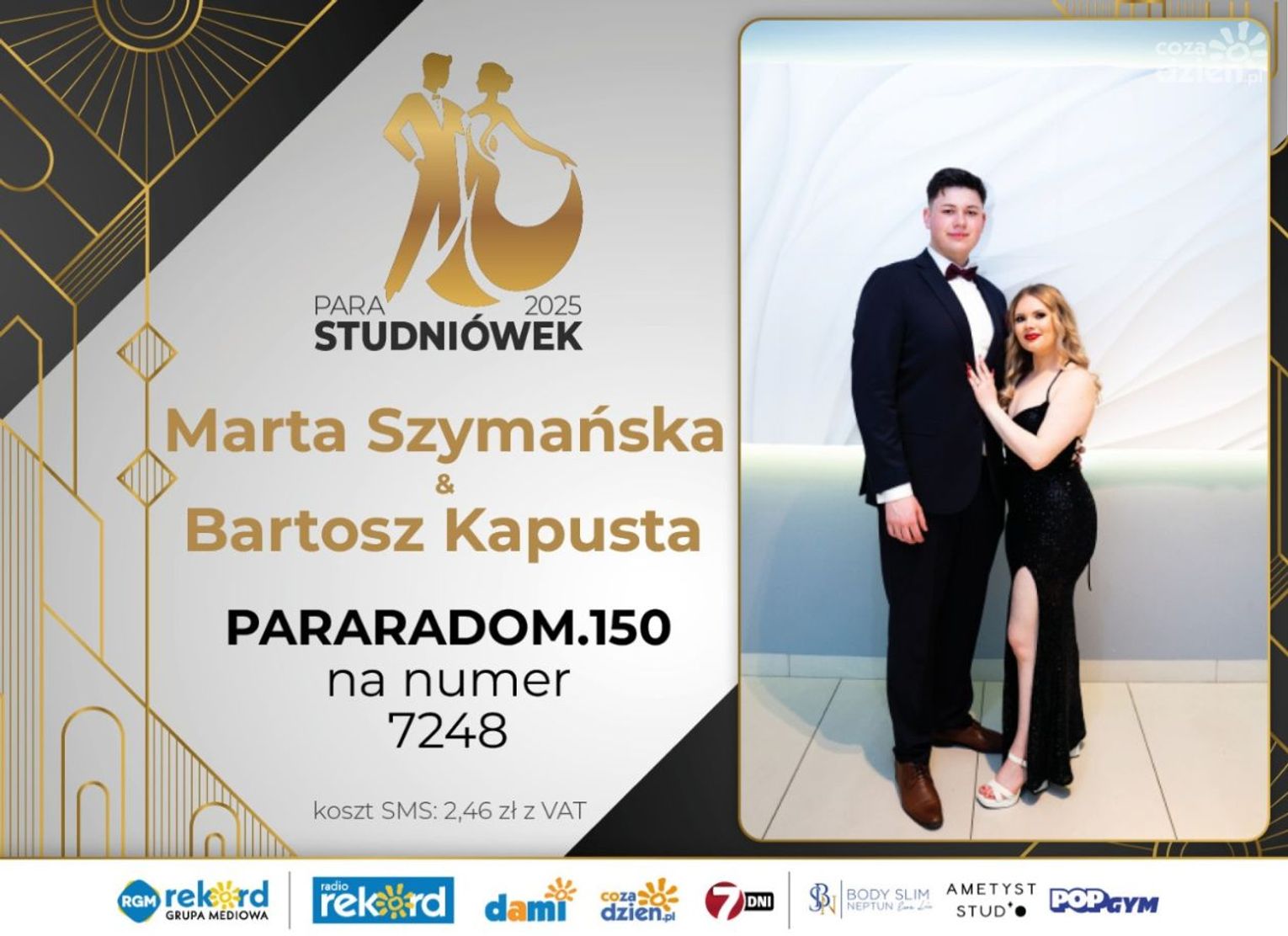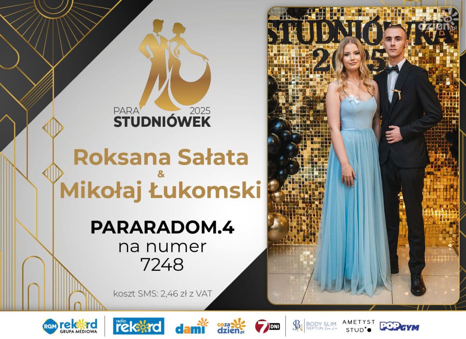 Wybór najpiękniejszej Pary Studniówek 2025 będzie przebiegał dwuetapowo. Pierwszym etapem plebiscytu będzie głosowanie za pomocą SMS-ów. Koszt jednej wiadomości SMS to 2zł + VAT. SMS wysyłamy na numer 7248. W treści SMS-a należy wpisać odpowiednio „PARARADOM” a za nim, po kropce przypisany numer, np. PARARADOM.1 Głosowanie rusza od 8 stycznia 2025 roku. Wyniki będzie można sprawdzać na bieżąco na portalu CoZaDzien.pl