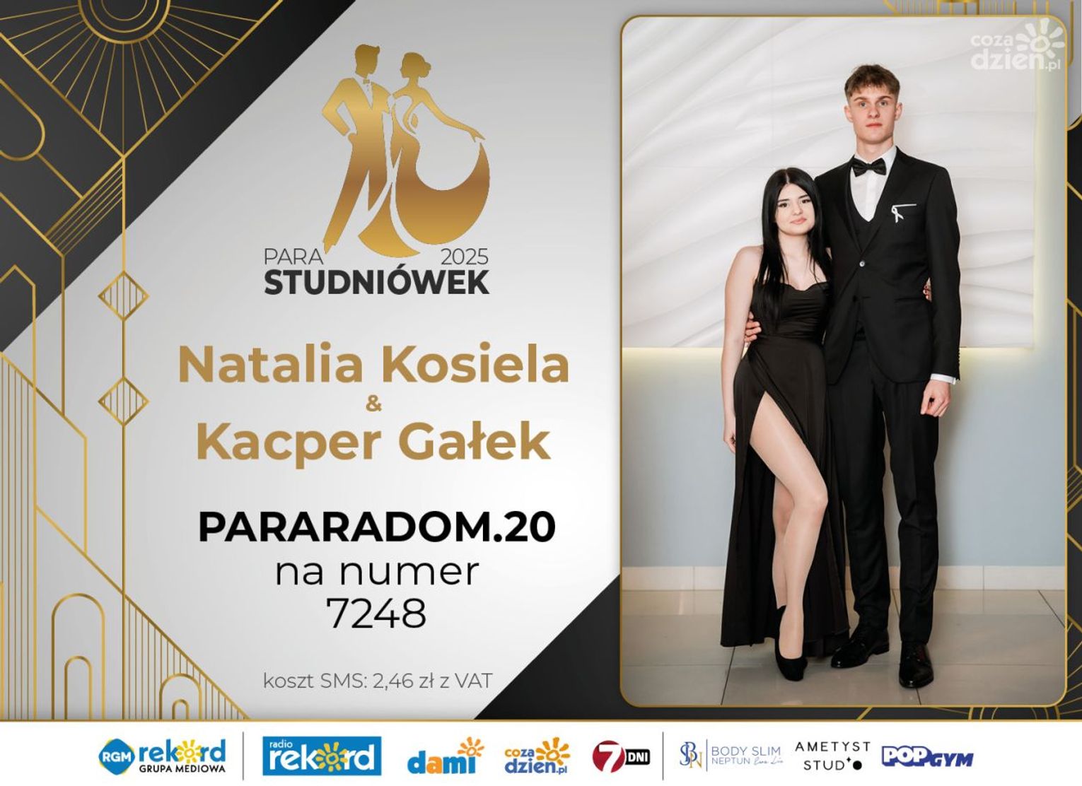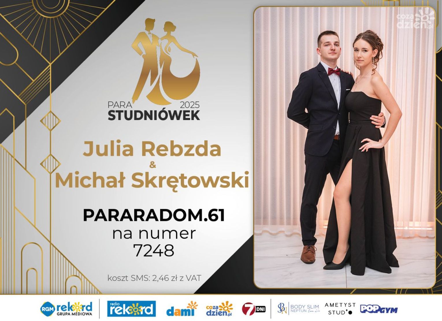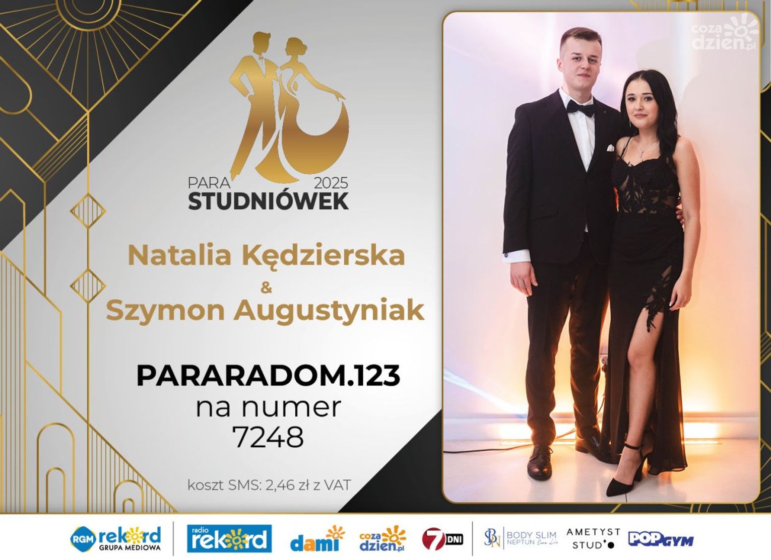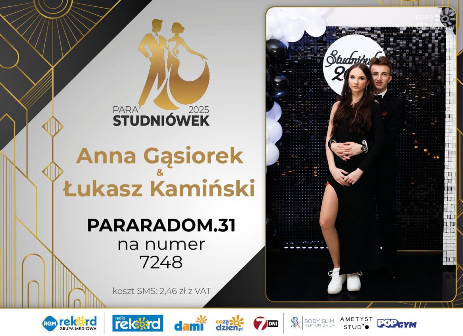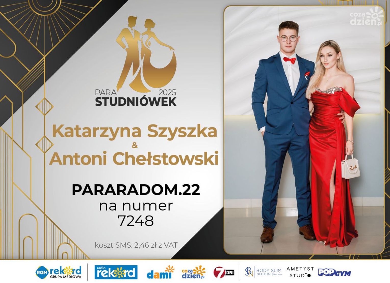 Wybór najpiękniejszej Pary Studniówek 2025 będzie przebiegał dwuetapowo. Pierwszym etapem plebiscytu będzie głosowanie za pomocą SMS-ów. Koszt jednej wiadomości SMS to 2zł + VAT. SMS wysyłamy na numer 7248. W treści SMS-a należy wpisać odpowiednio „PARARADOM” a za nim, po kropce przypisany numer, np. PARARADOM.1 Głosowanie rusza od 8 stycznia 2025 roku. Wyniki będzie można sprawdzać na bieżąco na portalu CoZaDzien.pl