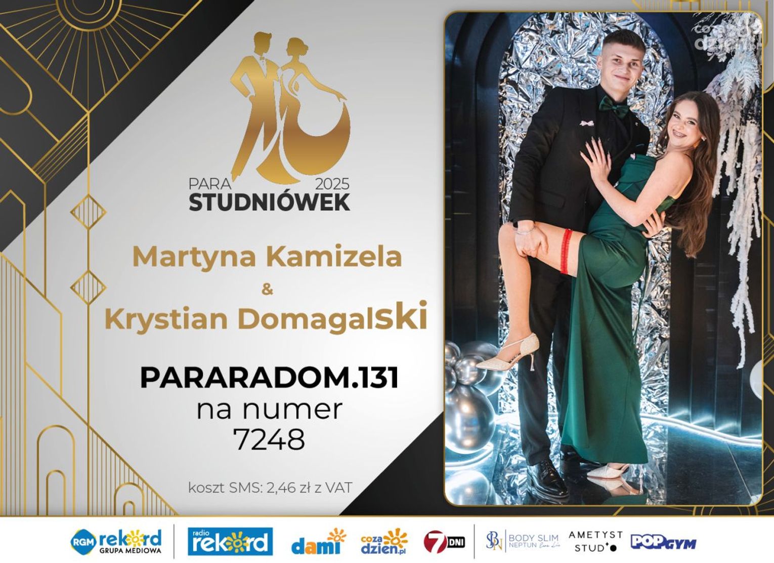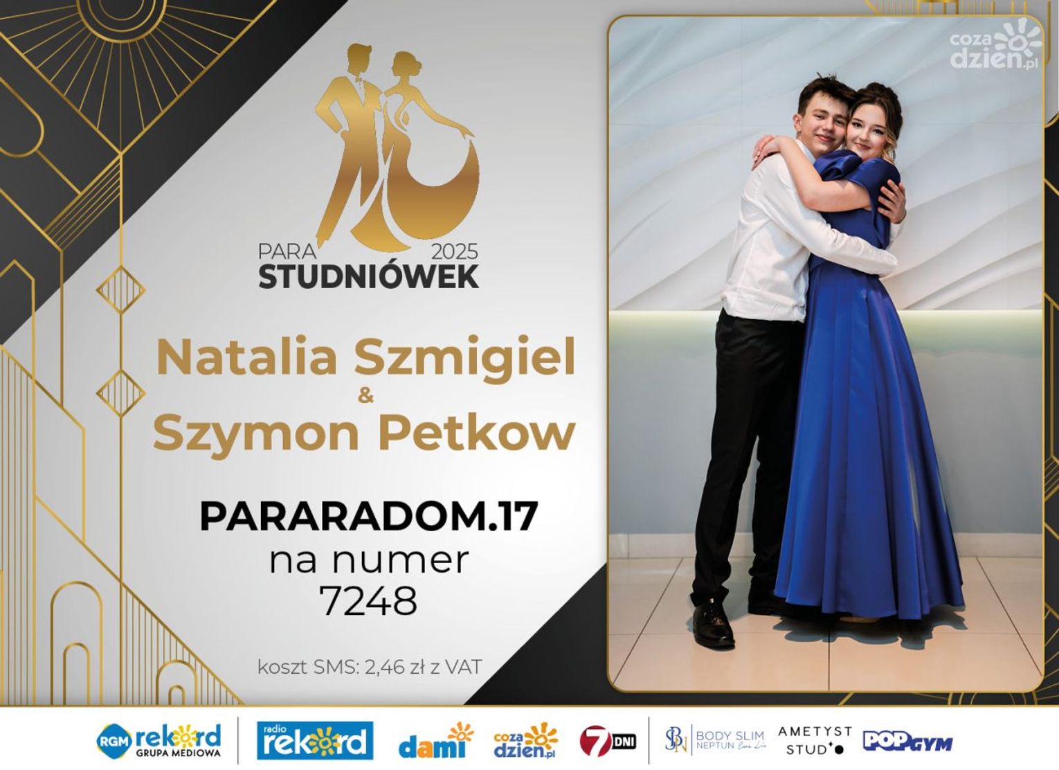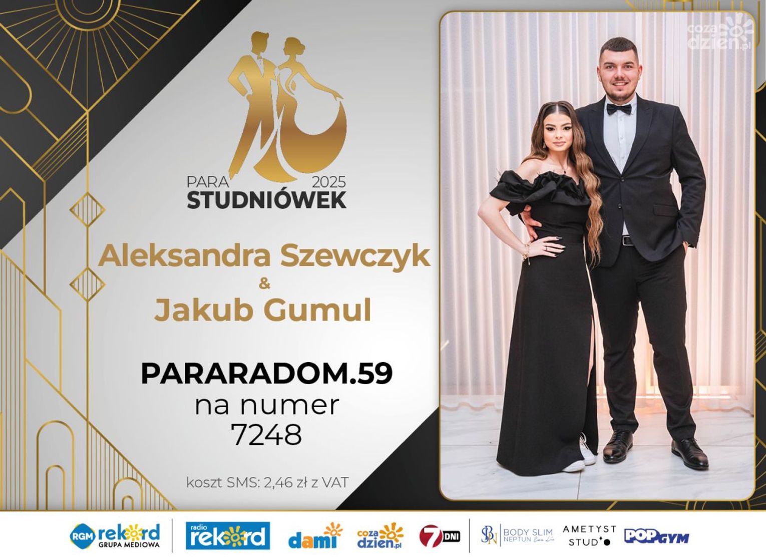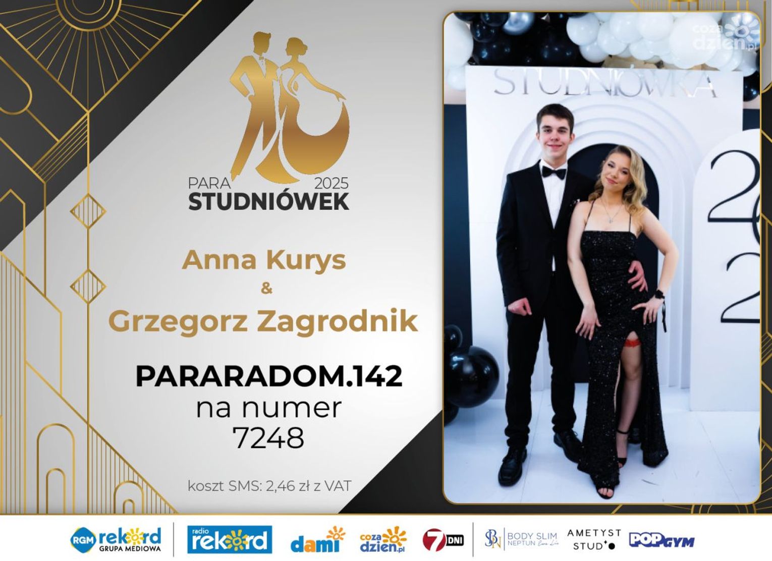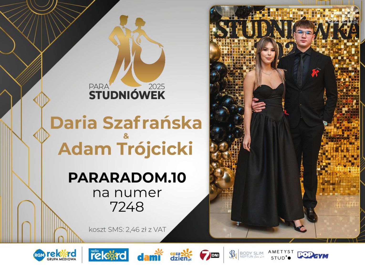 Wybór najpiękniejszej Pary Studniówek 2025 będzie przebiegał dwuetapowo. Pierwszym etapem plebiscytu będzie głosowanie za pomocą SMS-ów. Koszt jednej wiadomości SMS to 2zł + VAT. SMS wysyłamy na numer 7248. W treści SMS-a należy wpisać odpowiednio „PARARADOM” a za nim, po kropce przypisany numer, np. PARARADOM.1 Głosowanie rusza od 8 stycznia 2025 roku. Wyniki będzie można sprawdzać na bieżąco na portalu CoZaDzien.pl