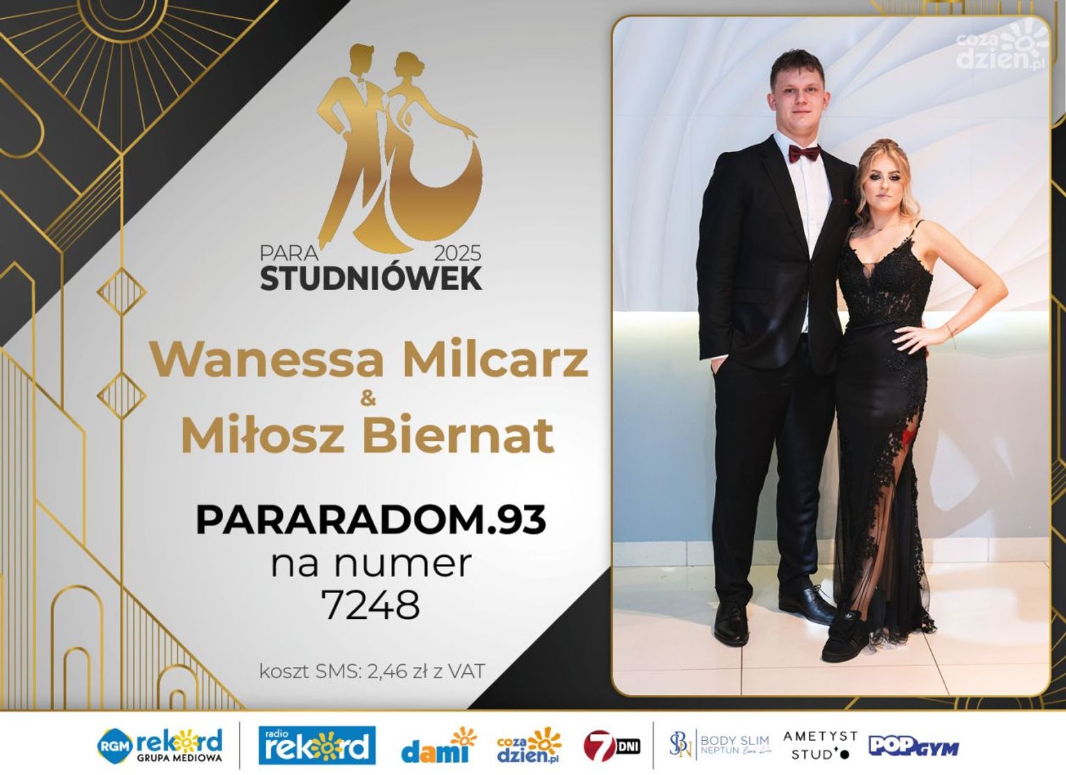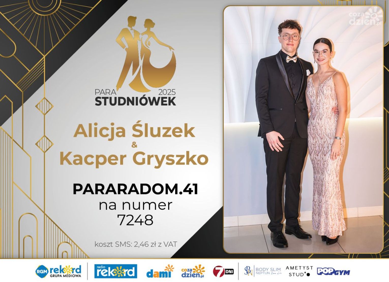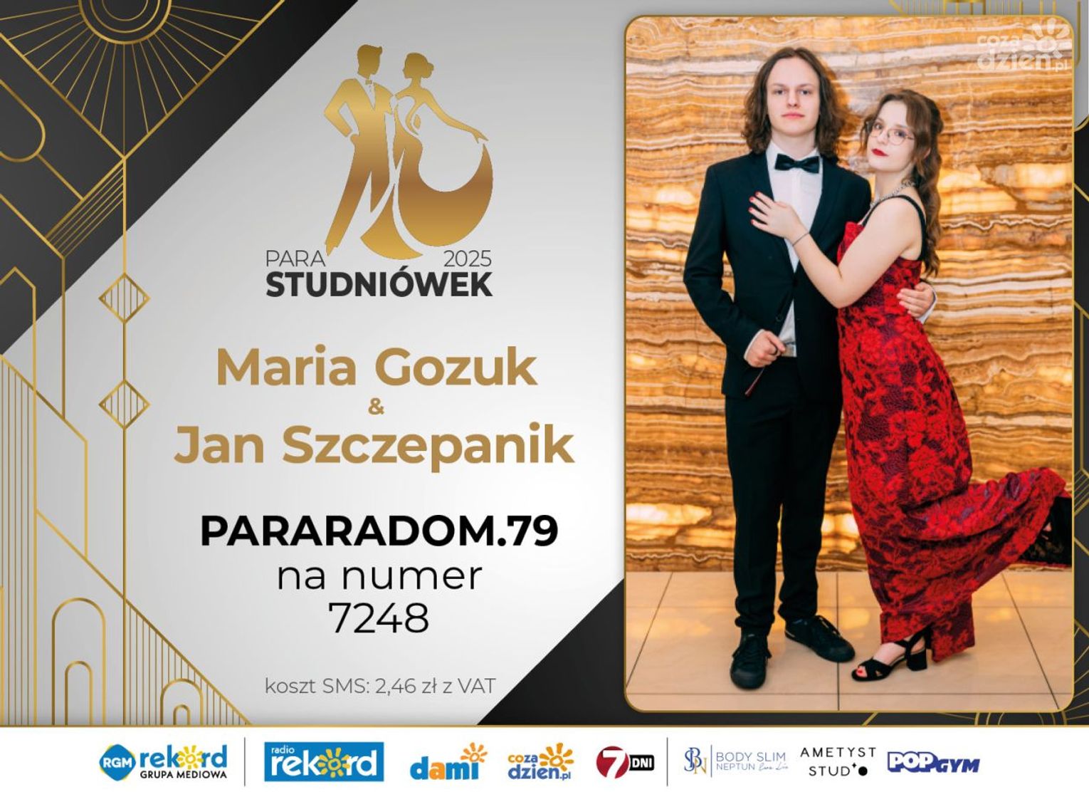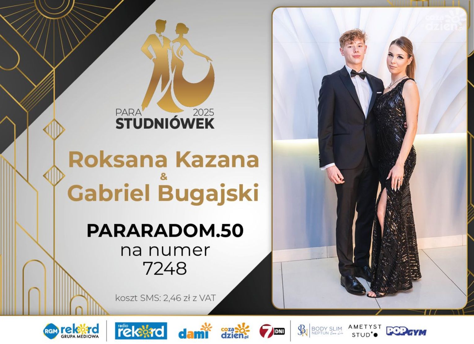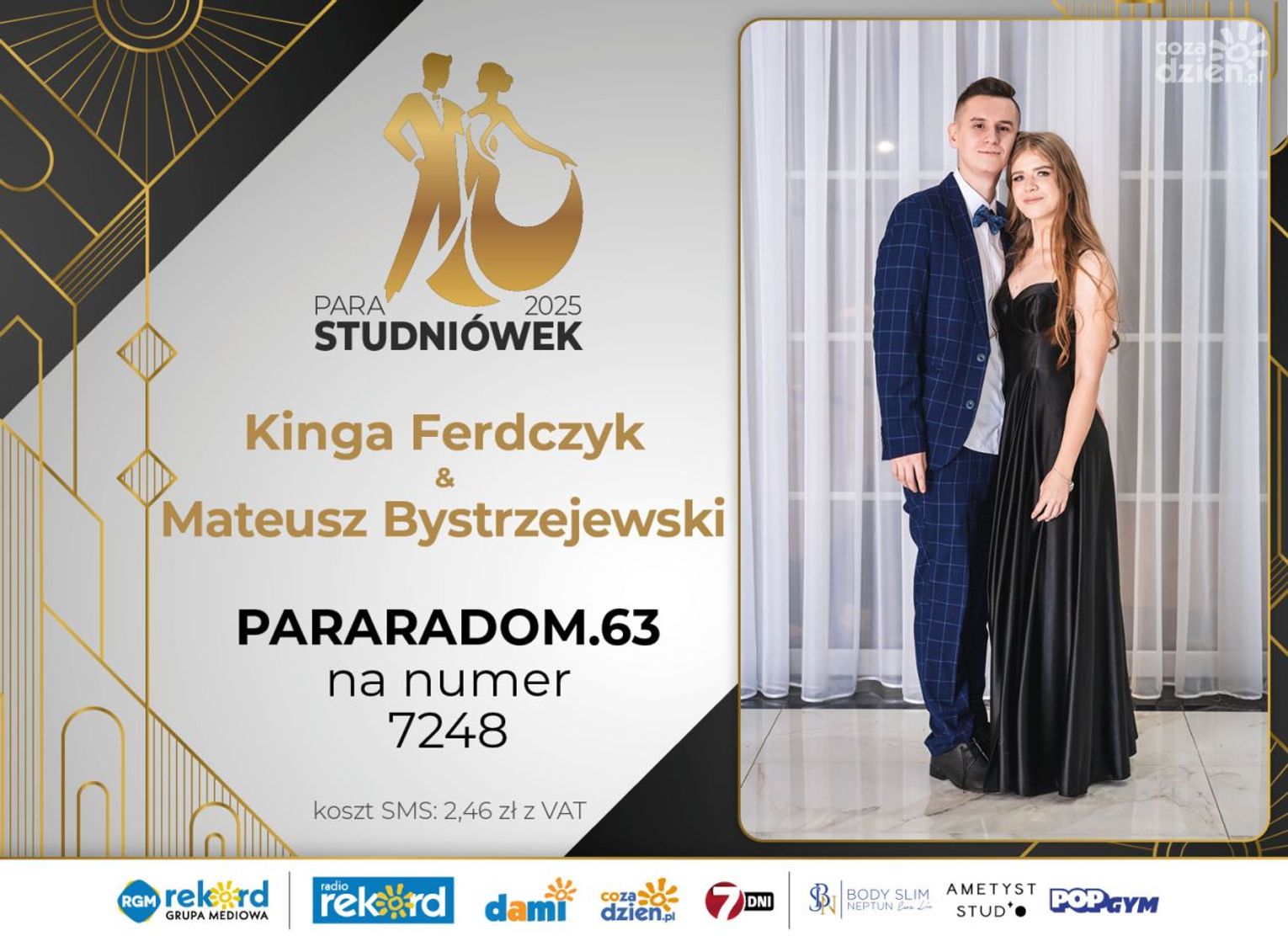 Wybór najpiękniejszej Pary Studniówek 2025 będzie przebiegał dwuetapowo. Pierwszym etapem plebiscytu będzie głosowanie za pomocą SMS-ów. Koszt jednej wiadomości SMS to 2zł + VAT. SMS wysyłamy na numer 7248. W treści SMS-a należy wpisać odpowiednio „PARARADOM” a za nim, po kropce przypisany numer, np. PARARADOM.1 Głosowanie rusza od 8 stycznia 2025 roku. Wyniki będzie można sprawdzać na bieżąco na portalu CoZaDzien.pl