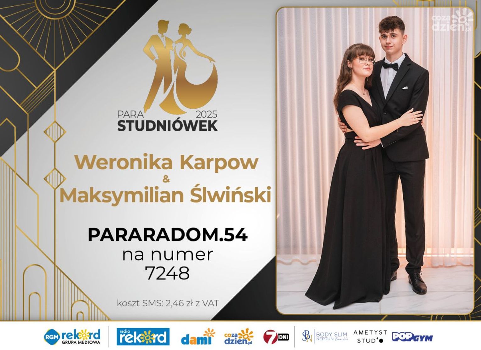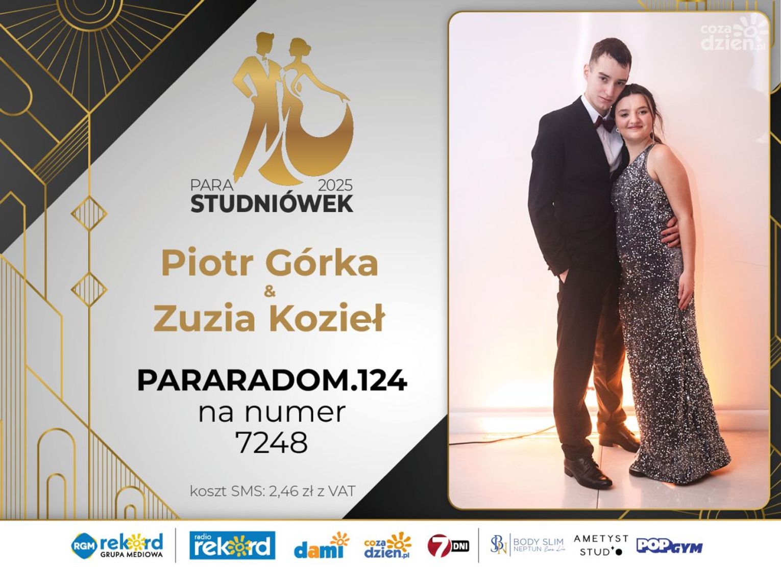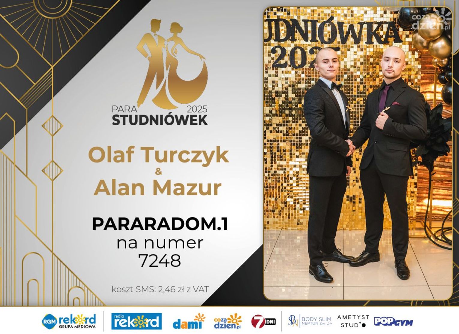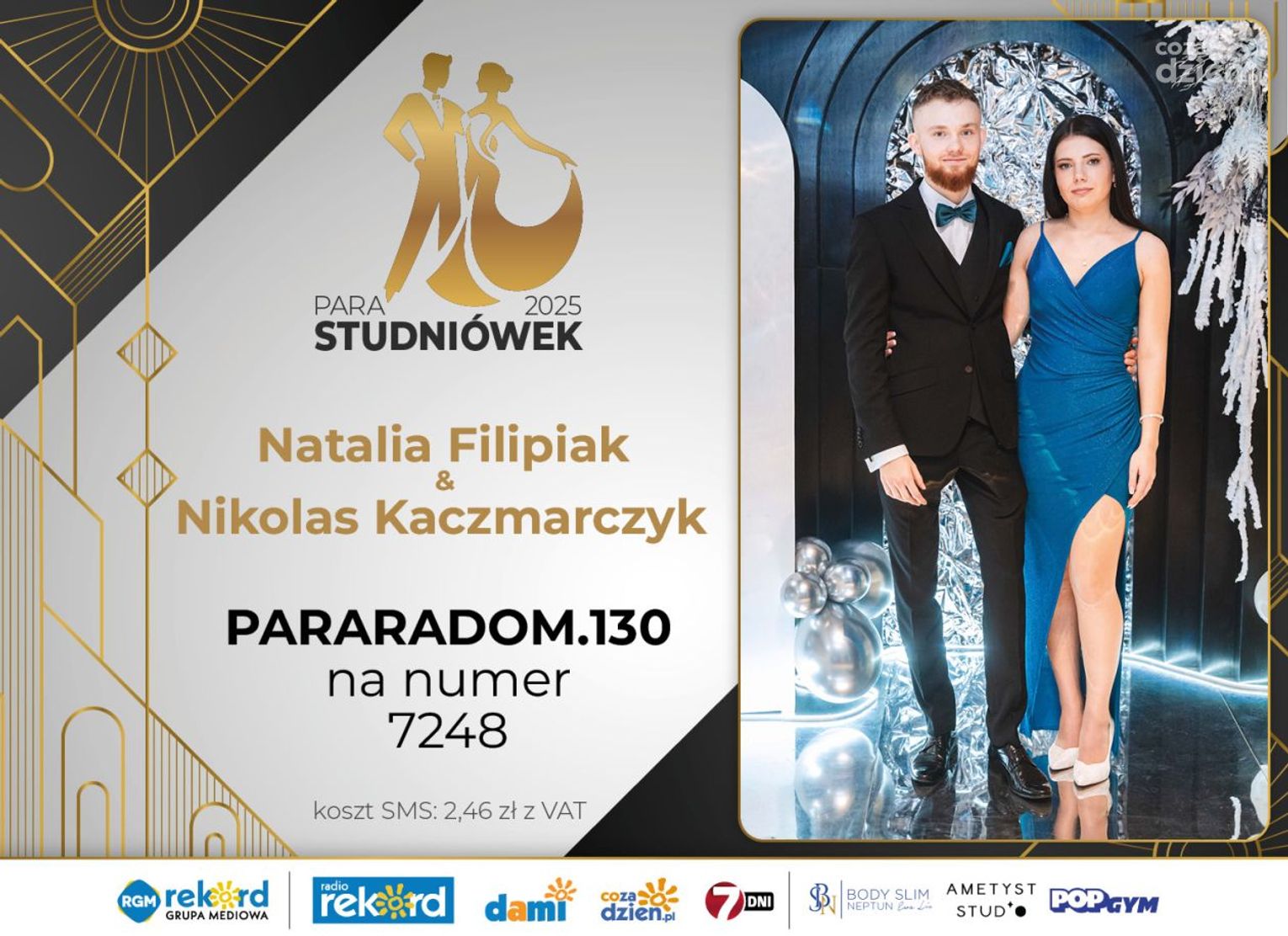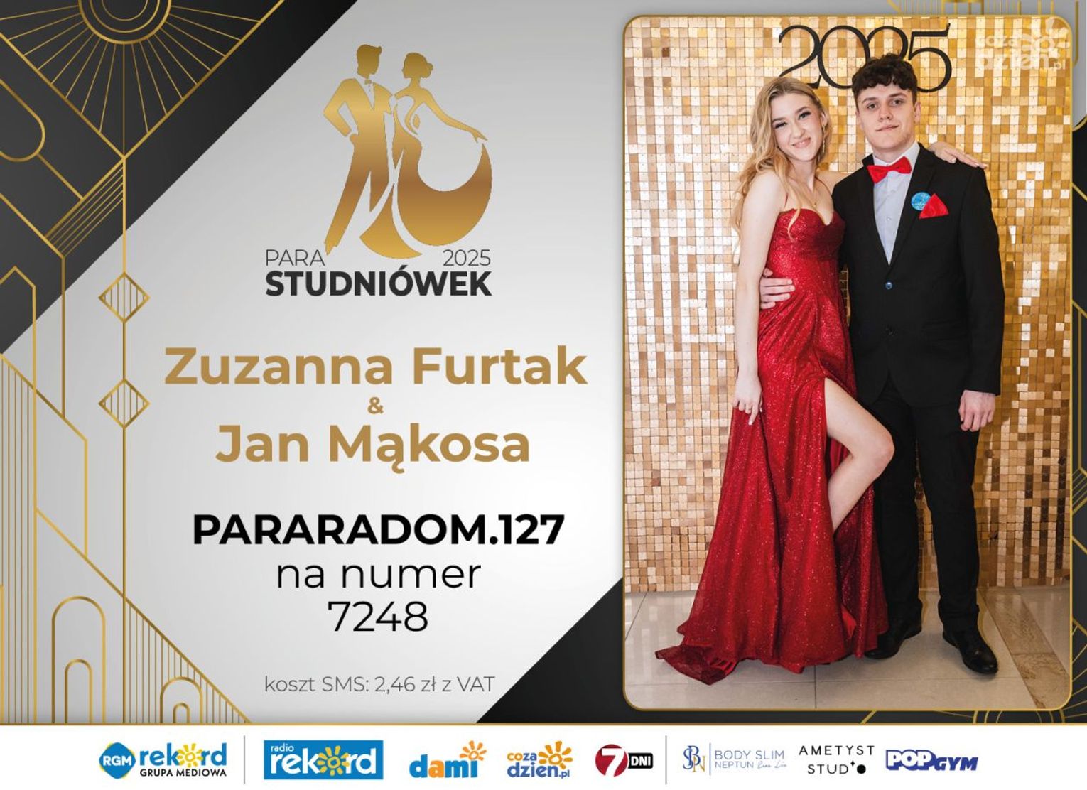 Wybór najpiękniejszej Pary Studniówek 2025 będzie przebiegał dwuetapowo. Pierwszym etapem plebiscytu będzie głosowanie za pomocą SMS-ów. Koszt jednej wiadomości SMS to 2zł + VAT. SMS wysyłamy na numer 7248. W treści SMS-a należy wpisać odpowiednio „PARARADOM” a za nim, po kropce przypisany numer, np. PARARADOM.1 Głosowanie rusza od 8 stycznia 2025 roku. Wyniki będzie można sprawdzać na bieżąco na portalu CoZaDzien.pl