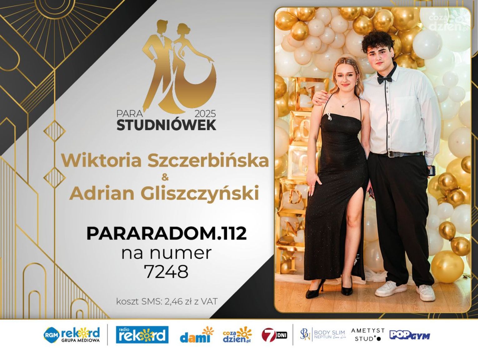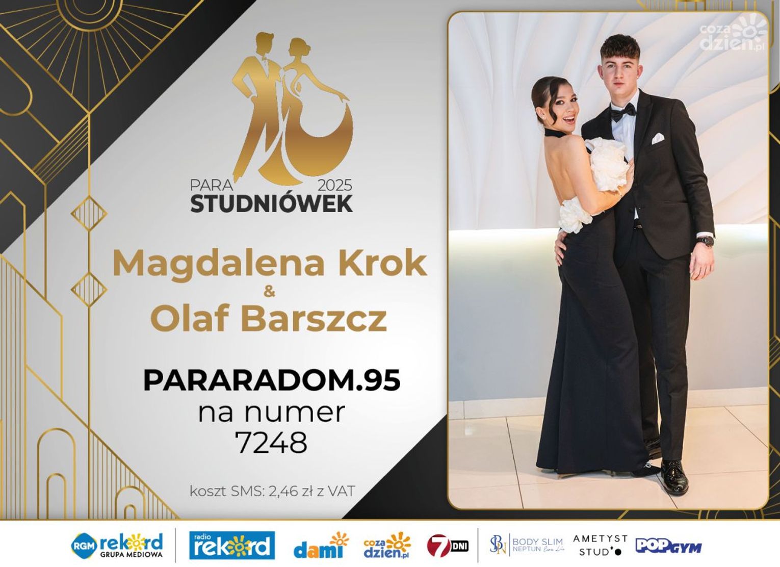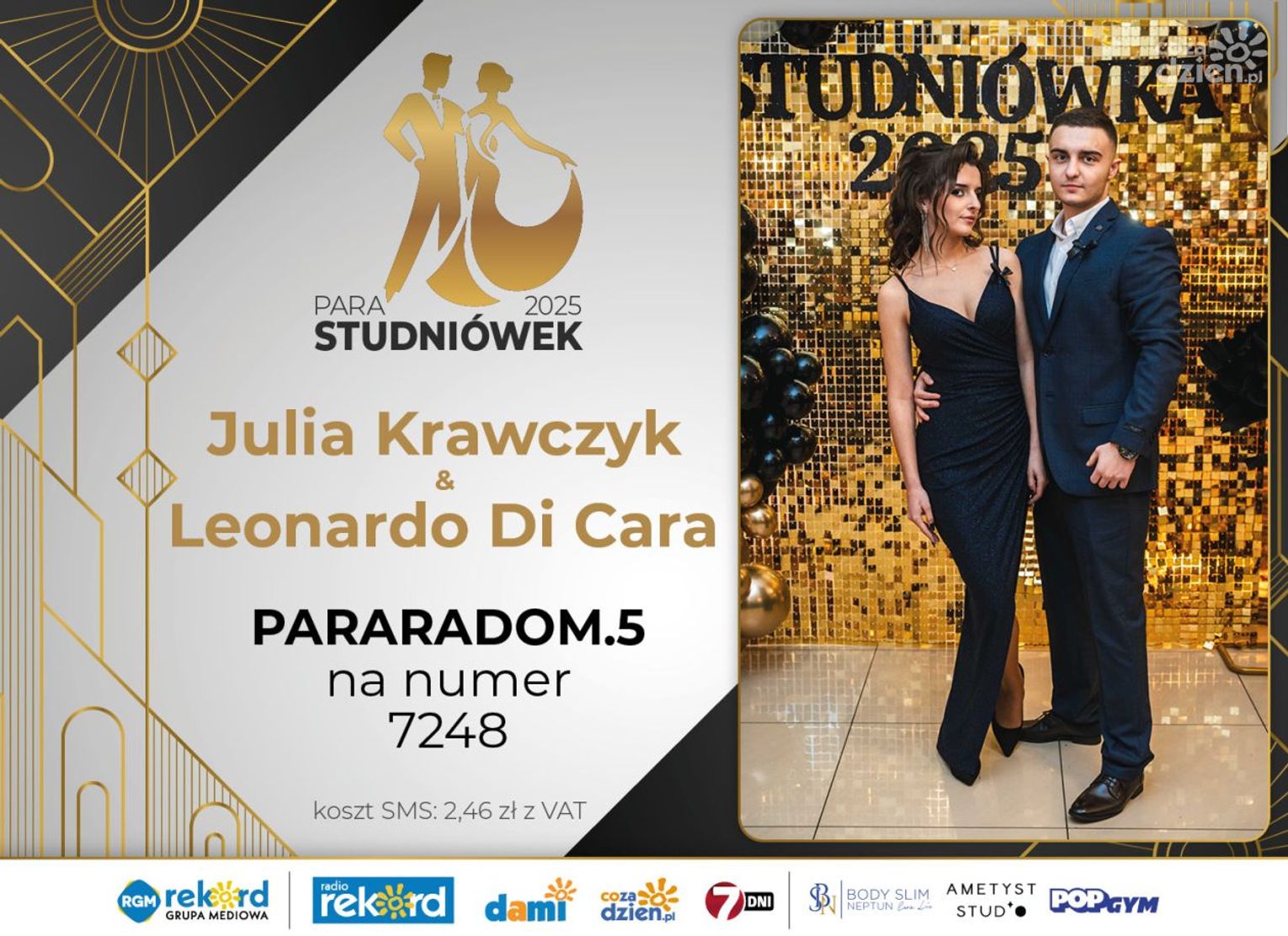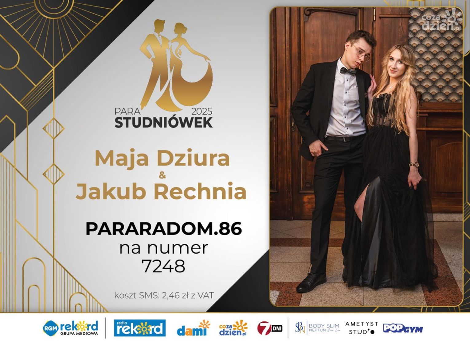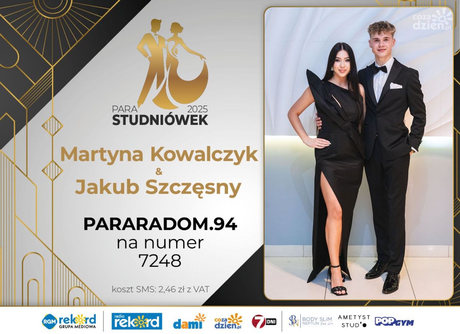 Wybór najpiękniejszej Pary Studniówek 2025 będzie przebiegał dwuetapowo. Pierwszym etapem plebiscytu będzie głosowanie za pomocą SMS-ów. Koszt jednej wiadomości SMS to 2zł + VAT. SMS wysyłamy na numer 7248. W treści SMS-a należy wpisać odpowiednio „PARARADOM” a za nim, po kropce przypisany numer, np. PARARADOM.1 Głosowanie rusza od 8 stycznia 2025 roku. Wyniki będzie można sprawdzać na bieżąco na portalu CoZaDzien.pl