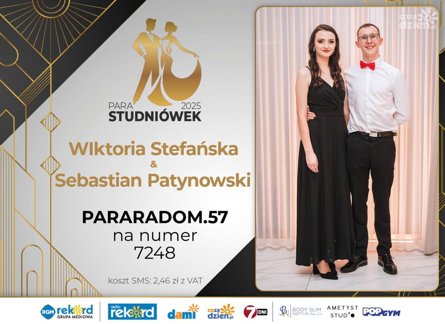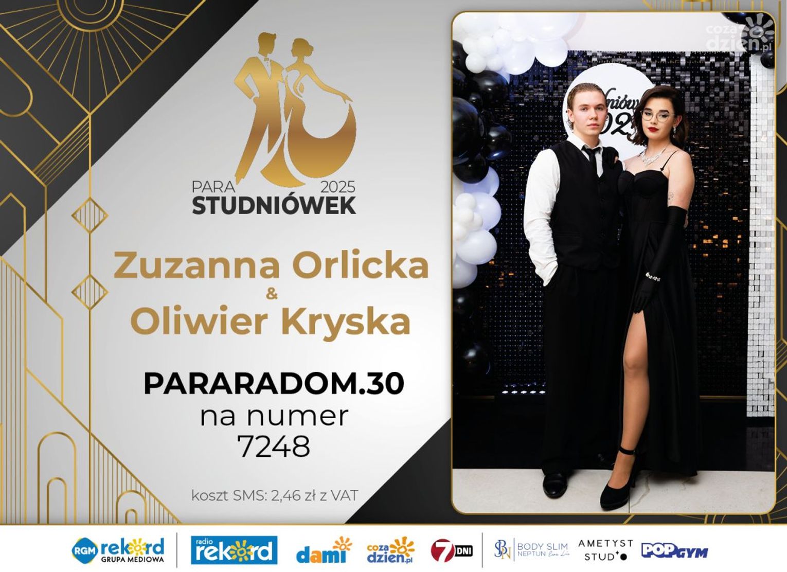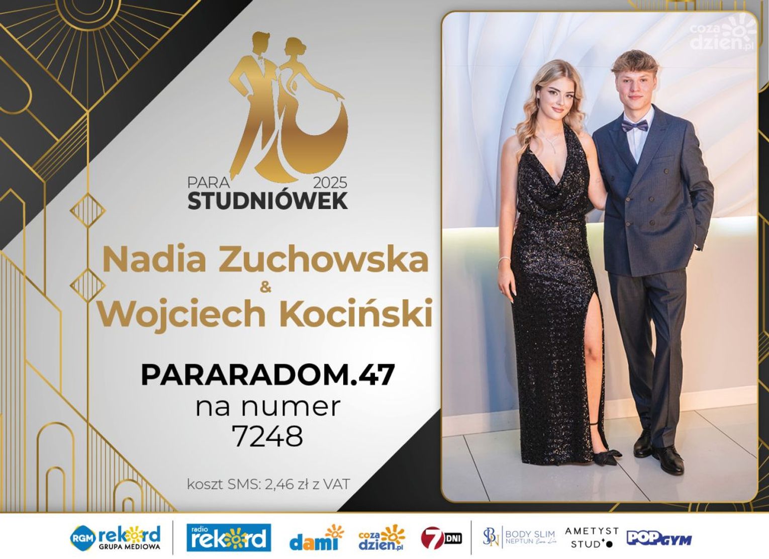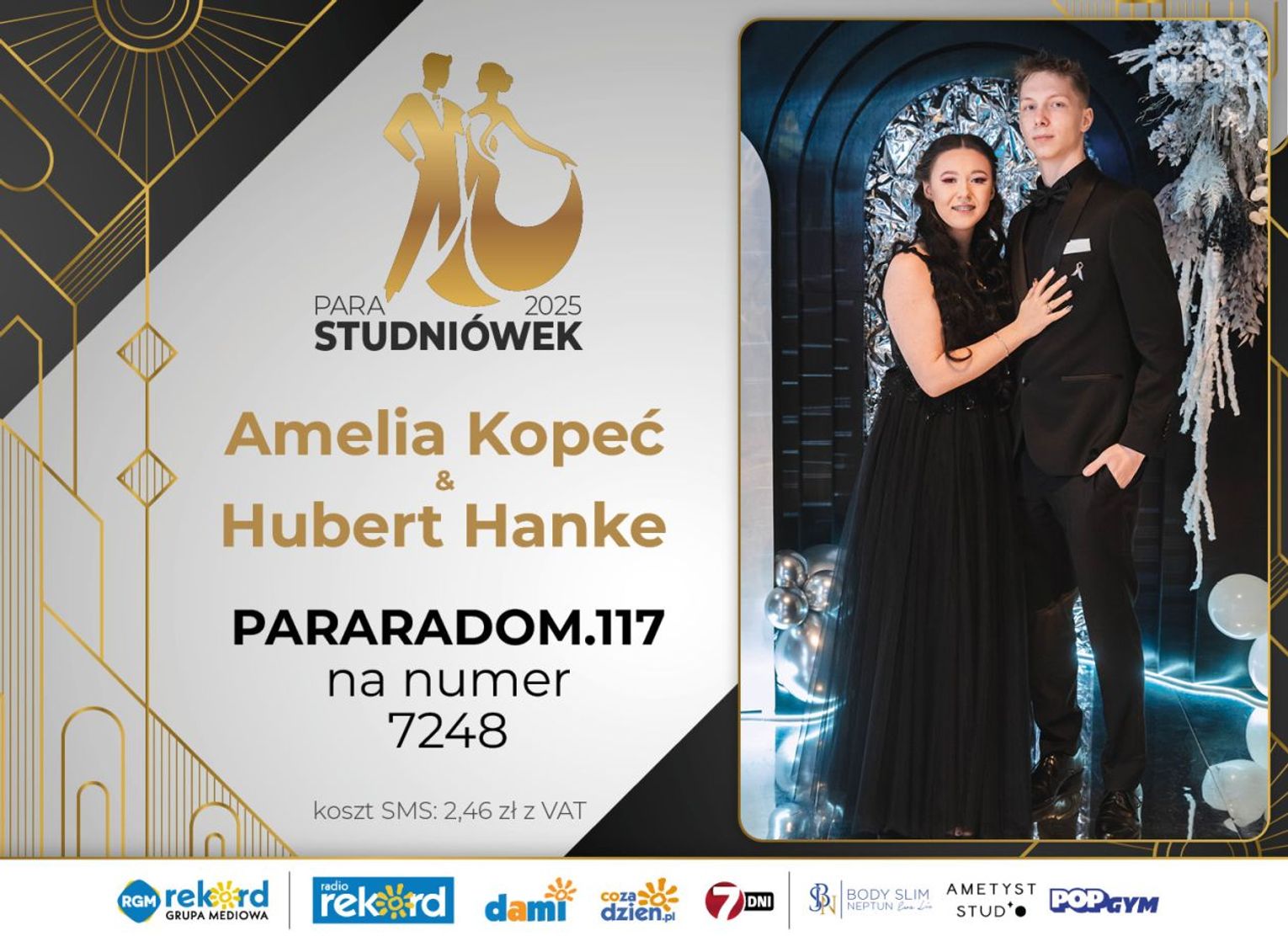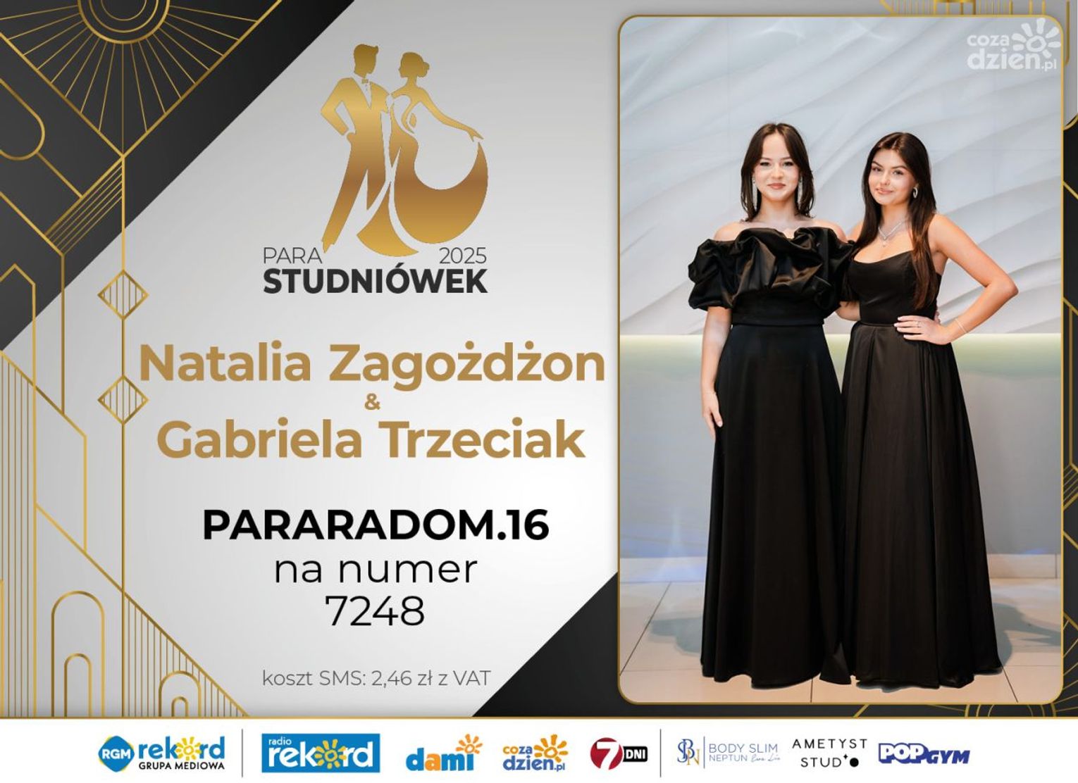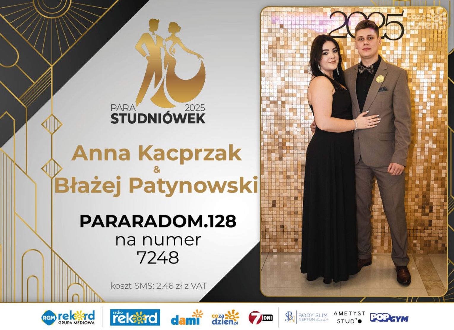 Wybór najpiękniejszej Pary Studniówek 2025 będzie przebiegał dwuetapowo. Pierwszym etapem plebiscytu będzie głosowanie za pomocą SMS-ów. Koszt jednej wiadomości SMS to 2zł + VAT. SMS wysyłamy na numer 7248. W treści SMS-a należy wpisać odpowiednio „PARARADOM” a za nim, po kropce przypisany numer, np. PARARADOM.1 Głosowanie rusza od 8 stycznia 2025 roku. Wyniki będzie można sprawdzać na bieżąco na portalu CoZaDzien.pl