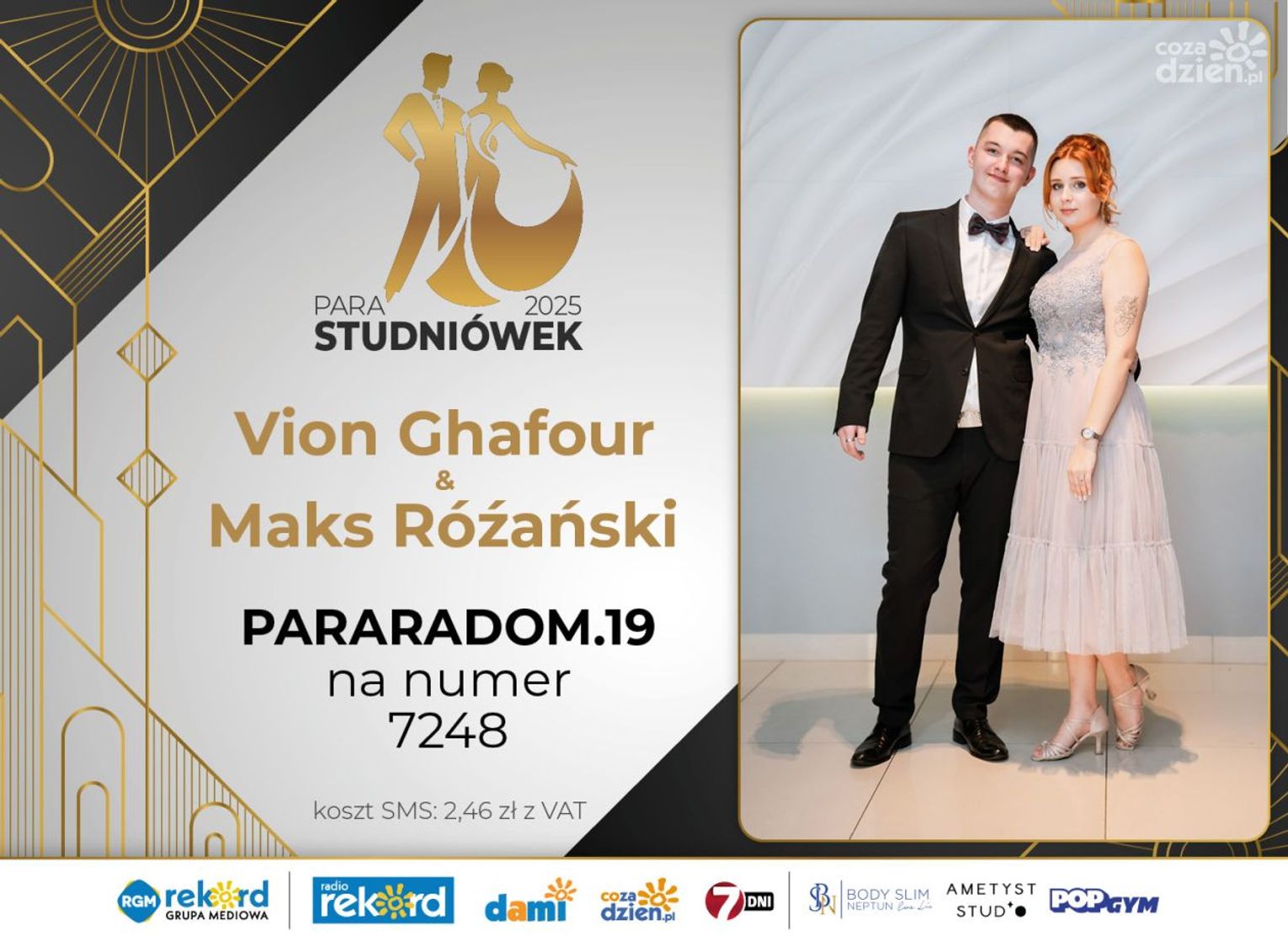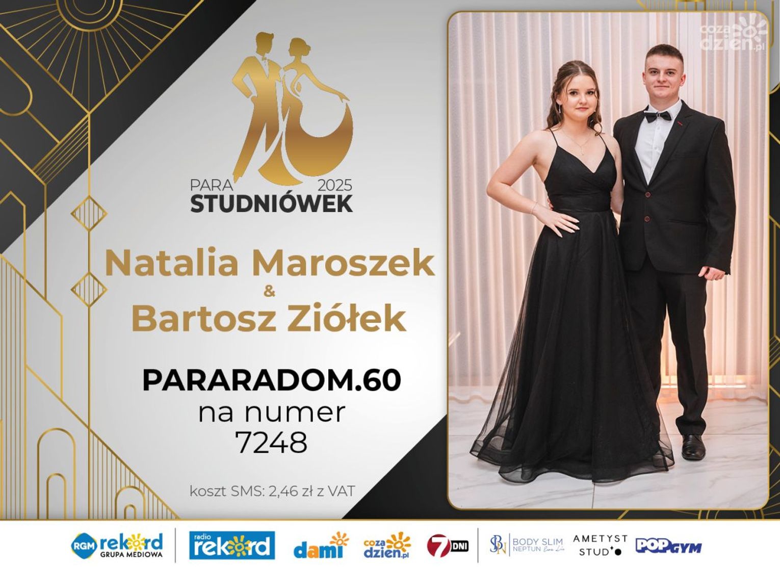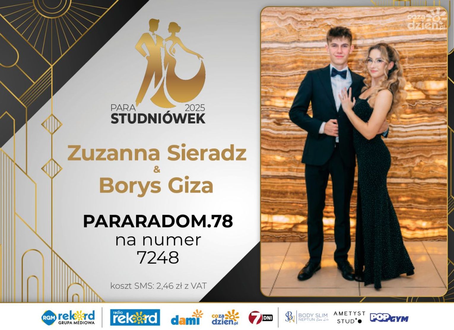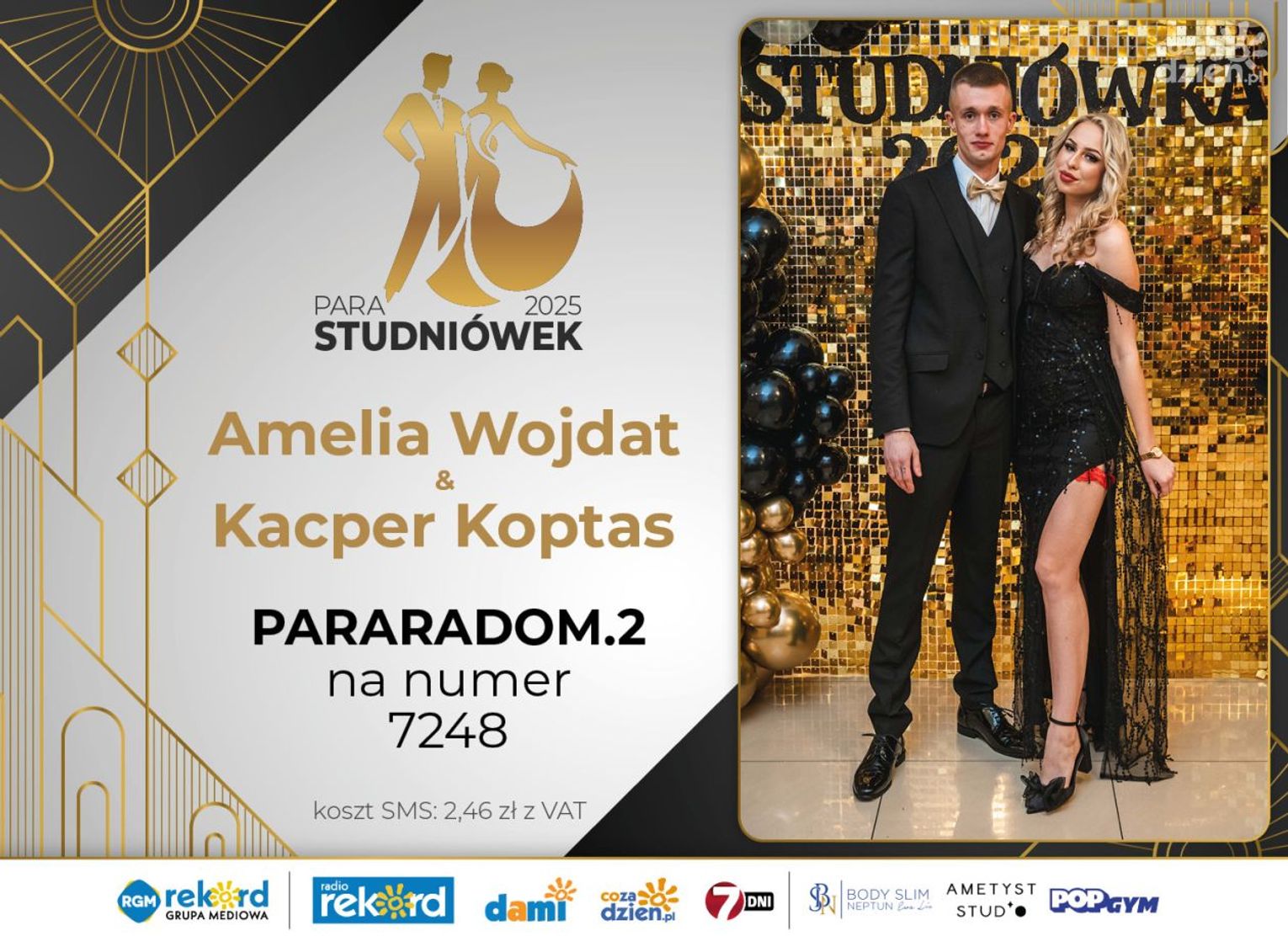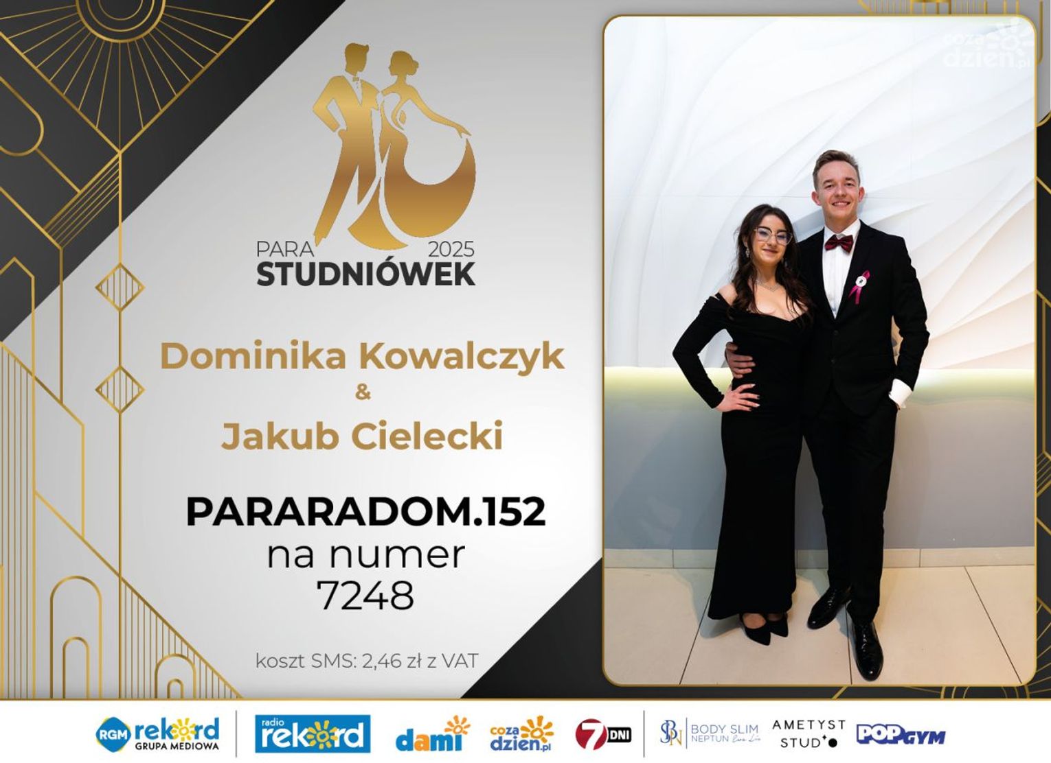 Wybór najpiękniejszej Pary Studniówek 2025 będzie przebiegał dwuetapowo. Pierwszym etapem plebiscytu będzie głosowanie za pomocą SMS-ów. Koszt jednej wiadomości SMS to 2zł + VAT. SMS wysyłamy na numer 7248. W treści SMS-a należy wpisać odpowiednio „PARARADOM” a za nim, po kropce przypisany numer, np. PARARADOM.1 Głosowanie rusza od 8 stycznia 2025 roku. Wyniki będzie można sprawdzać na bieżąco na portalu CoZaDzien.pl