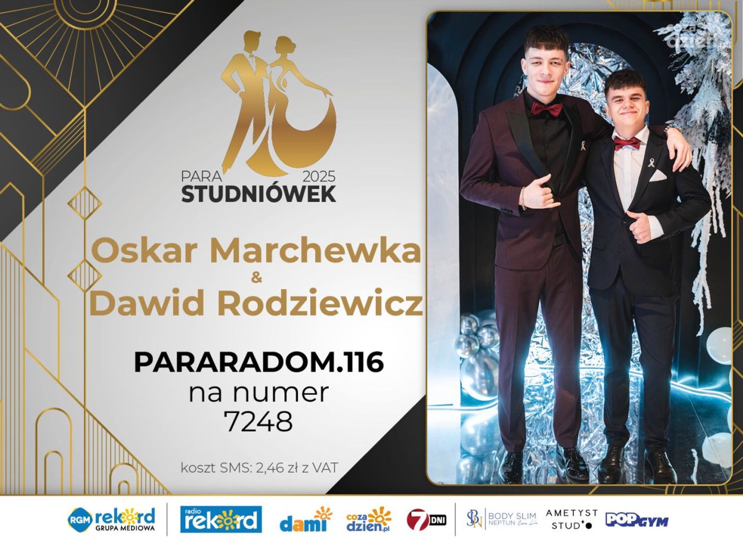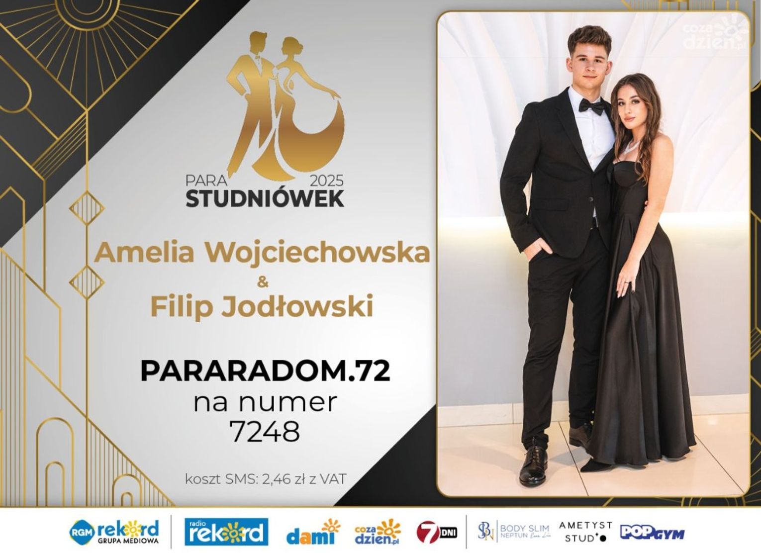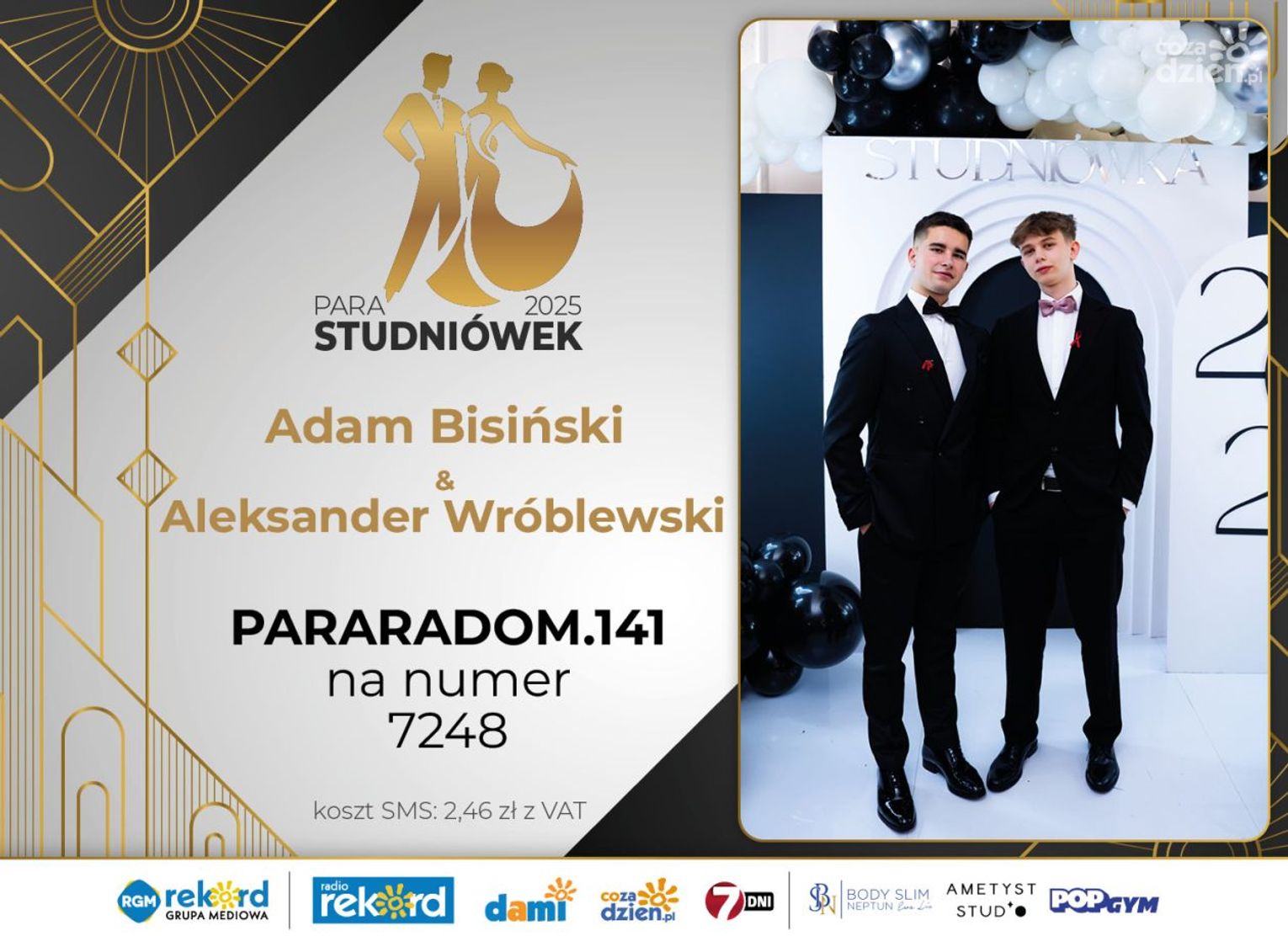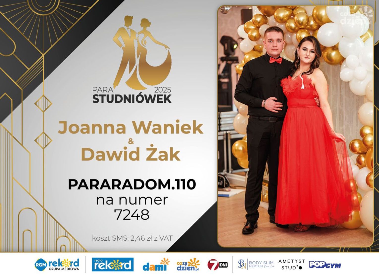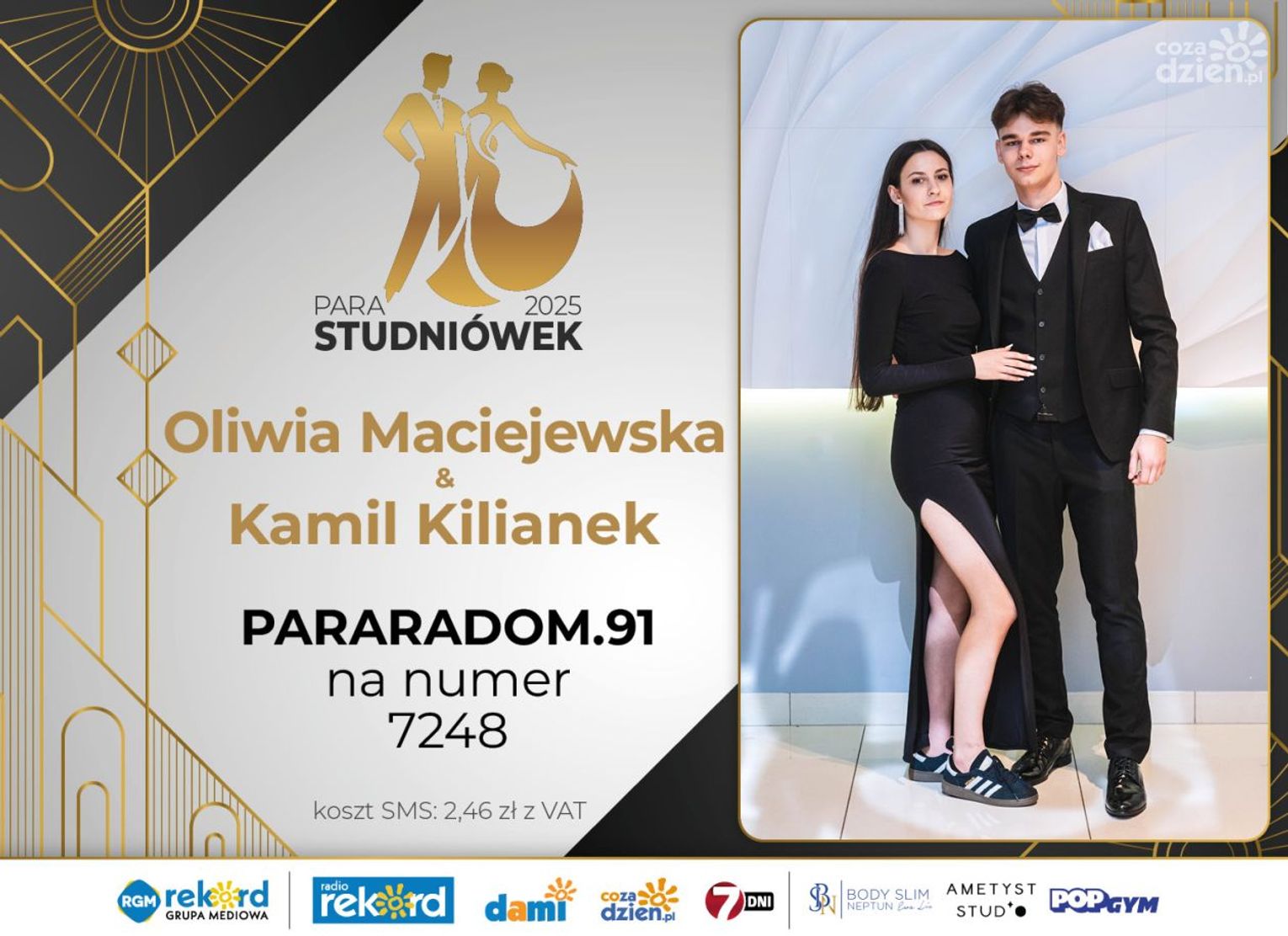 Wybór najpiękniejszej Pary Studniówek 2025 będzie przebiegał dwuetapowo. Pierwszym etapem plebiscytu będzie głosowanie za pomocą SMS-ów. Koszt jednej wiadomości SMS to 2zł + VAT. SMS wysyłamy na numer 7248. W treści SMS-a należy wpisać odpowiednio „PARARADOM” a za nim, po kropce przypisany numer, np. PARARADOM.1 Głosowanie rusza od 8 stycznia 2025 roku. Wyniki będzie można sprawdzać na bieżąco na portalu CoZaDzien.pl