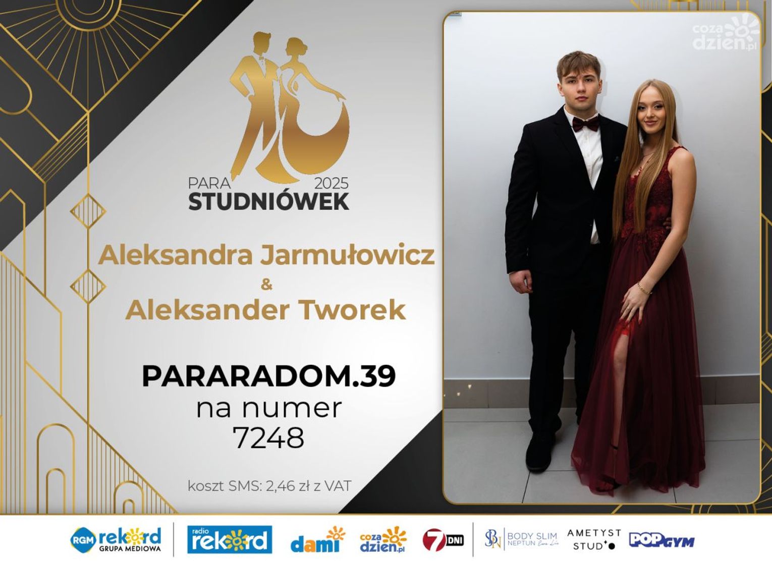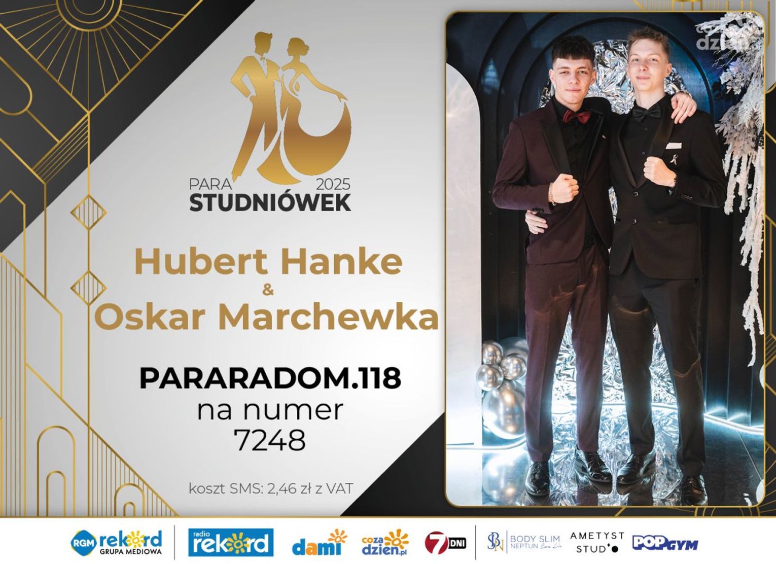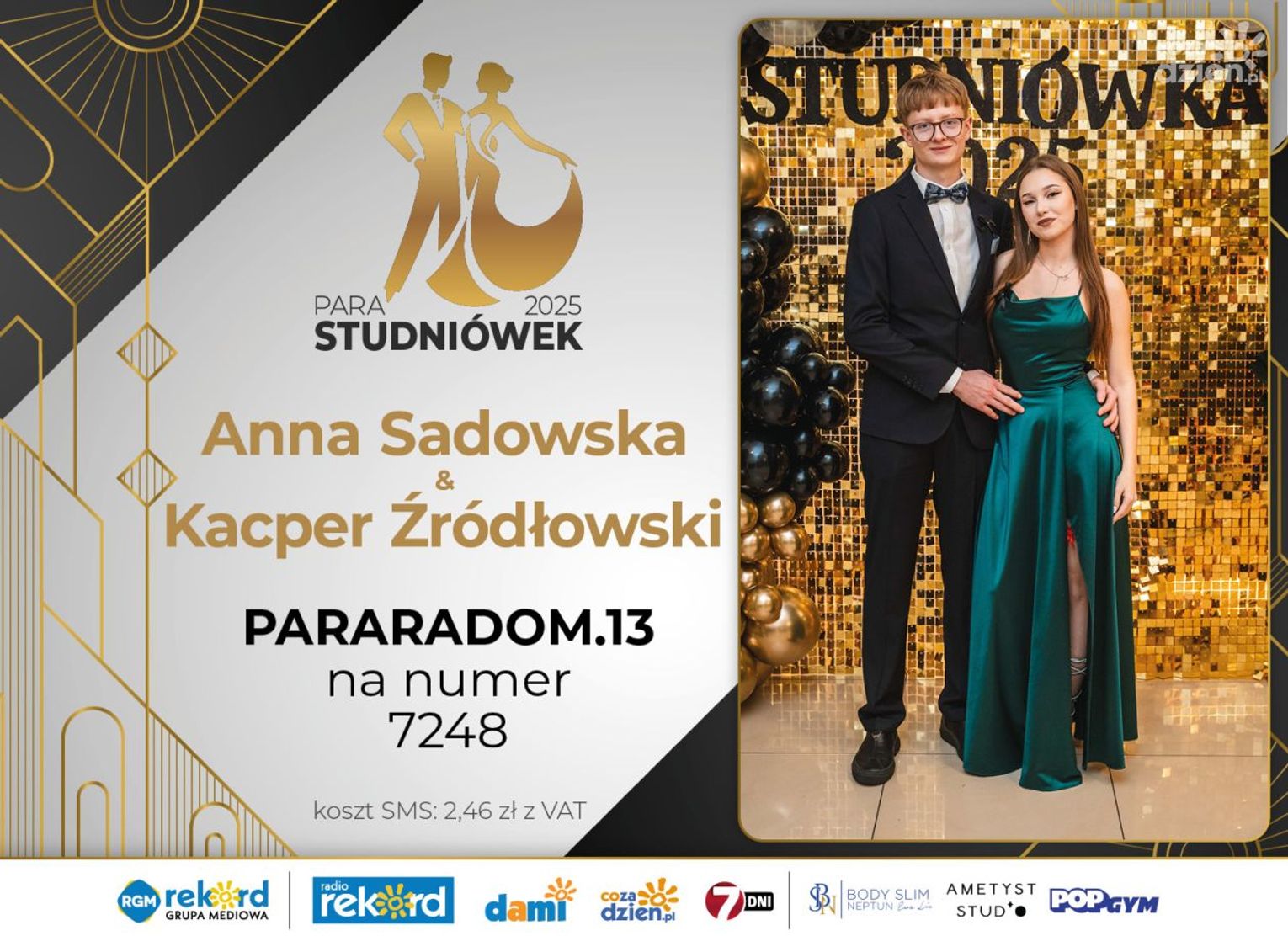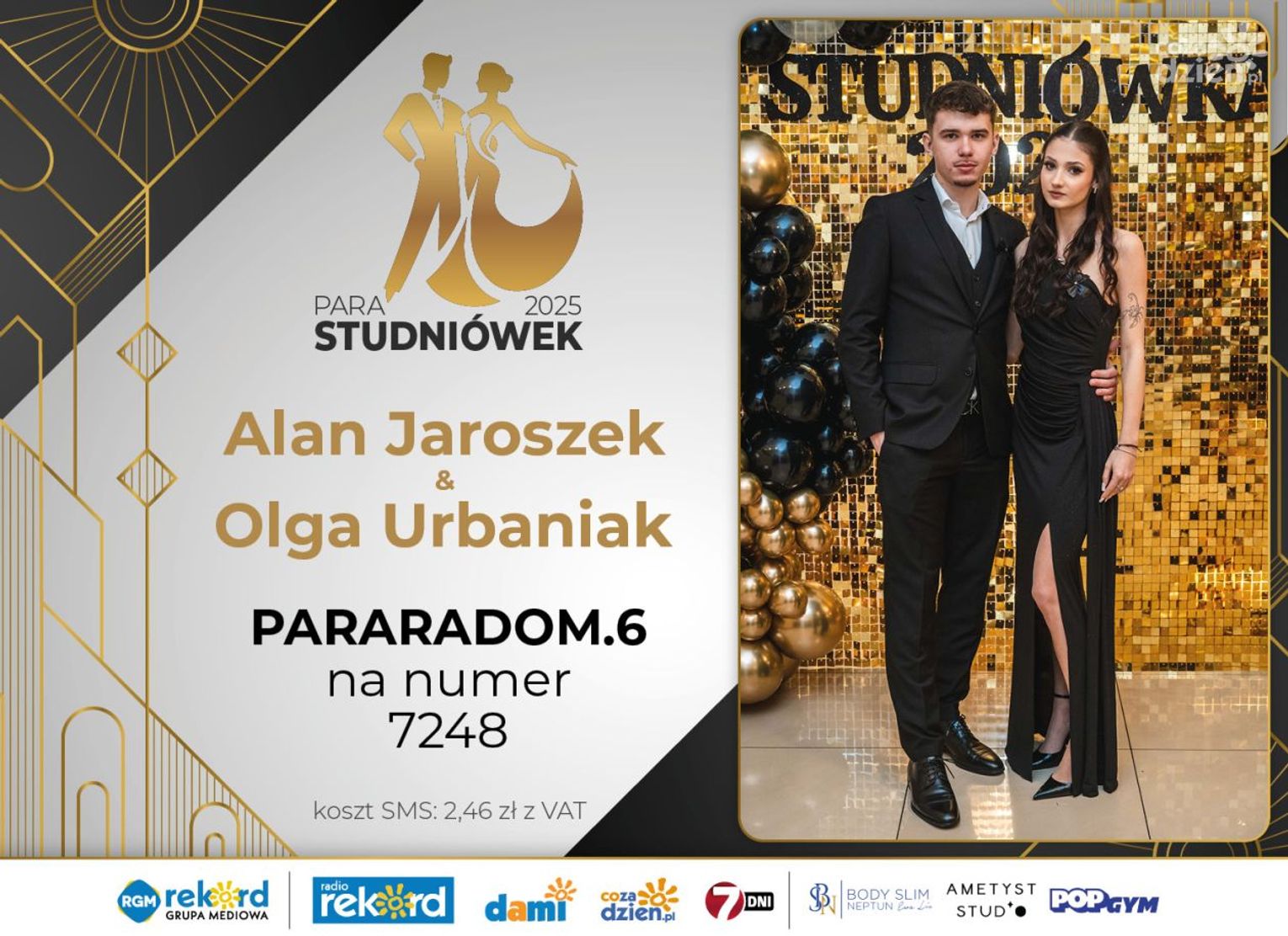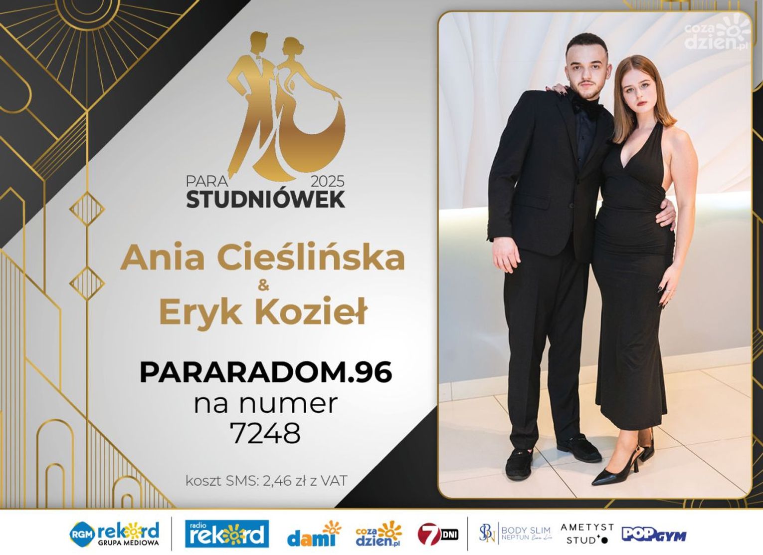 Wybór najpiękniejszej Pary Studniówek 2025 będzie przebiegał dwuetapowo. Pierwszym etapem plebiscytu będzie głosowanie za pomocą SMS-ów. Koszt jednej wiadomości SMS to 2zł + VAT. SMS wysyłamy na numer 7248. W treści SMS-a należy wpisać odpowiednio „PARARADOM” a za nim, po kropce przypisany numer, np. PARARADOM.1 Głosowanie rusza od 8 stycznia 2025 roku. Wyniki będzie można sprawdzać na bieżąco na portalu CoZaDzien.pl