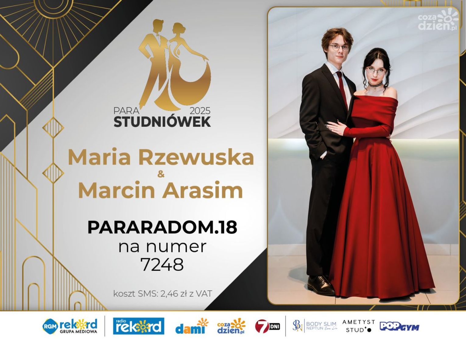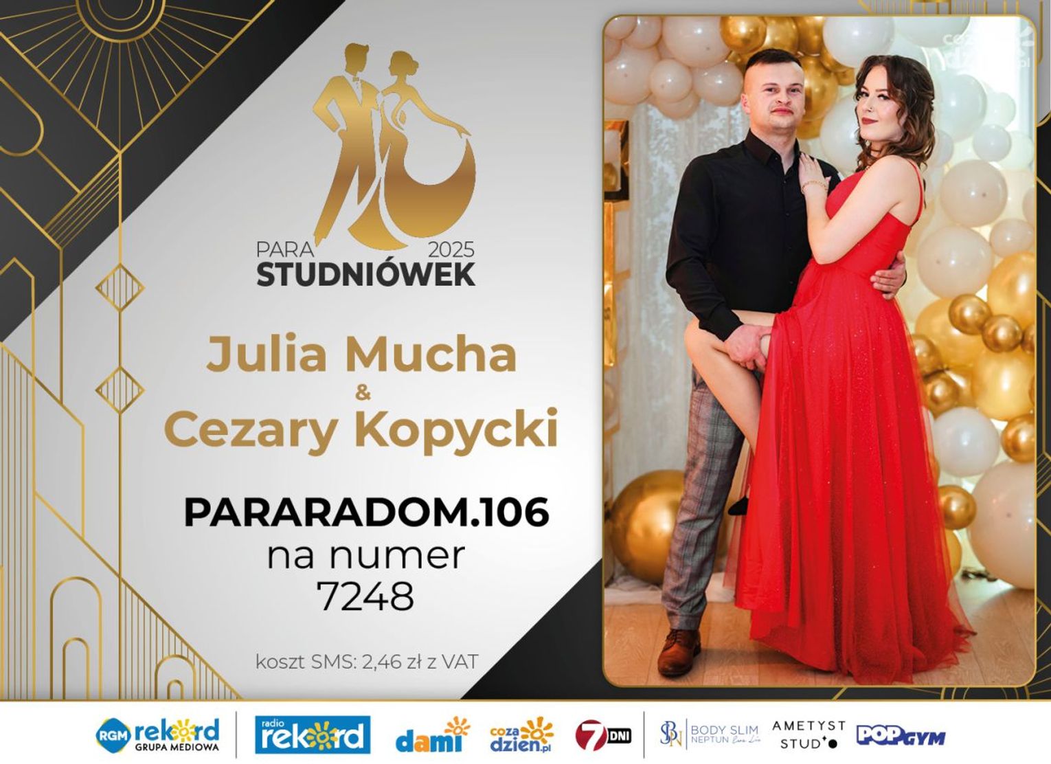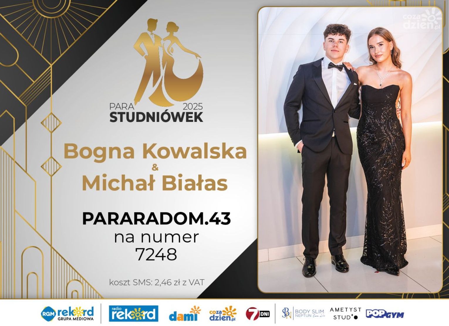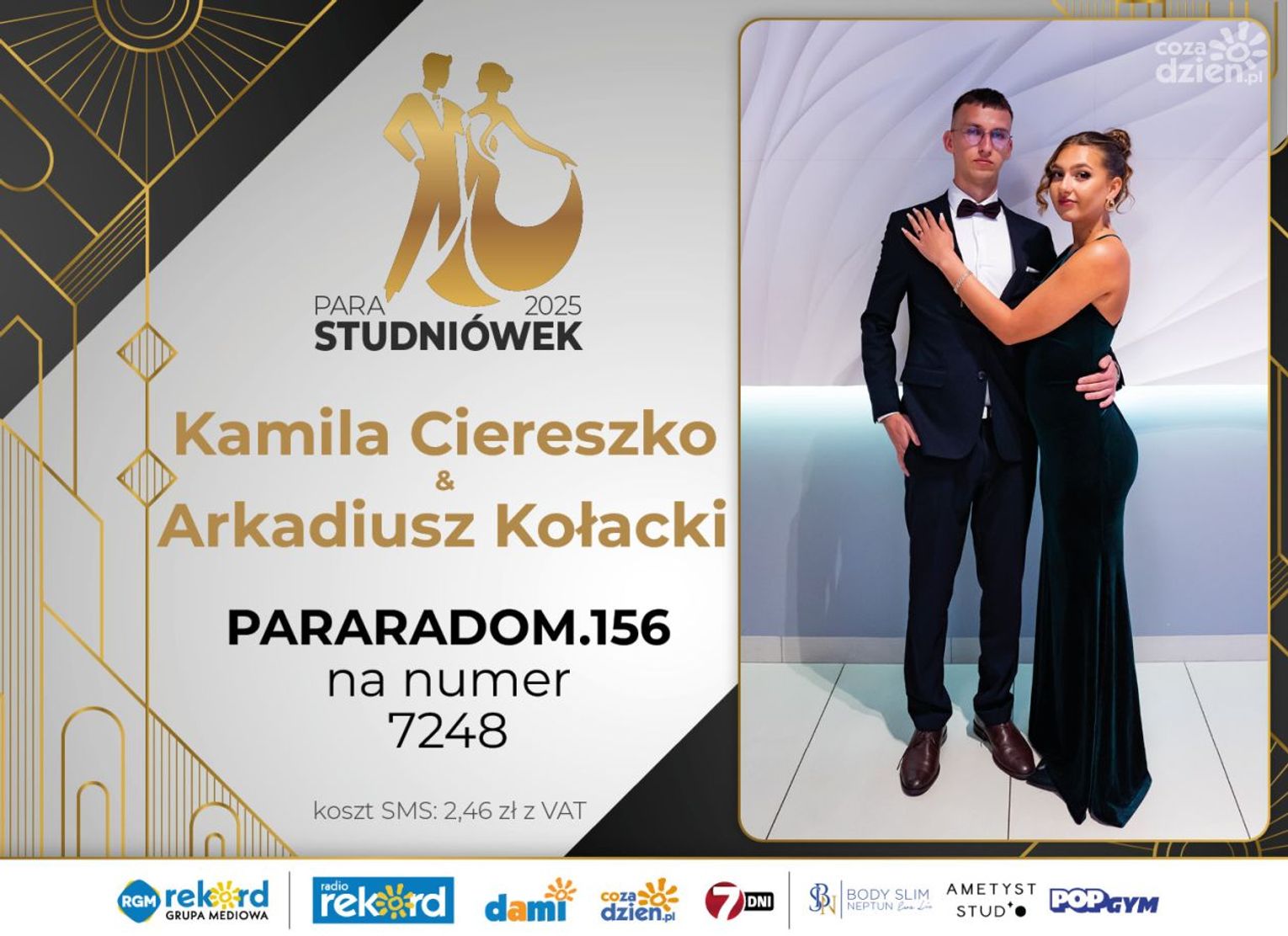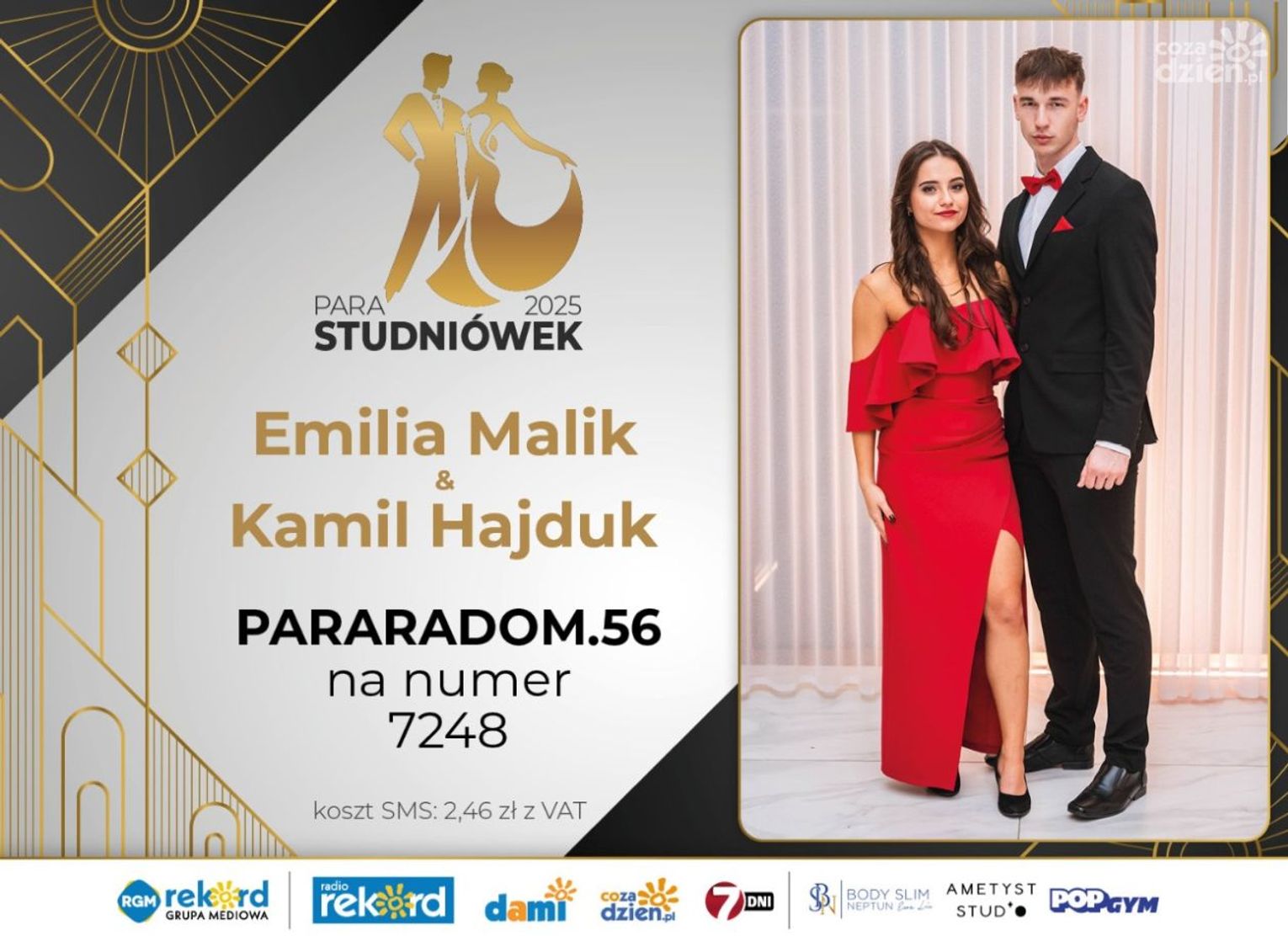 Wybór najpiękniejszej Pary Studniówek 2025 będzie przebiegał dwuetapowo. Pierwszym etapem plebiscytu będzie głosowanie za pomocą SMS-ów. Koszt jednej wiadomości SMS to 2zł + VAT. SMS wysyłamy na numer 7248. W treści SMS-a należy wpisać odpowiednio „PARARADOM” a za nim, po kropce przypisany numer, np. PARARADOM.1 Głosowanie rusza od 8 stycznia 2025 roku. Wyniki będzie można sprawdzać na bieżąco na portalu CoZaDzien.pl