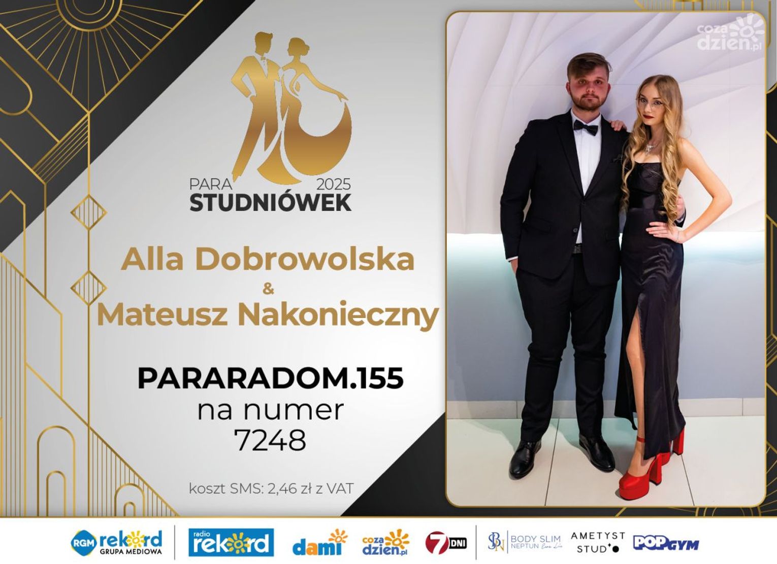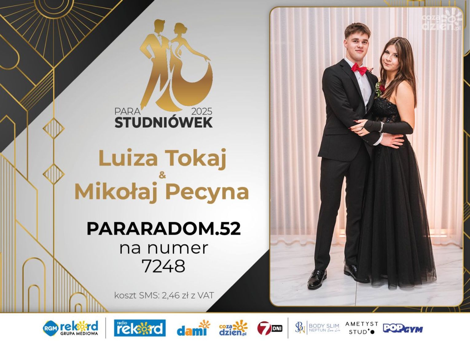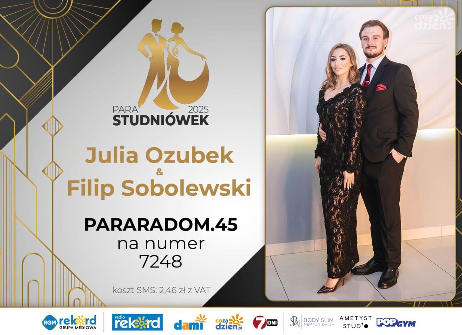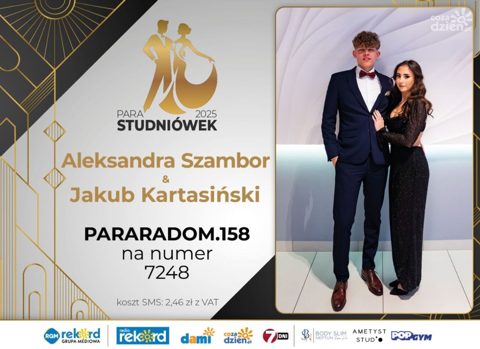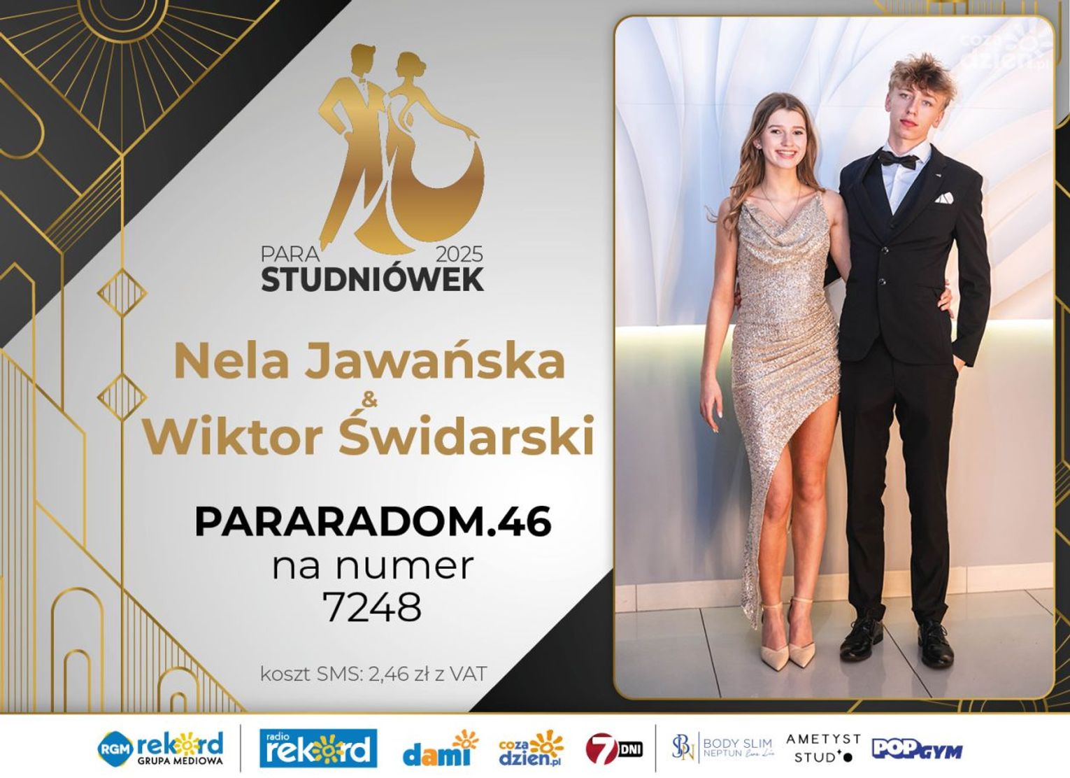 Wybór najpiękniejszej Pary Studniówek 2025 będzie przebiegał dwuetapowo. Pierwszym etapem plebiscytu będzie głosowanie za pomocą SMS-ów. Koszt jednej wiadomości SMS to 2zł + VAT. SMS wysyłamy na numer 7248. W treści SMS-a należy wpisać odpowiednio „PARARADOM” a za nim, po kropce przypisany numer, np. PARARADOM.1 Głosowanie rusza od 8 stycznia 2025 roku. Wyniki będzie można sprawdzać na bieżąco na portalu CoZaDzien.pl