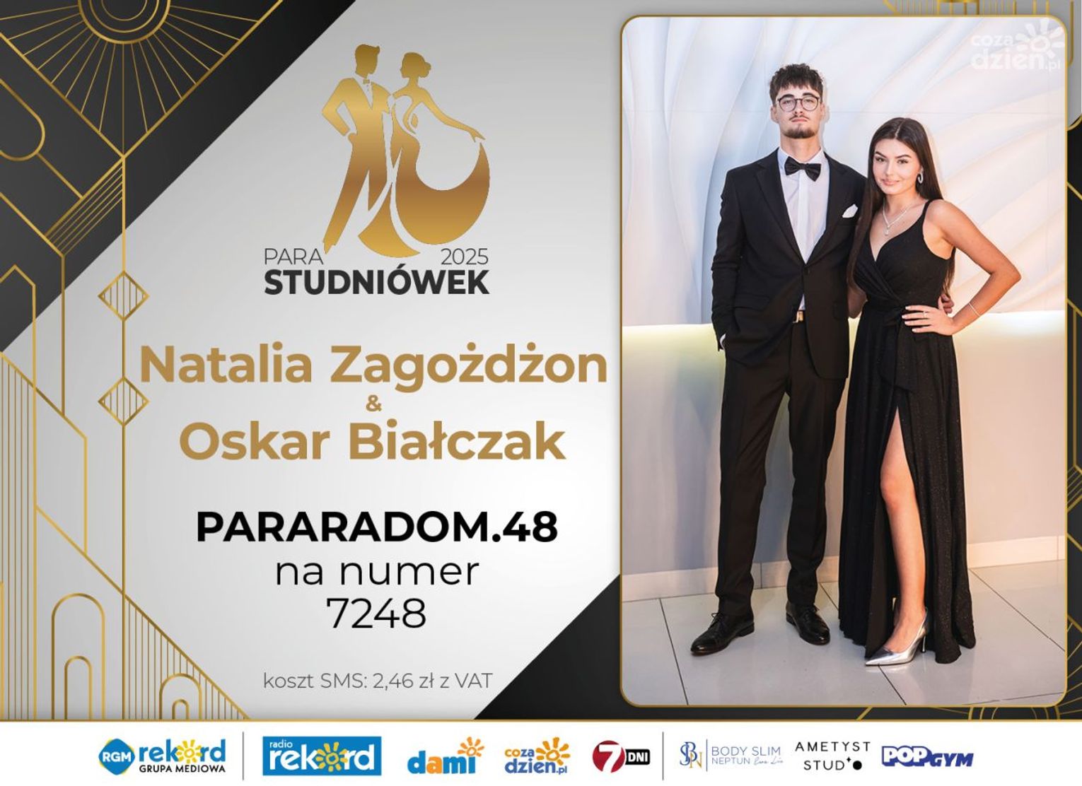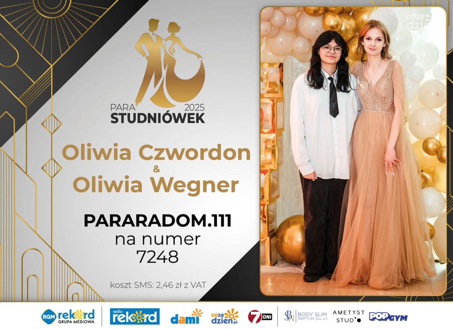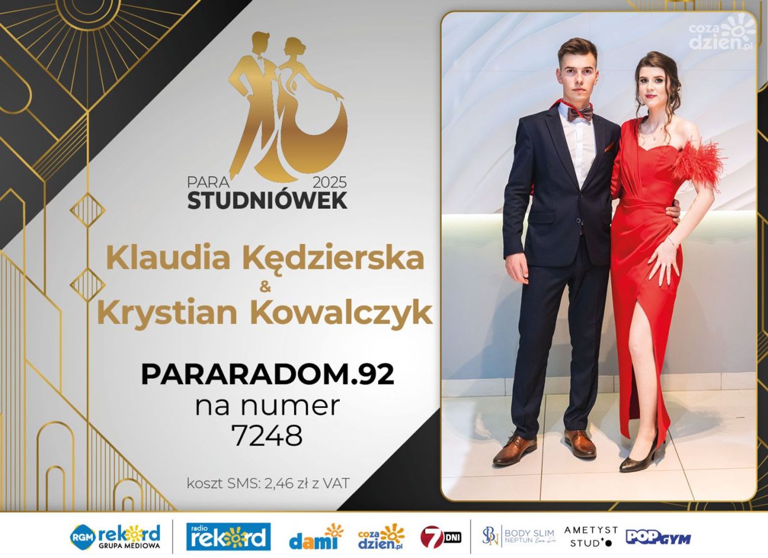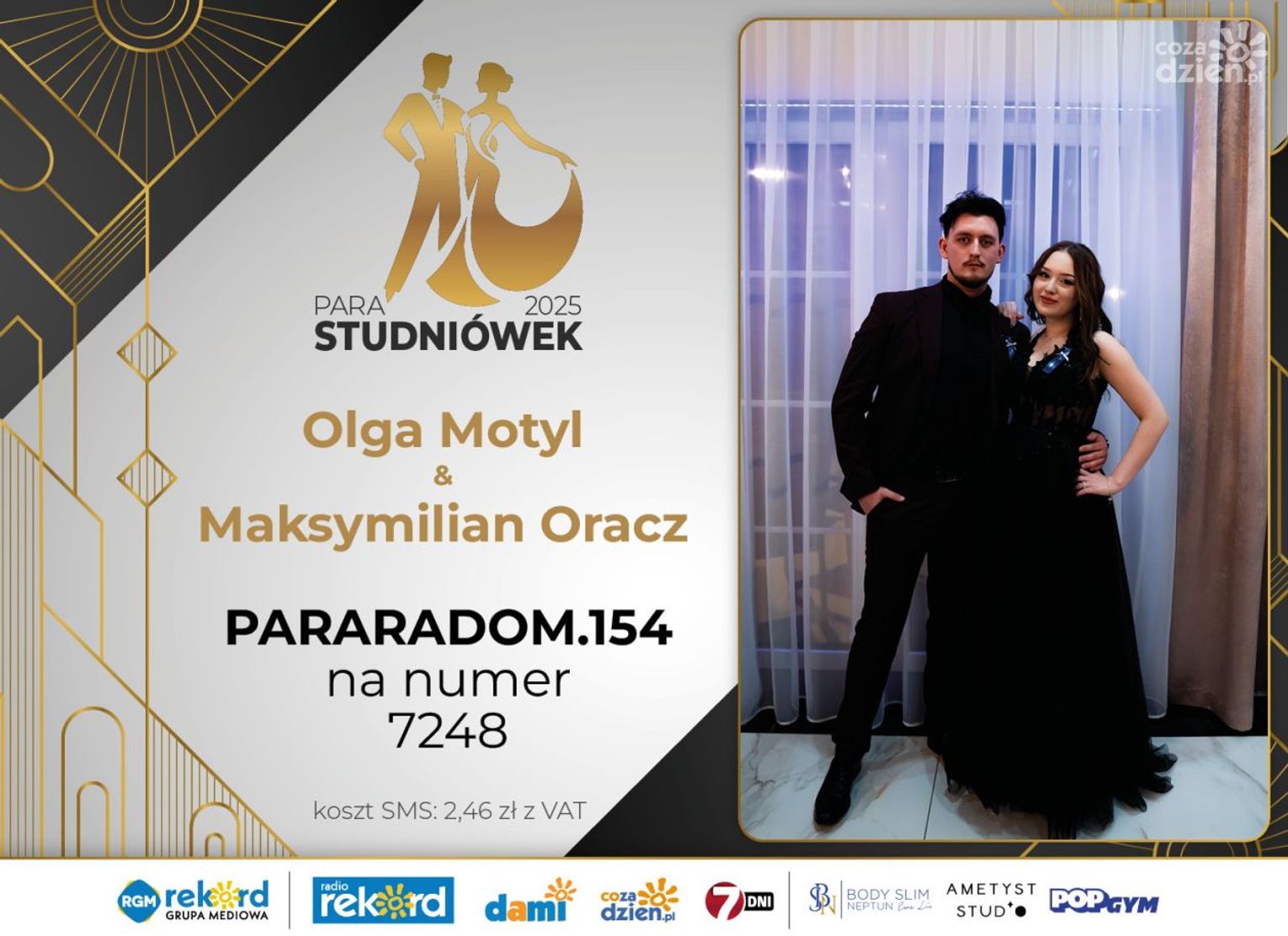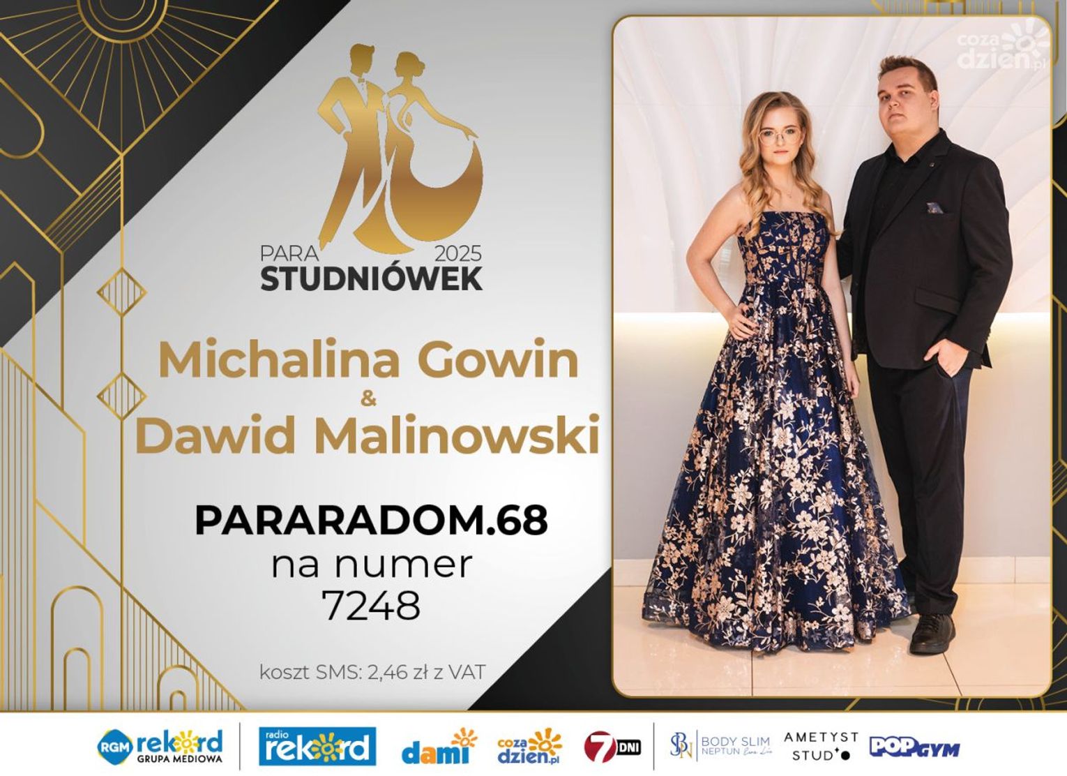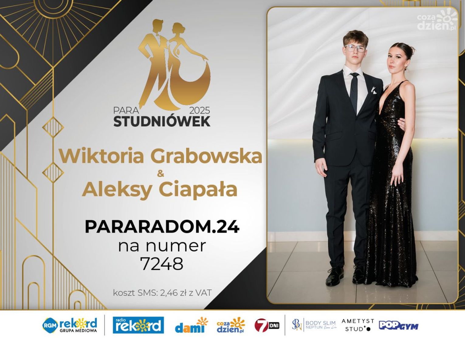 Wybór najpiękniejszej Pary Studniówek 2025 będzie przebiegał dwuetapowo. Pierwszym etapem plebiscytu będzie głosowanie za pomocą SMS-ów. Koszt jednej wiadomości SMS to 2zł + VAT. SMS wysyłamy na numer 7248. W treści SMS-a należy wpisać odpowiednio „PARARADOM” a za nim, po kropce przypisany numer, np. PARARADOM.1 Głosowanie rusza od 8 stycznia 2025 roku. Wyniki będzie można sprawdzać na bieżąco na portalu CoZaDzien.pl