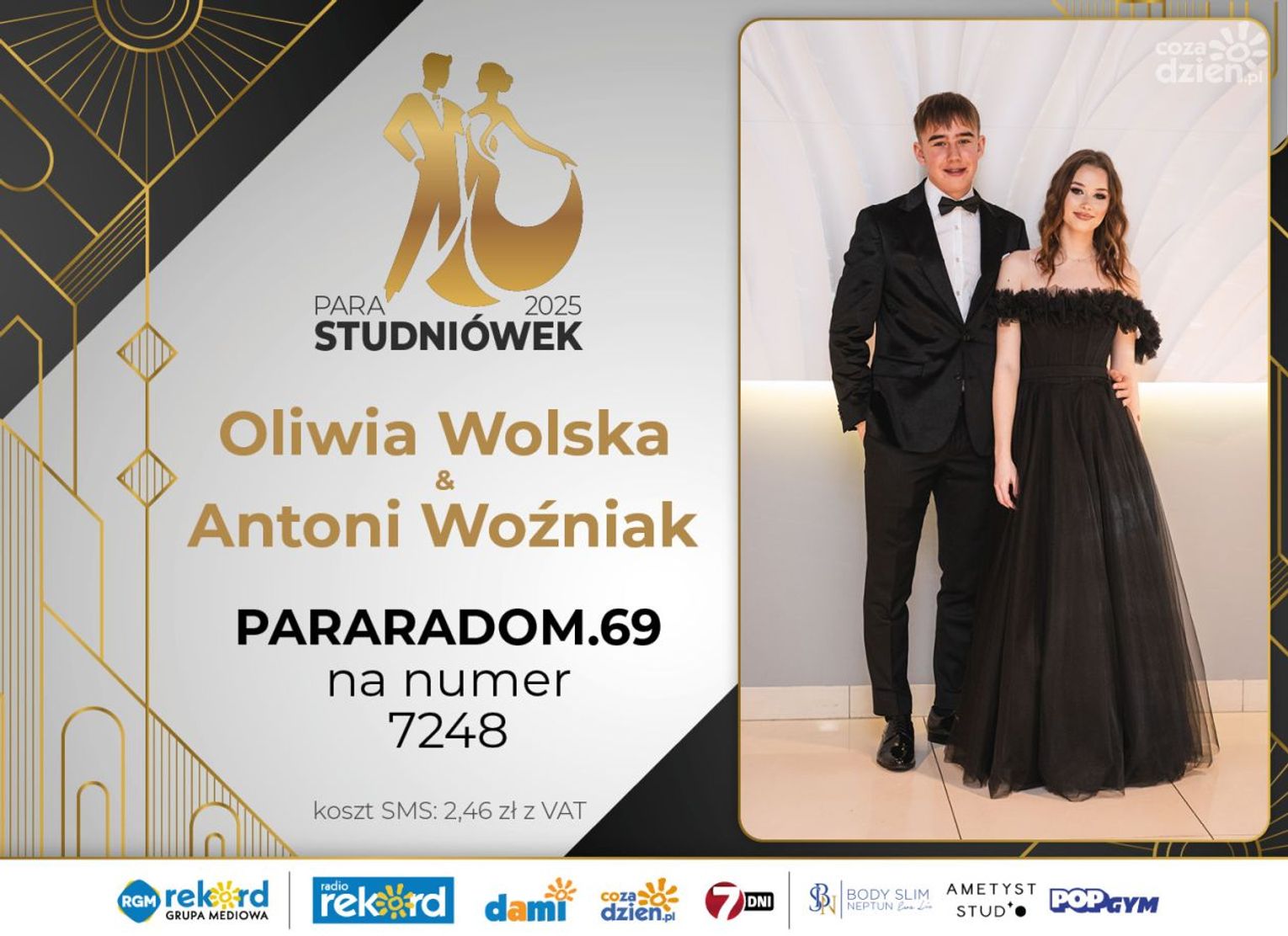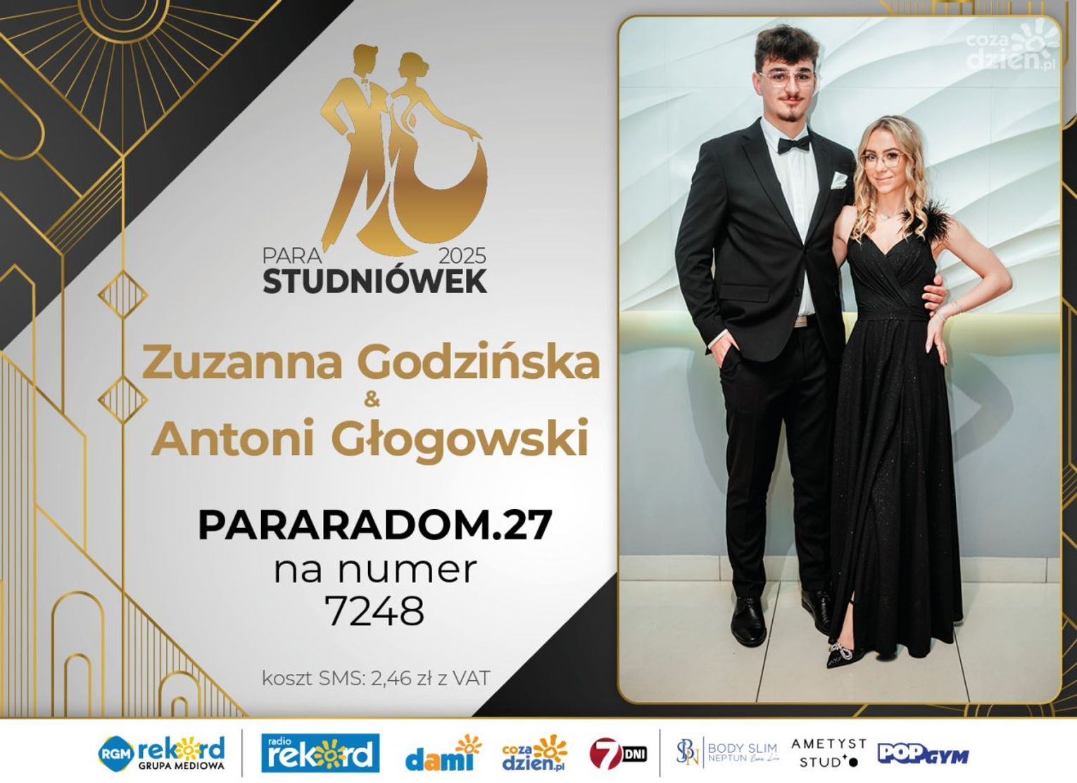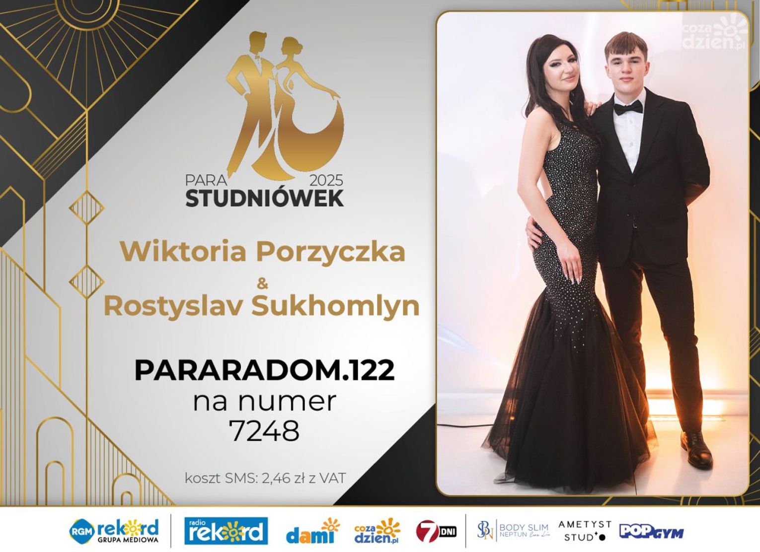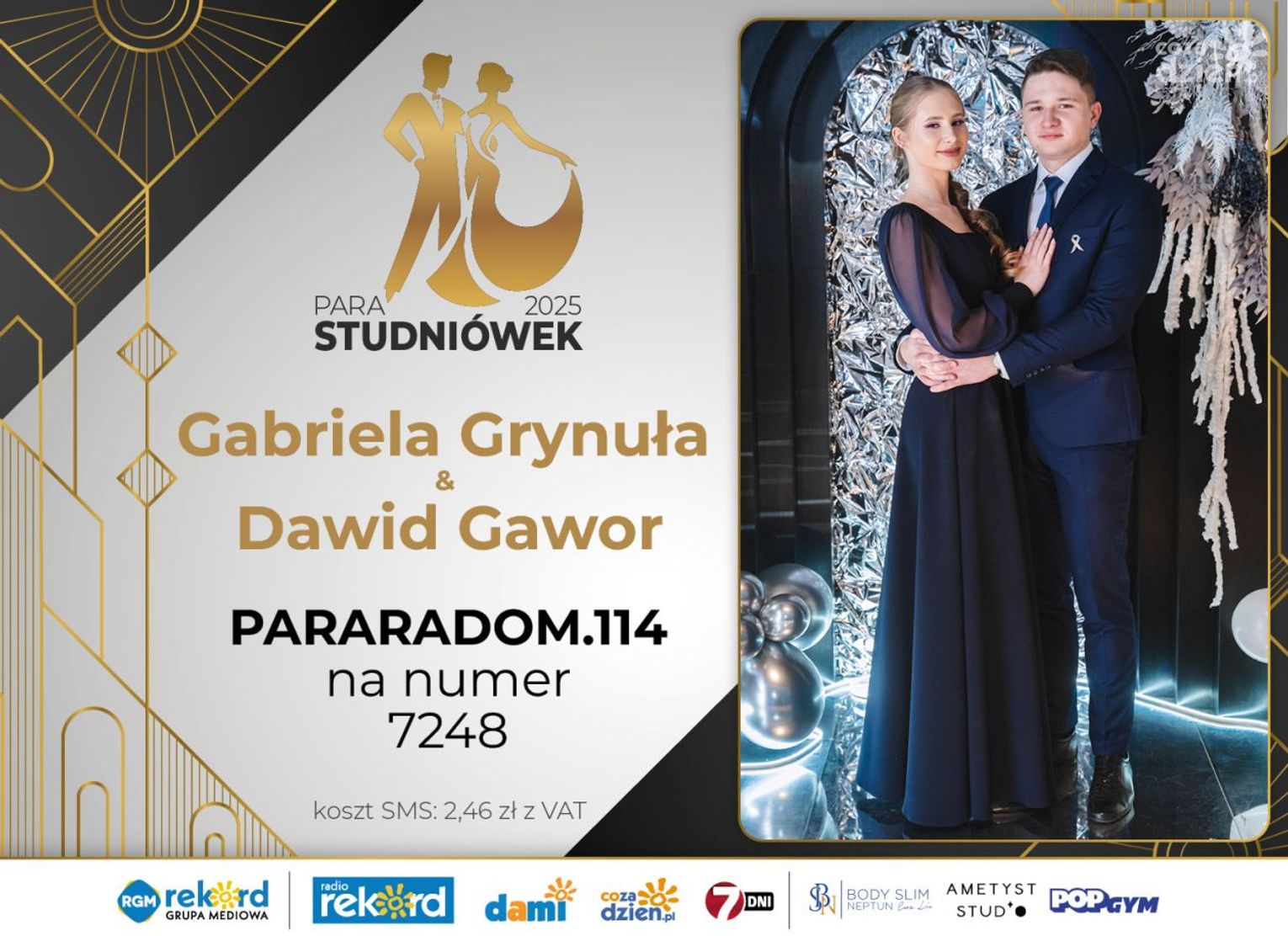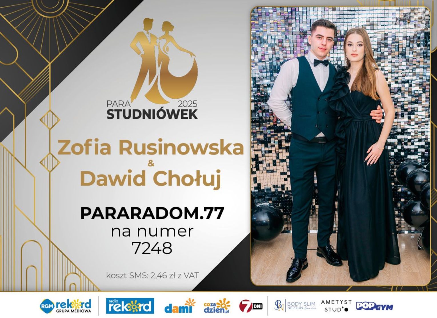 Wybór najpiękniejszej Pary Studniówek 2025 będzie przebiegał dwuetapowo. Pierwszym etapem plebiscytu będzie głosowanie za pomocą SMS-ów. Koszt jednej wiadomości SMS to 2zł + VAT. SMS wysyłamy na numer 7248. W treści SMS-a należy wpisać odpowiednio „PARARADOM” a za nim, po kropce przypisany numer, np. PARARADOM.1 Głosowanie rusza od 8 stycznia 2025 roku. Wyniki będzie można sprawdzać na bieżąco na portalu CoZaDzien.pl