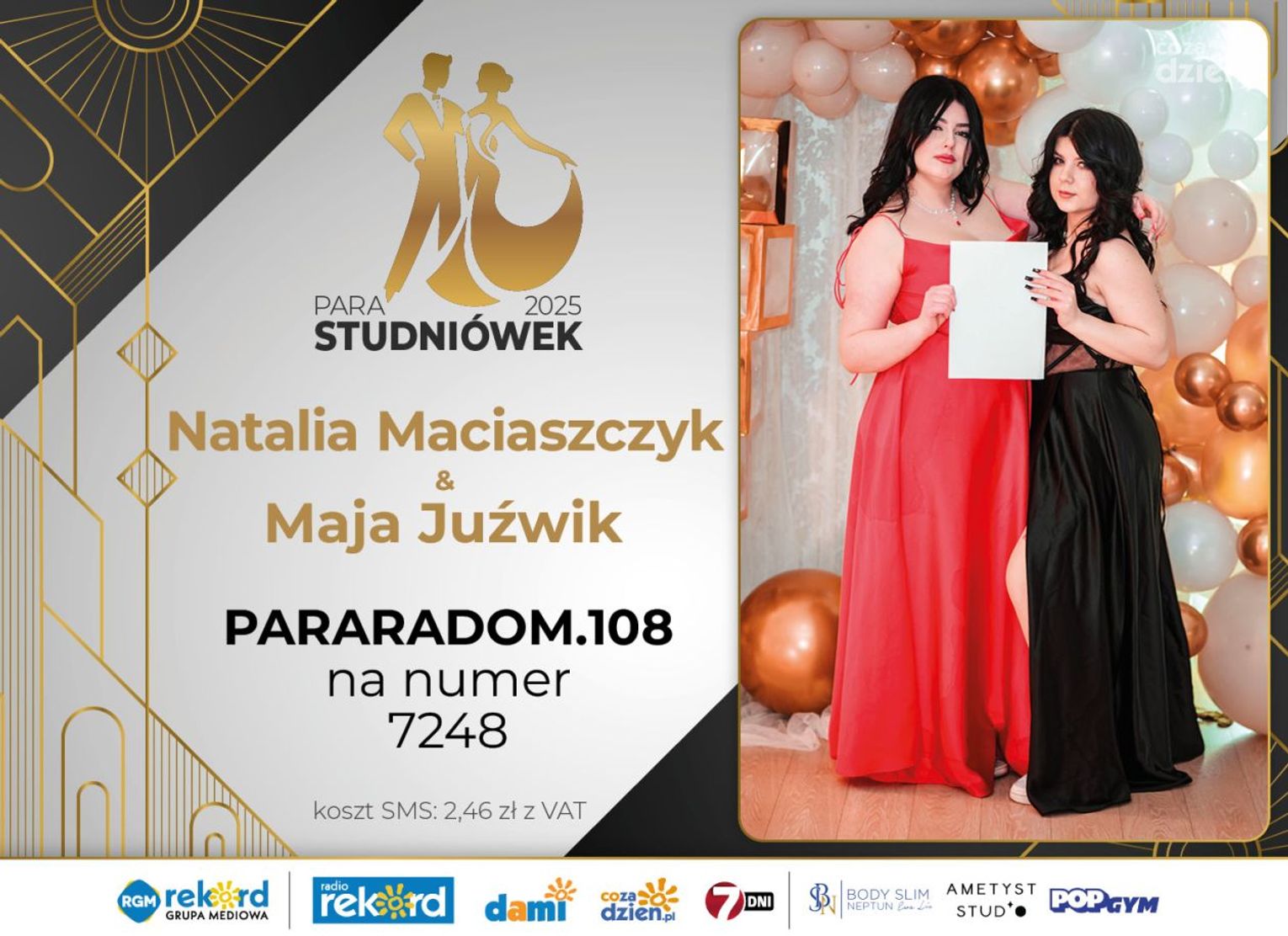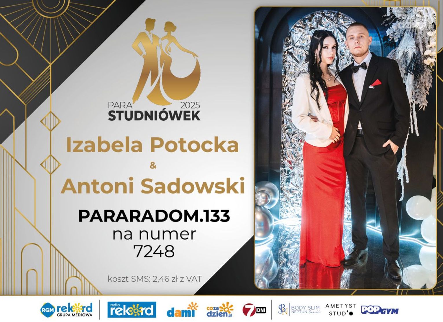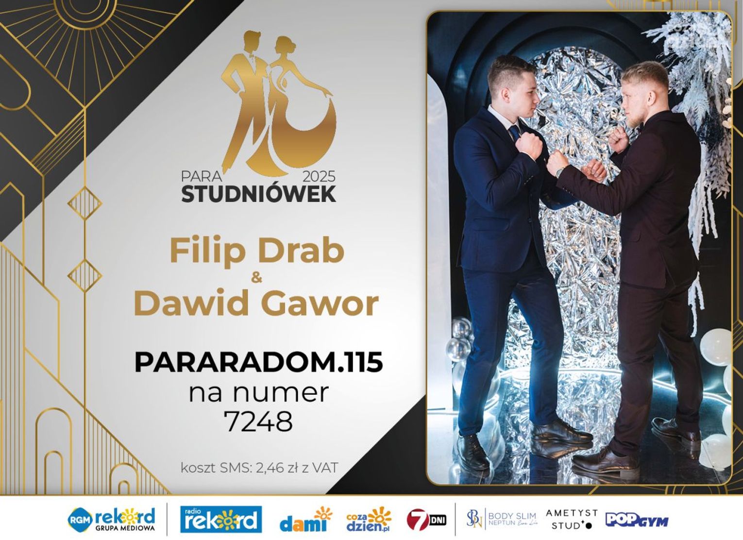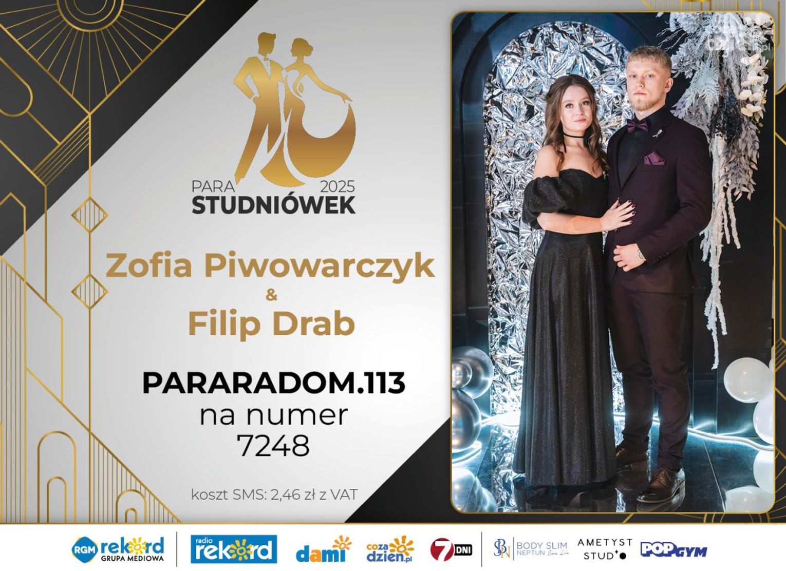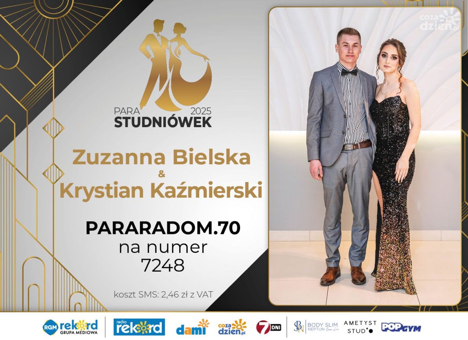 Wybór najpiękniejszej Pary Studniówek 2025 będzie przebiegał dwuetapowo. Pierwszym etapem plebiscytu będzie głosowanie za pomocą SMS-ów. Koszt jednej wiadomości SMS to 2zł + VAT. SMS wysyłamy na numer 7248. W treści SMS-a należy wpisać odpowiednio „PARARADOM” a za nim, po kropce przypisany numer, np. PARARADOM.1 Głosowanie rusza od 8 stycznia 2025 roku. Wyniki będzie można sprawdzać na bieżąco na portalu CoZaDzien.pl