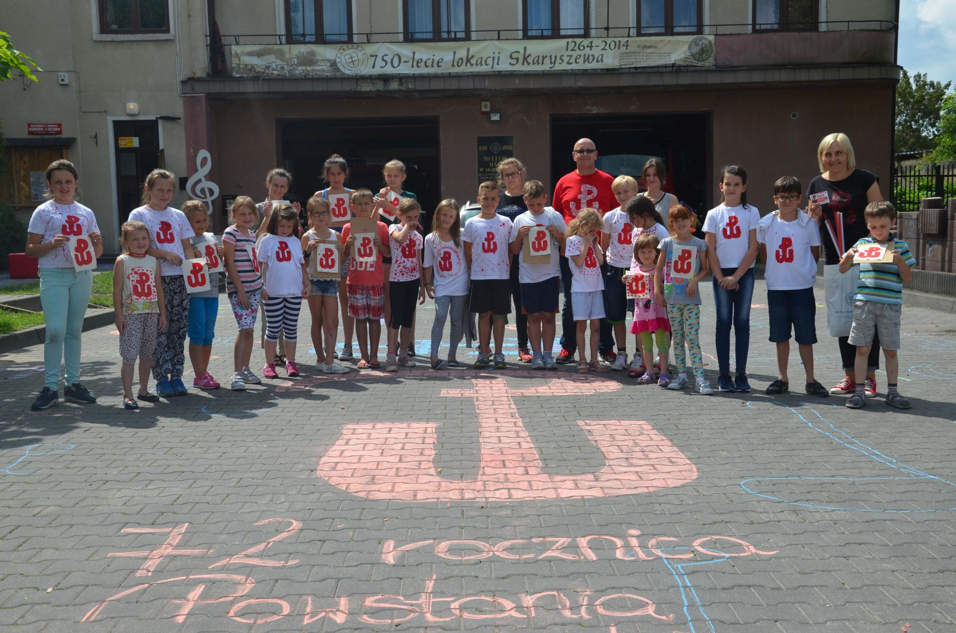 Później dzieci przeniosły się przed MGOK i rysowały kredą znaki Powstania. Powstało mnóstwo kolorowych, różnorodnych kotwic według własnej inwencji rysujących. Na zakończenie każde z dzieci otrzymało zestaw powstańczych gadżetów: biało-czerwona opaskę odblaskową, specjalną, filcową naklejkę ze znakiem Polski Walczącej, które udało się pozyskać z radomskiej delegatury IPN.