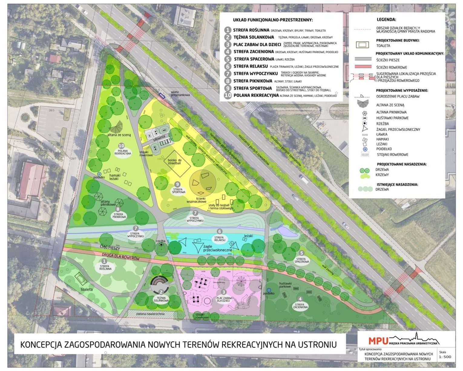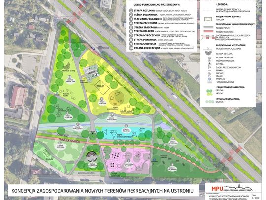 Koncepcja Miejskiej Pracowni Urbanistycznej zakłada stworzenie strefy relaksu, wypoczynku, spacerowej, piknikowej, roślinnej i sportowej, a także siłowni, ścianki wspinaczkowej, tężni solankowej, placu zabaw oraz sceny.
