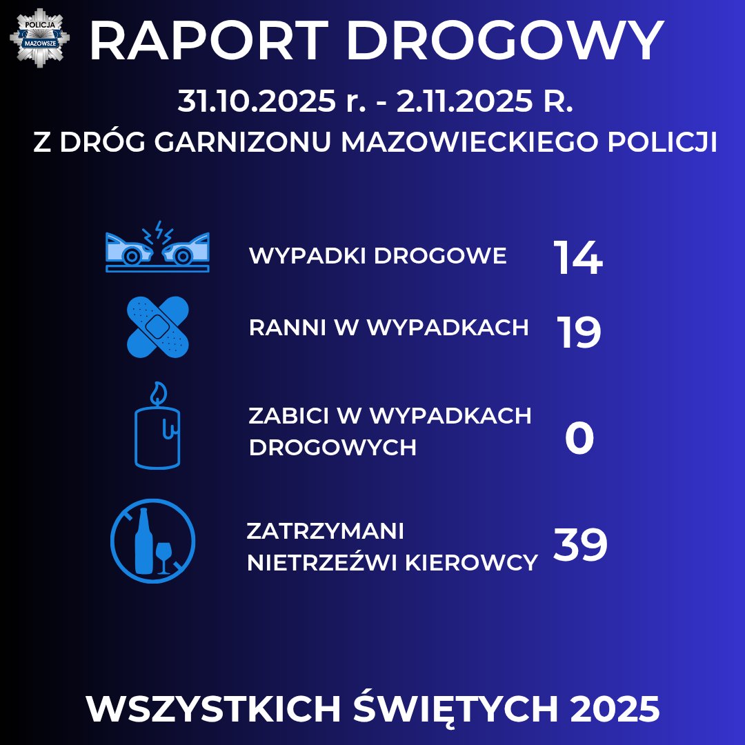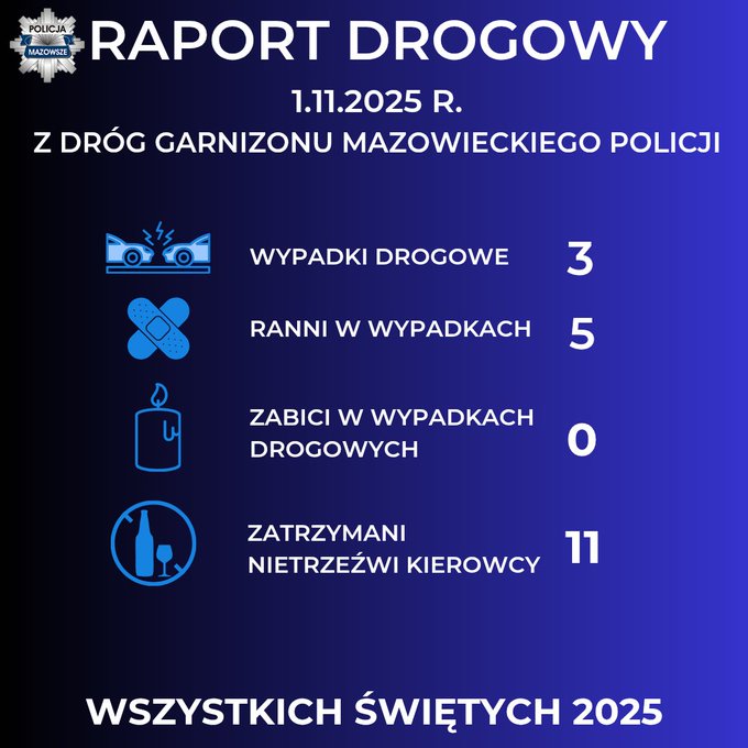 31 października na drogach garnizonu mazowieckiego doszło do 11 wypadków, w których 15 osób zostało rannych, a 10 kierowców zatrzymano za jazdę pod wpływem alkoholu. Ofiar śmiertelnych nie odnotowano.