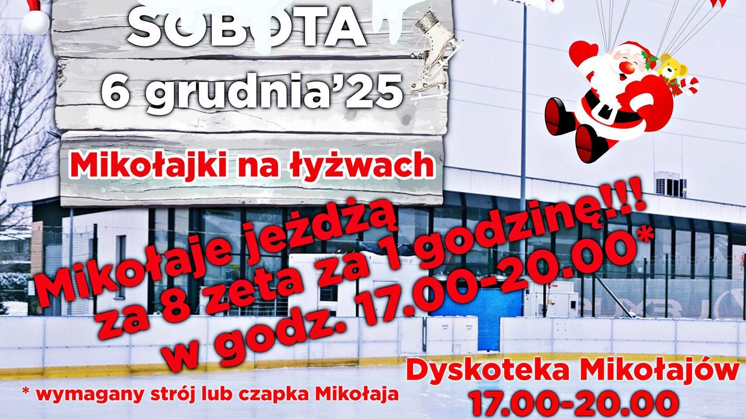 Każdy, kto na lodowisku przy Bulwarowej 19 pojawi się w stroju Mikołaja lub przynajmniej w czerwonej czapce, zapłaci za godzinę jazdy tylko 8 zł. Promocja obowiązuje wyłącznie w godzinach od 17 do 20.