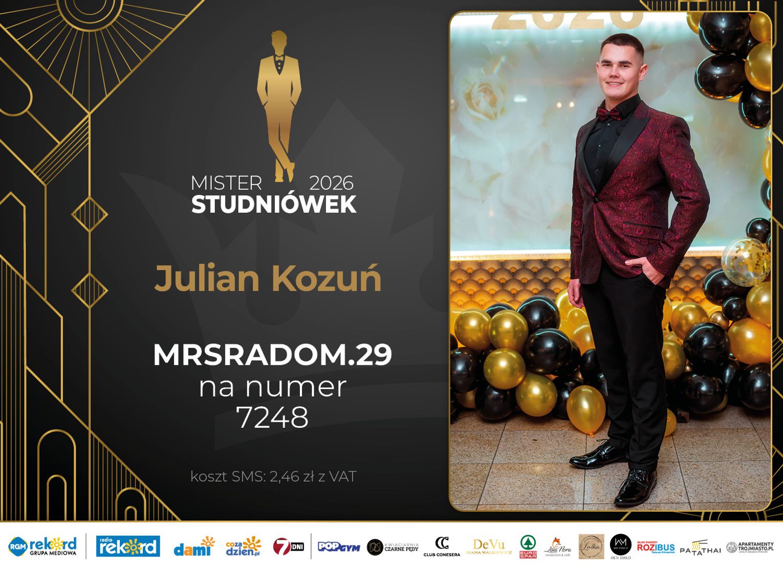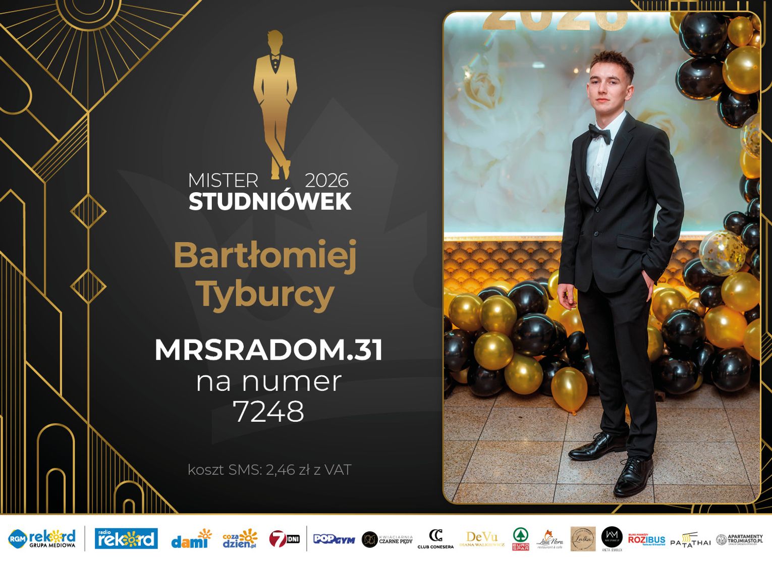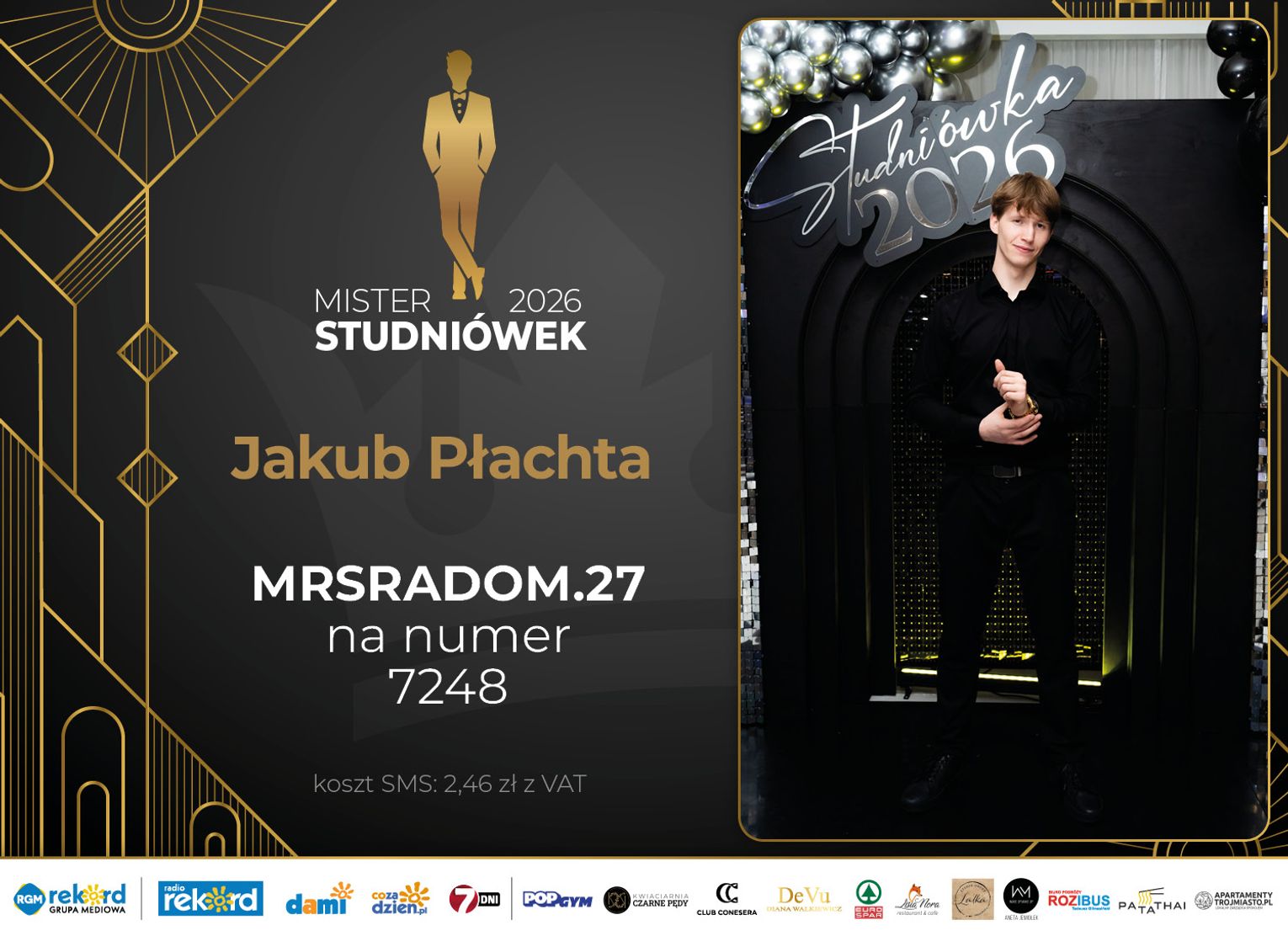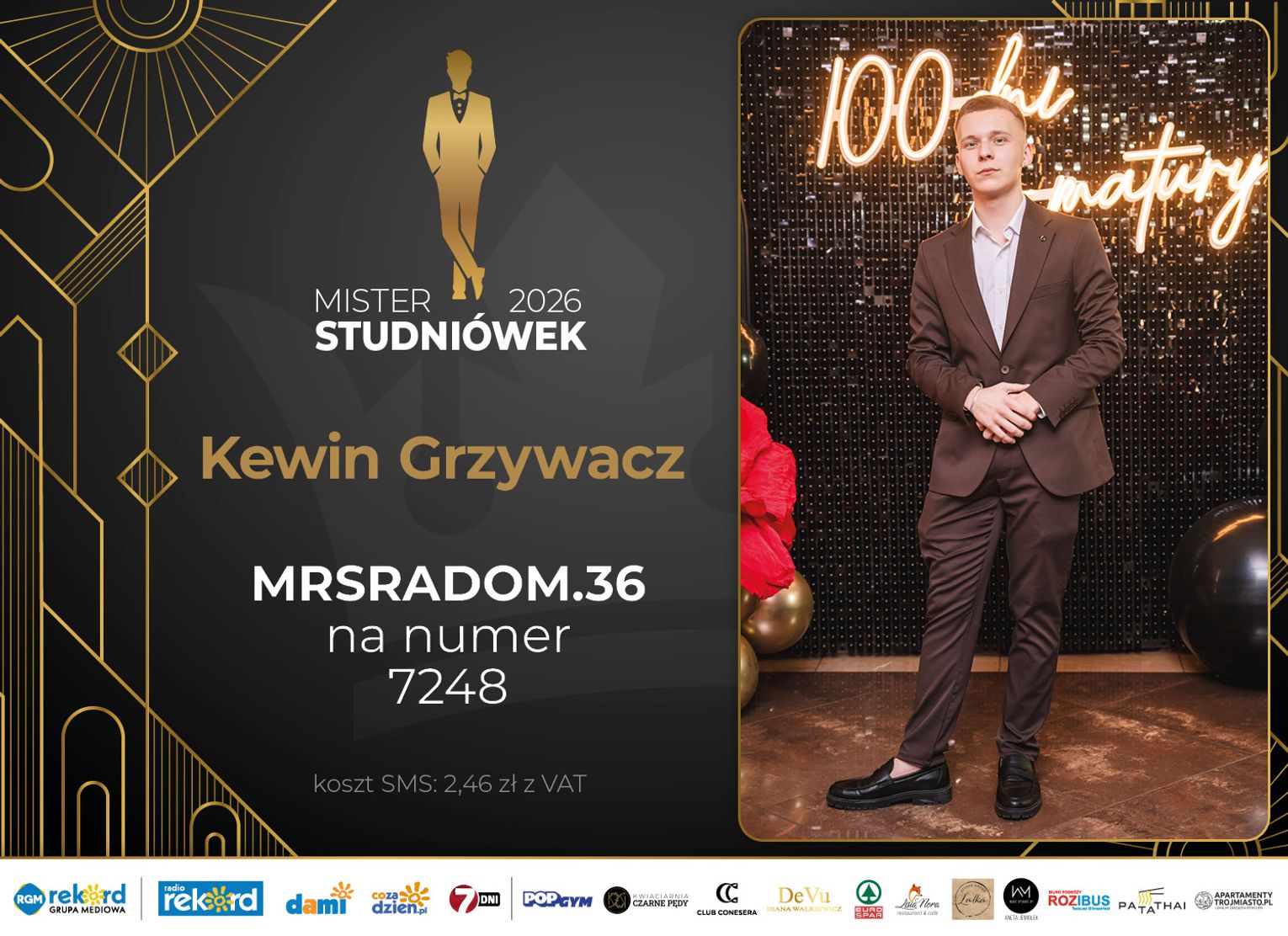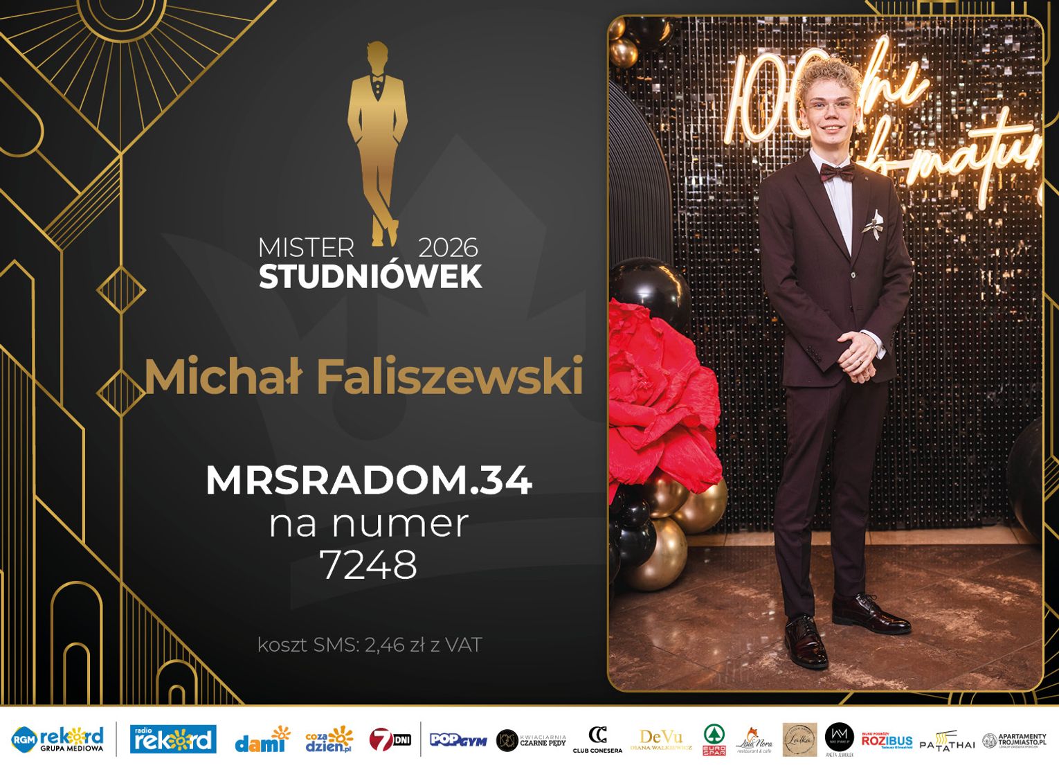Wybór Mistera Studniówek 2026 będzie przebiegał dwuetapowo. Pierwszym etapem plebiscytu będzie głosowanie za pomocą SMS-ów. Koszt jednej wiadomości SMS to 2zł + VAT. SMS wysyłamy na numer 7248. W treści SMS-a należy wpisać odpowiednio „MRSRADOM” a za nim, po kropce przypisany numer, np. MRSRADOM.1 Głosowanie rusza od 5 stycznia 2026 roku. Wyniki będzie można sprawdzać na bieżąco na portalu CoZaDzien.pl.