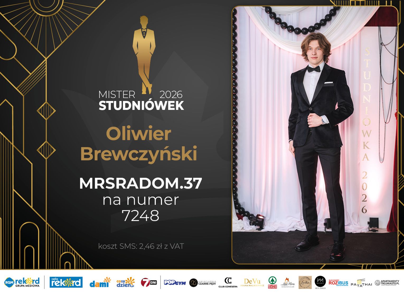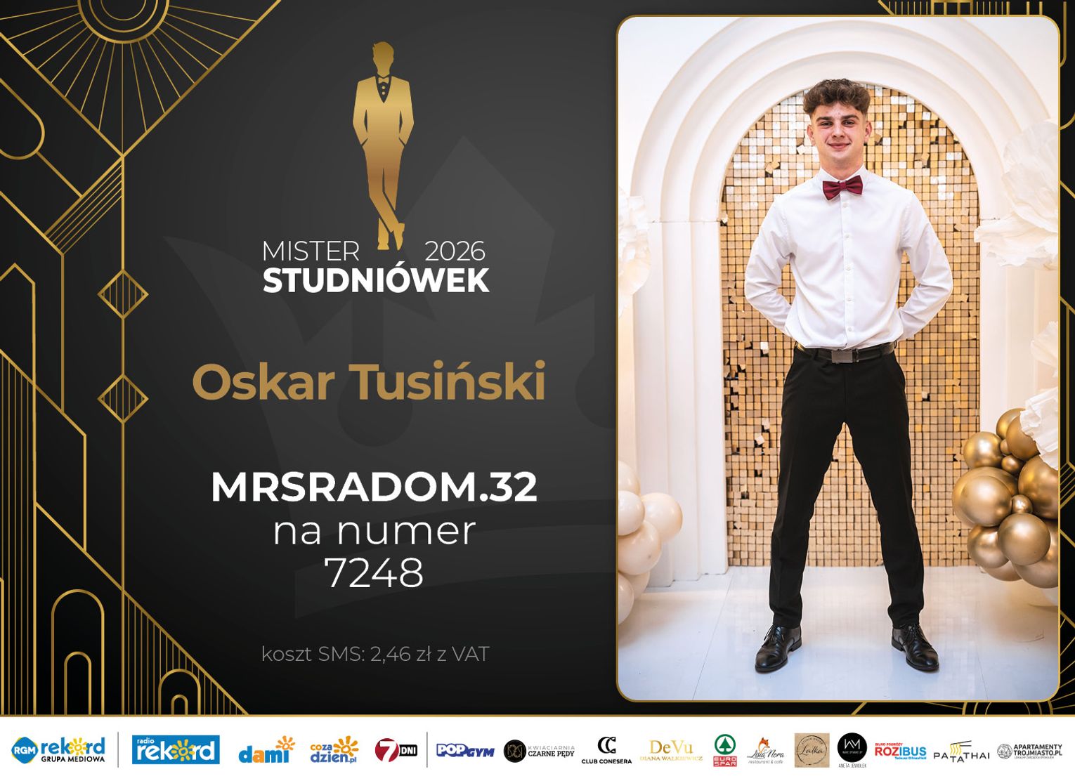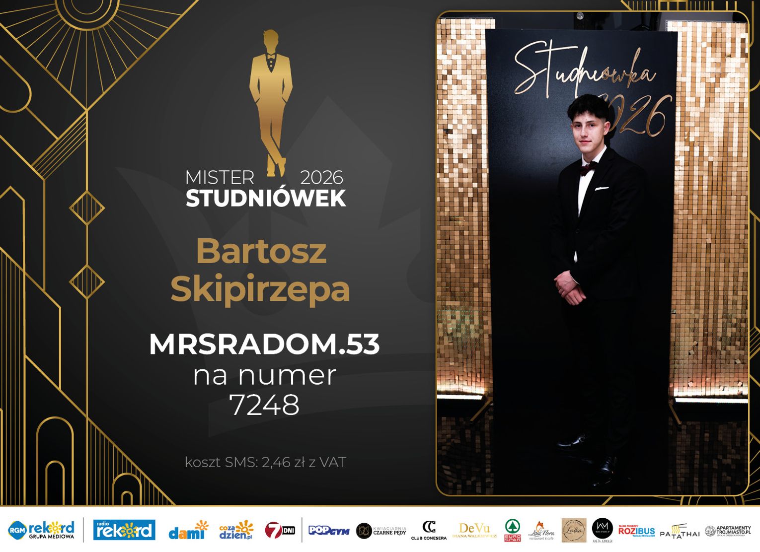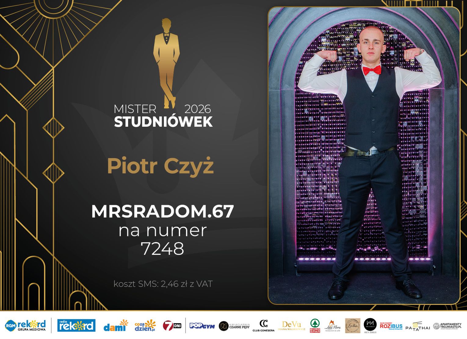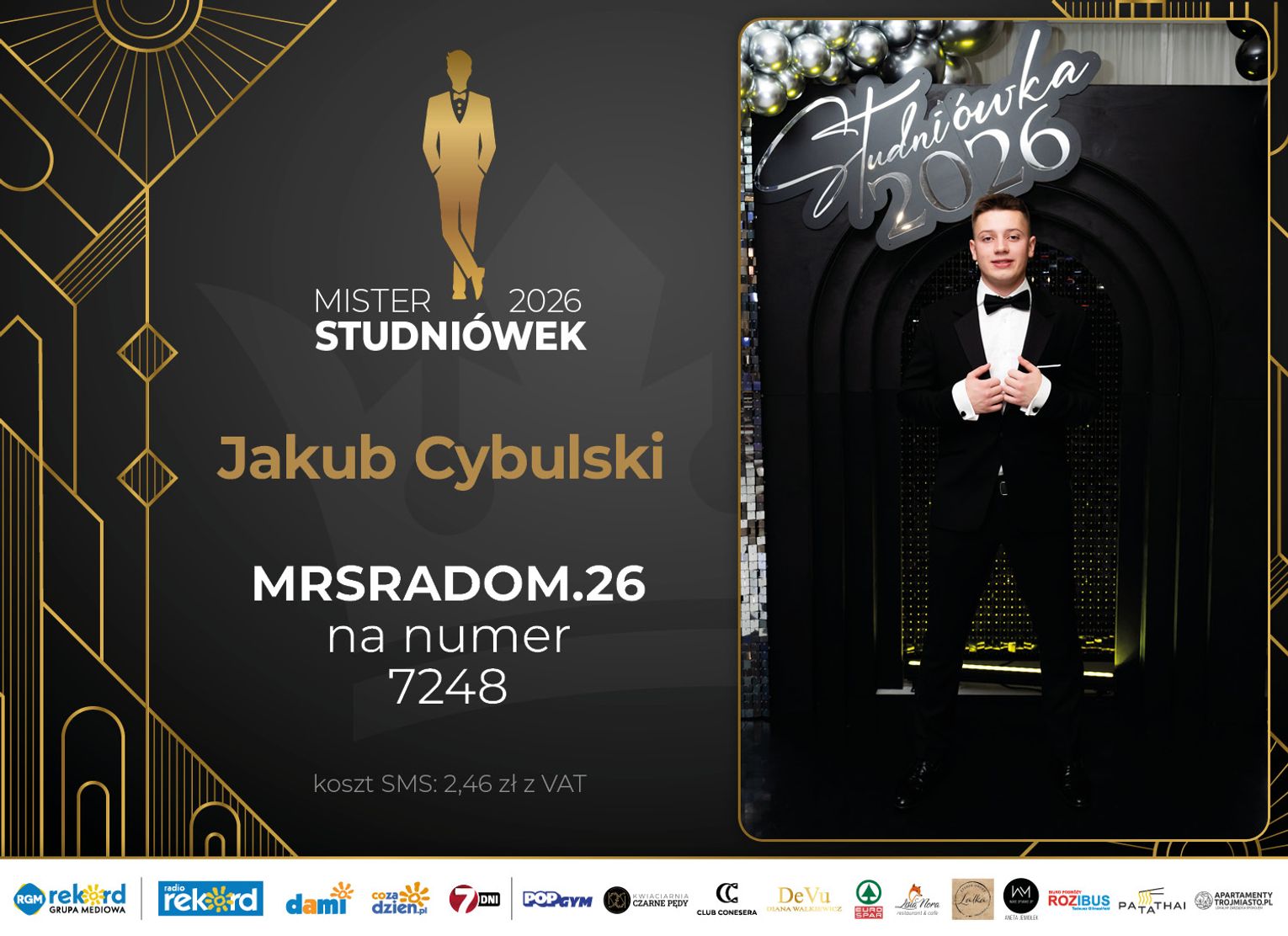 Wybór Mistera Studniówek 2026 będzie przebiegał dwuetapowo. Pierwszym etapem plebiscytu będzie głosowanie za pomocą SMS-ów. Koszt jednej wiadomości SMS to 2zł + VAT. SMS wysyłamy na numer 7248. W treści SMS-a należy wpisać odpowiednio „MRSRADOM” a za nim, po kropce przypisany numer, np. MRSRADOM.1 Głosowanie rusza od 5 stycznia 2026 roku. Wyniki będzie można sprawdzać na bieżąco na portalu CoZaDzien.pl.