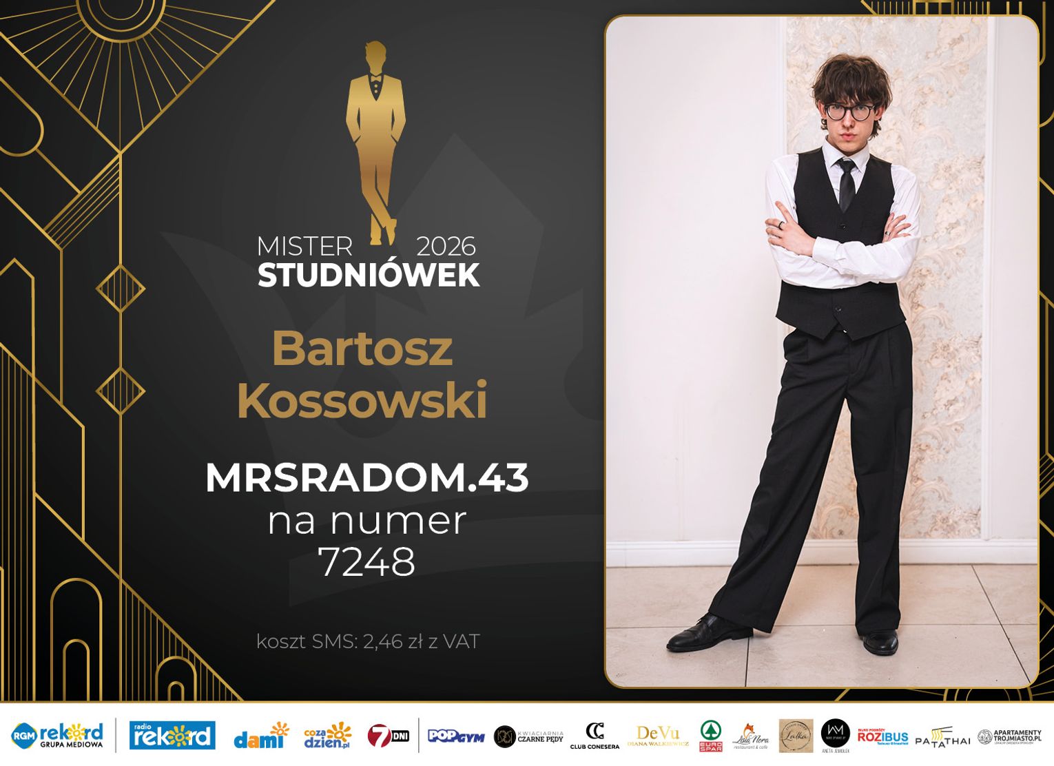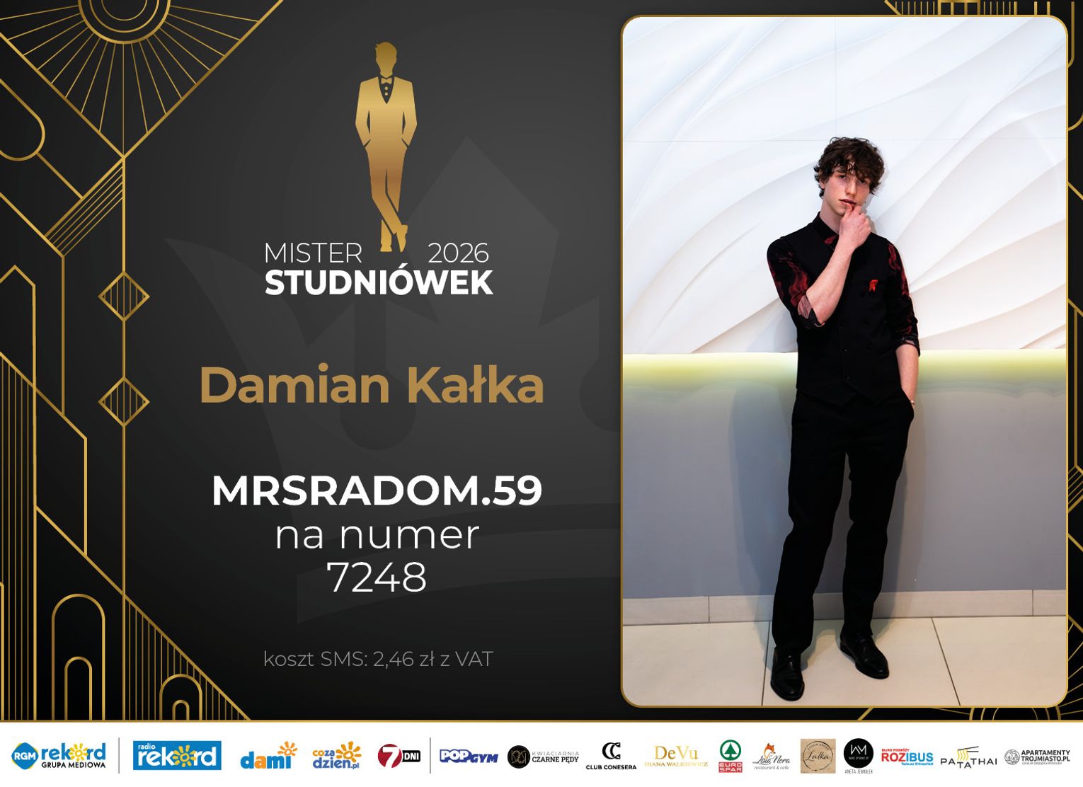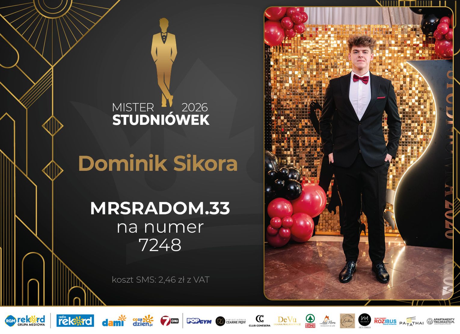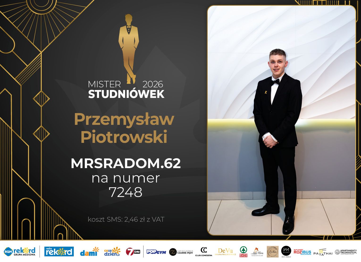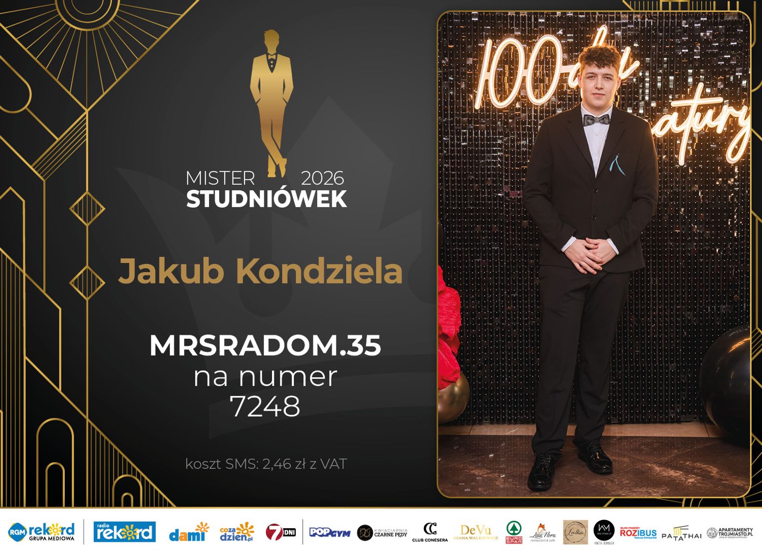 Wybór Mistera Studniówek 2026 będzie przebiegał dwuetapowo. Pierwszym etapem plebiscytu będzie głosowanie za pomocą SMS-ów. Koszt jednej wiadomości SMS to 2zł + VAT. SMS wysyłamy na numer 7248. W treści SMS-a należy wpisać odpowiednio „MRSRADOM” a za nim, po kropce przypisany numer, np. MRSRADOM.1 Głosowanie rusza od 5 stycznia 2026 roku. Wyniki będzie można sprawdzać na bieżąco na portalu CoZaDzien.pl.