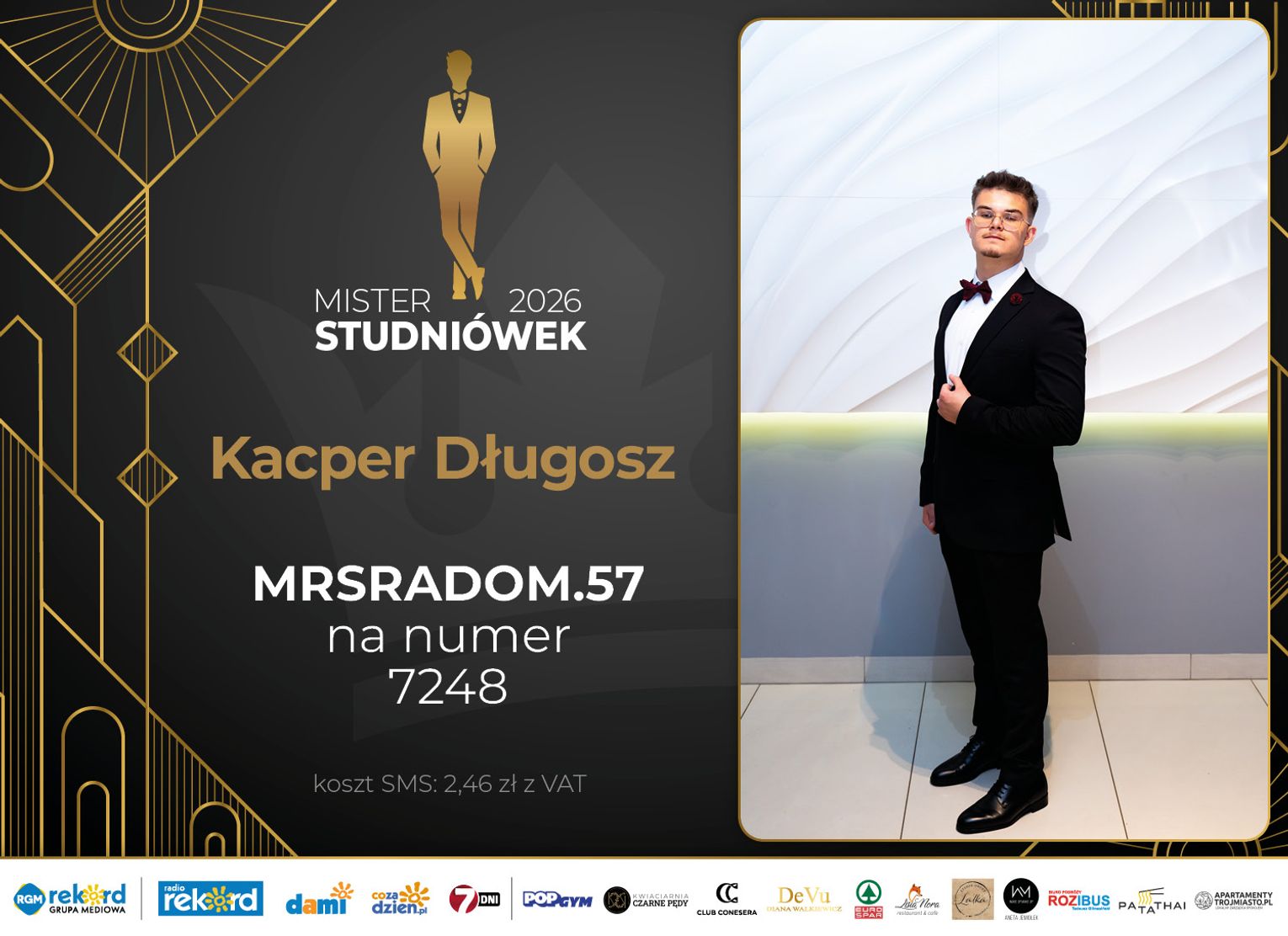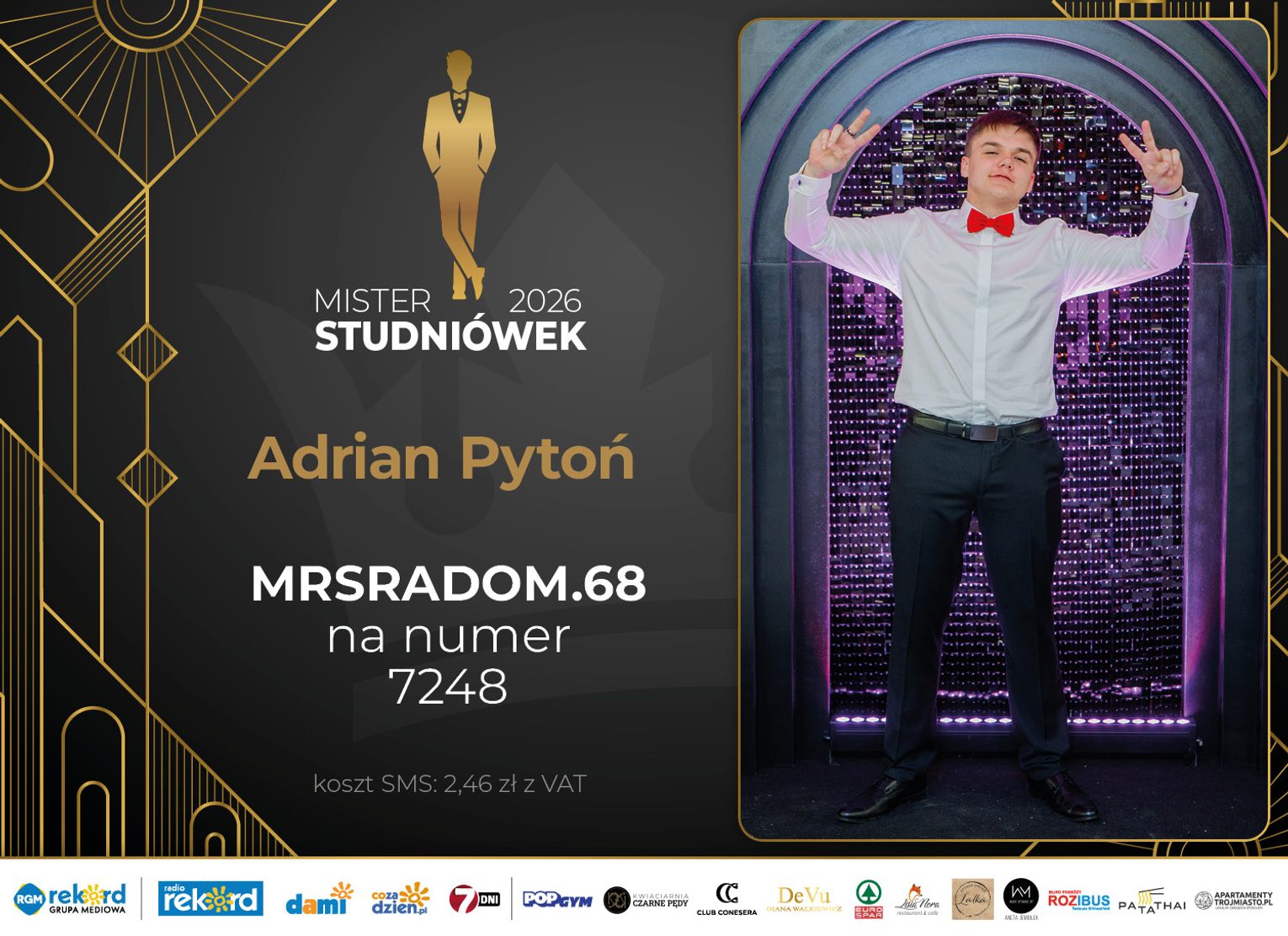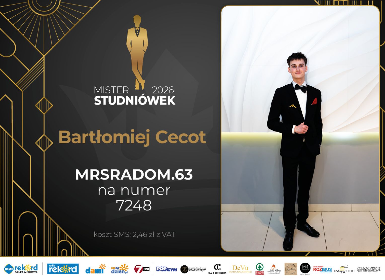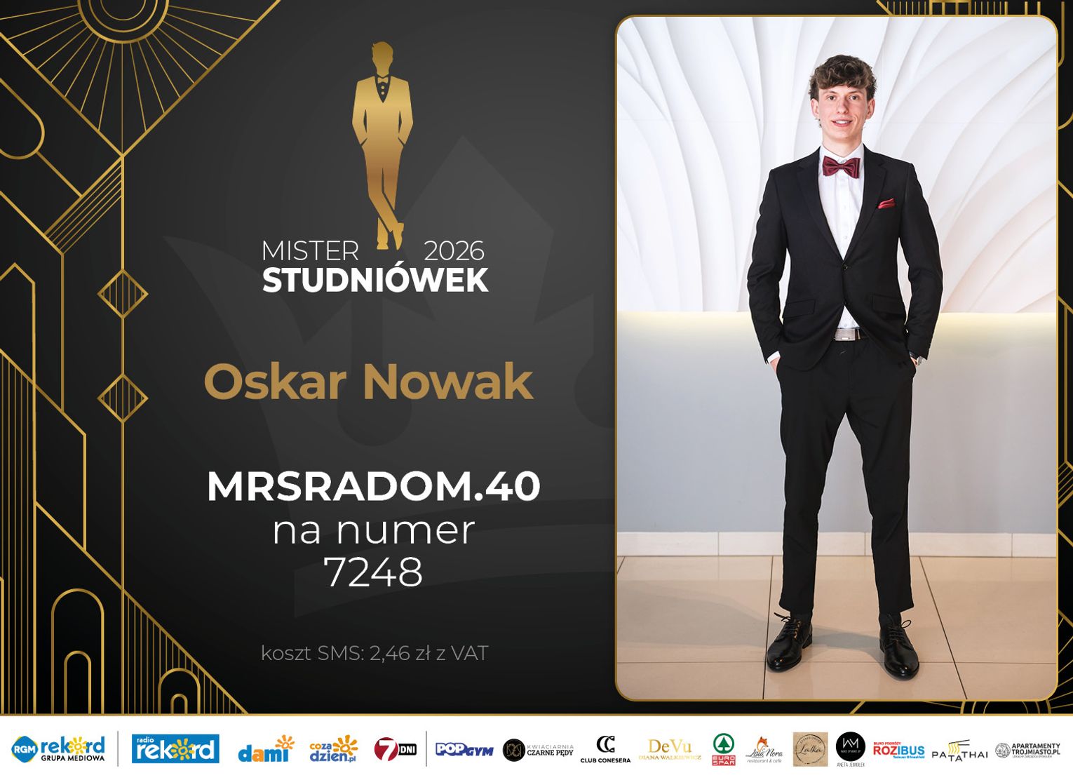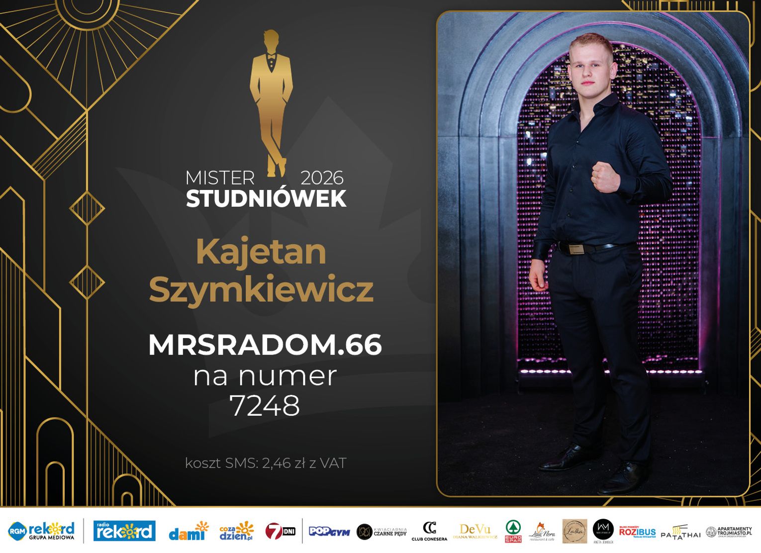 Wybór Mistera Studniówek 2026 będzie przebiegał dwuetapowo. Pierwszym etapem plebiscytu będzie głosowanie za pomocą SMS-ów. Koszt jednej wiadomości SMS to 2zł + VAT. SMS wysyłamy na numer 7248. W treści SMS-a należy wpisać odpowiednio „MRSRADOM” a za nim, po kropce przypisany numer, np. MRSRADOM.1 Głosowanie rusza od 5 stycznia 2026 roku. Wyniki będzie można sprawdzać na bieżąco na portalu CoZaDzien.pl.