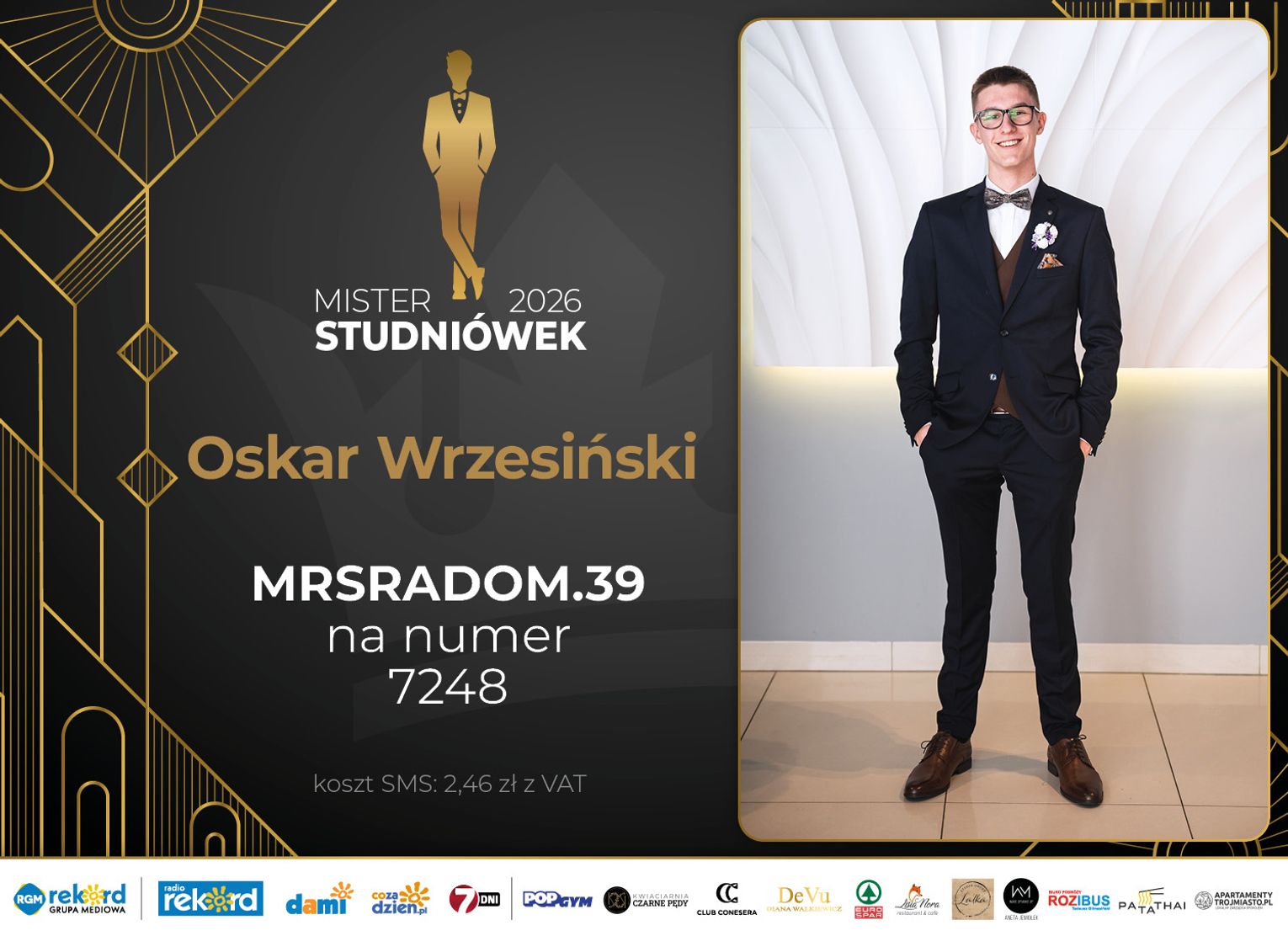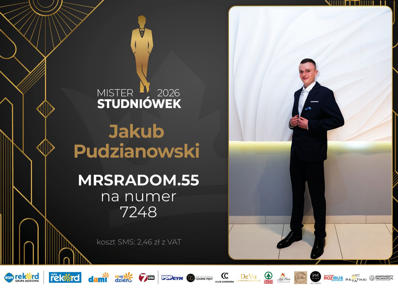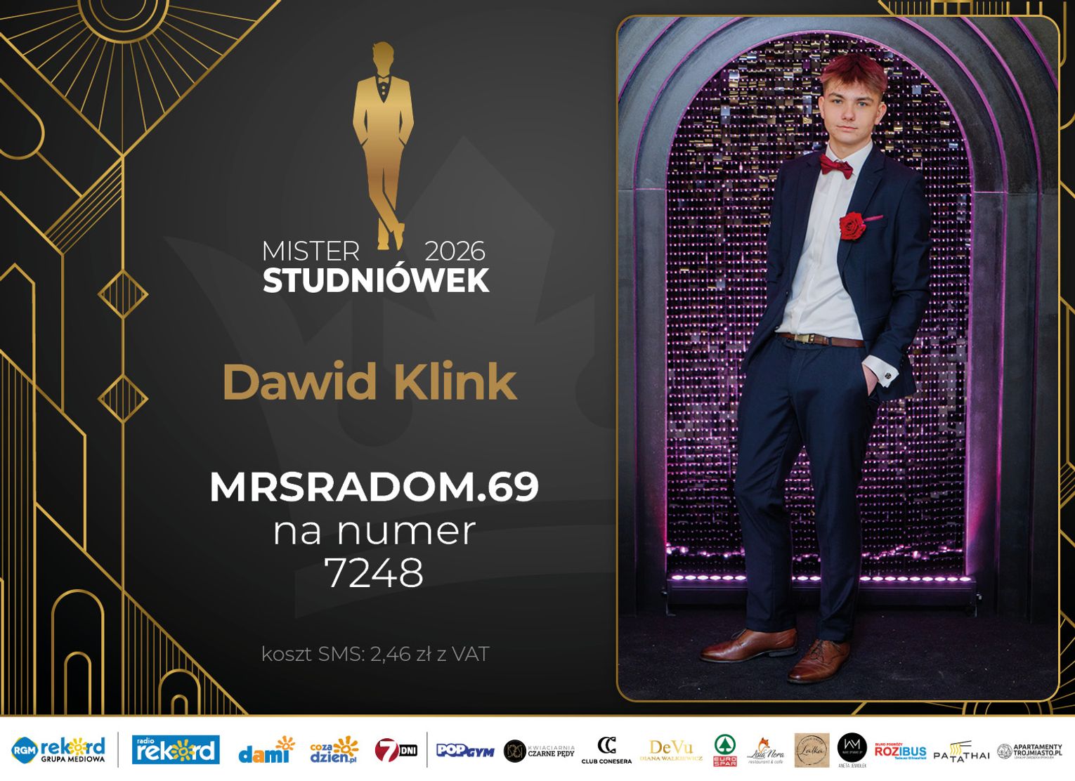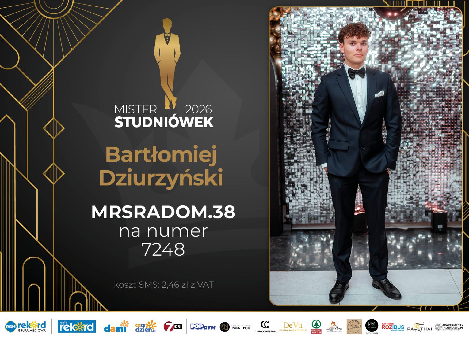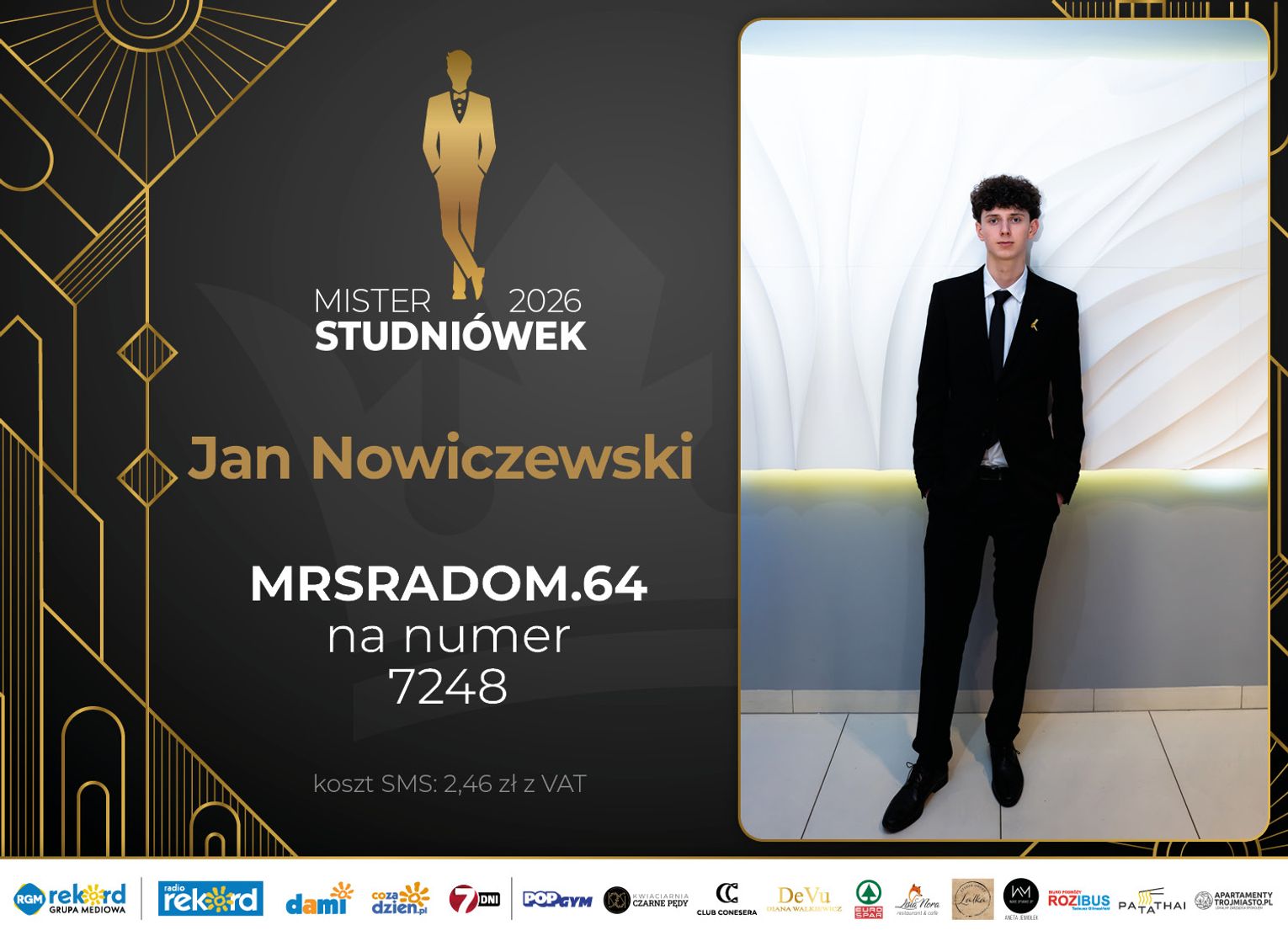 Wybór Mistera Studniówek 2026 będzie przebiegał dwuetapowo. Pierwszym etapem plebiscytu będzie głosowanie za pomocą SMS-ów. Koszt jednej wiadomości SMS to 2zł + VAT. SMS wysyłamy na numer 7248. W treści SMS-a należy wpisać odpowiednio „MRSRADOM” a za nim, po kropce przypisany numer, np. MRSRADOM.1 Głosowanie rusza od 5 stycznia 2026 roku. Wyniki będzie można sprawdzać na bieżąco na portalu CoZaDzien.pl.