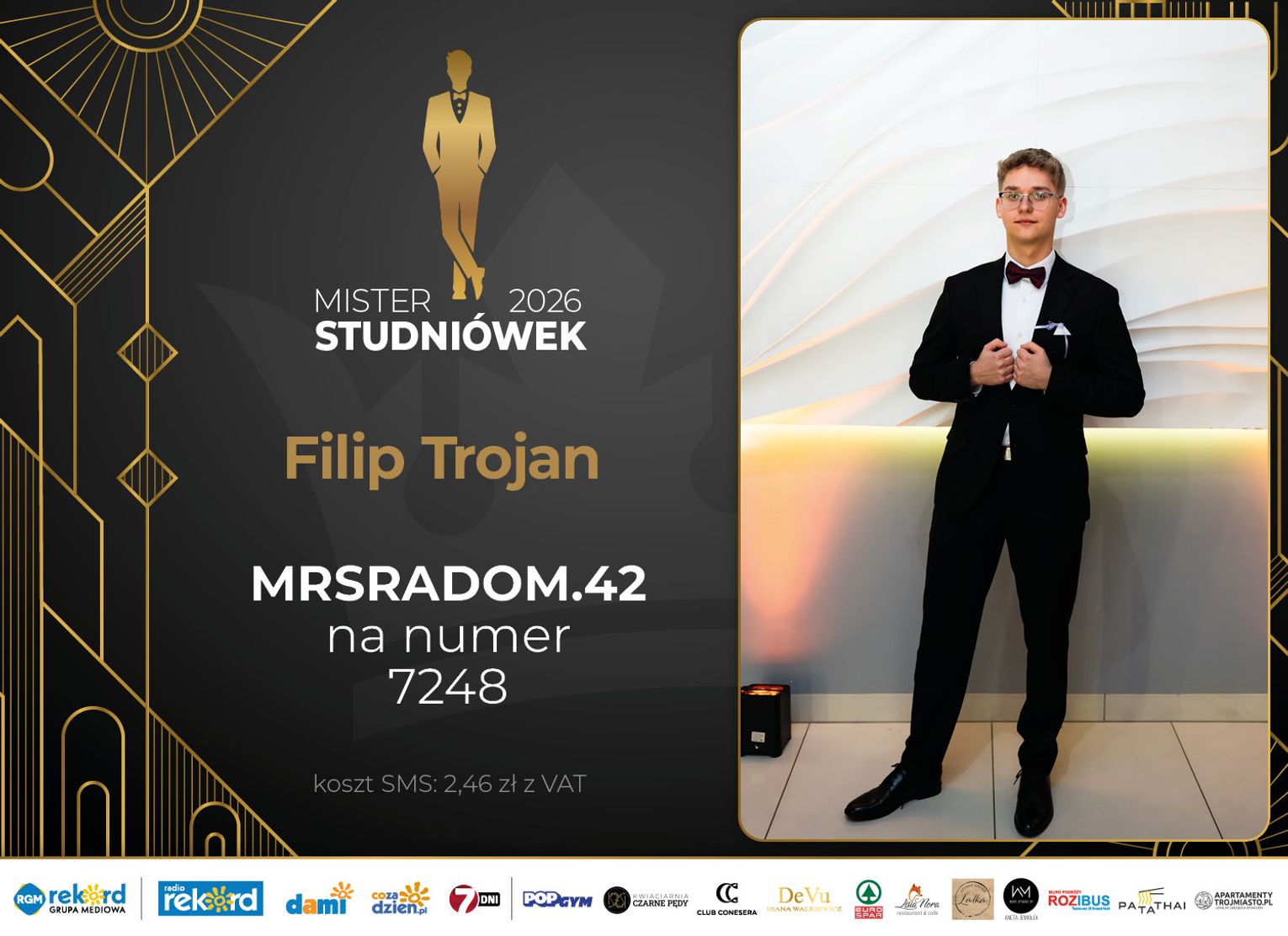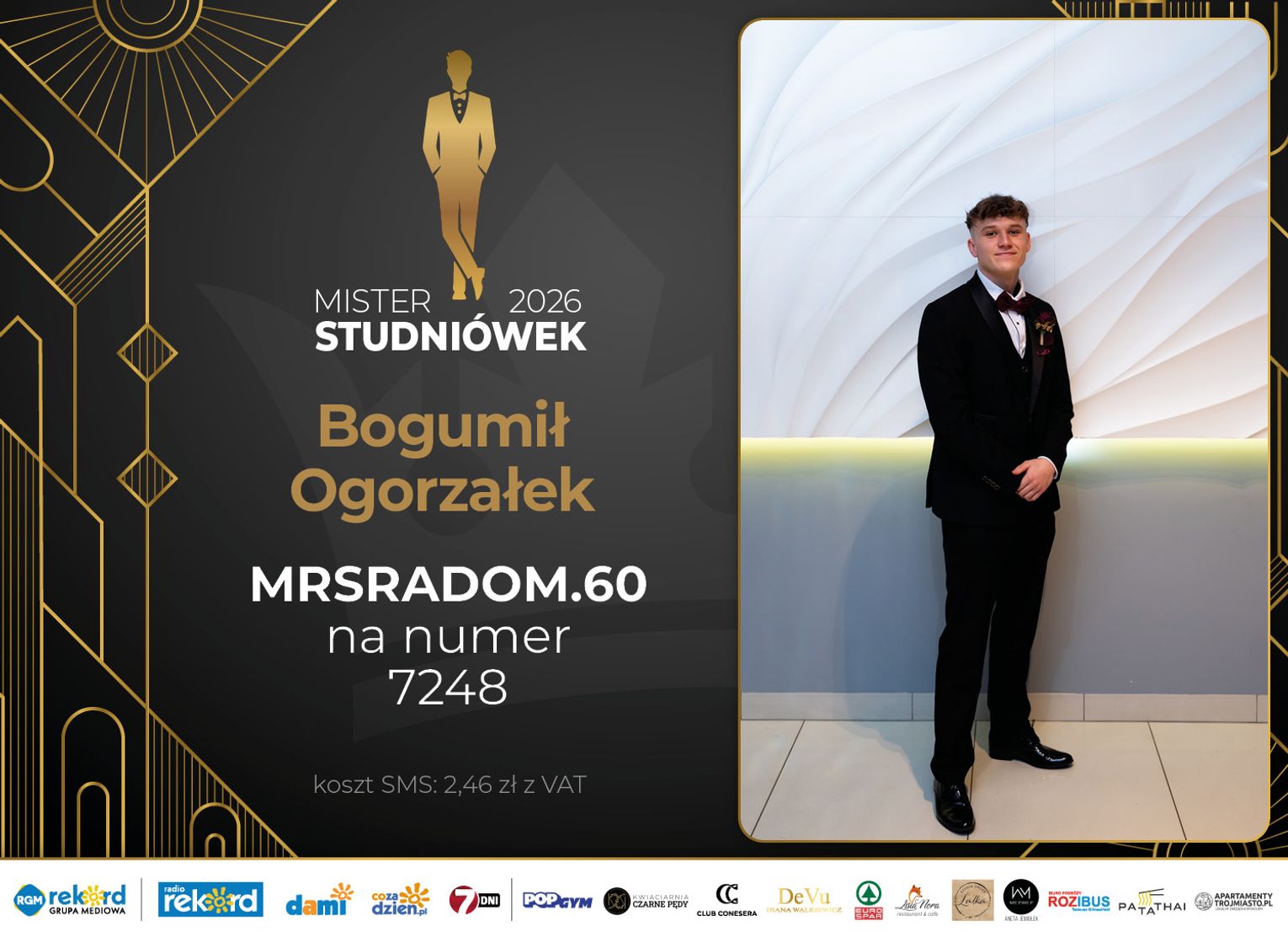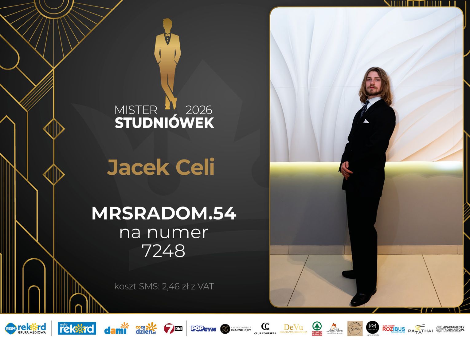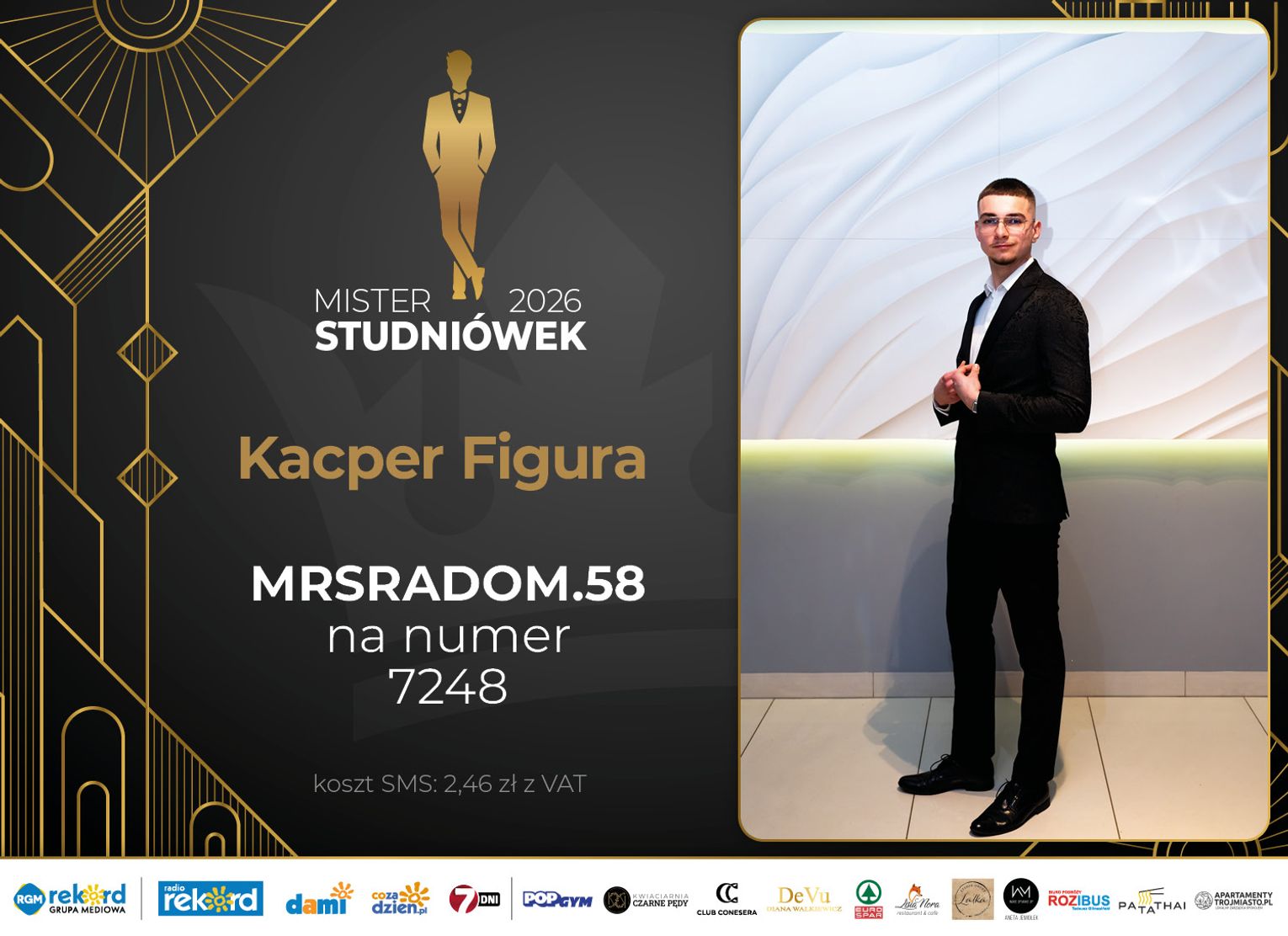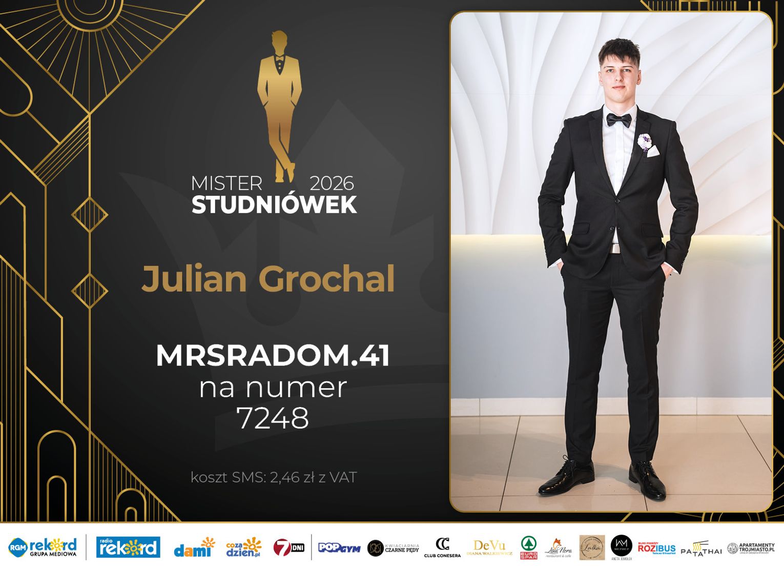 Wybór Mistera Studniówek 2026 będzie przebiegał dwuetapowo. Pierwszym etapem plebiscytu będzie głosowanie za pomocą SMS-ów. Koszt jednej wiadomości SMS to 2zł + VAT. SMS wysyłamy na numer 7248. W treści SMS-a należy wpisać odpowiednio „MRSRADOM” a za nim, po kropce przypisany numer, np. MRSRADOM.1 Głosowanie rusza od 5 stycznia 2026 roku. Wyniki będzie można sprawdzać na bieżąco na portalu CoZaDzien.pl.