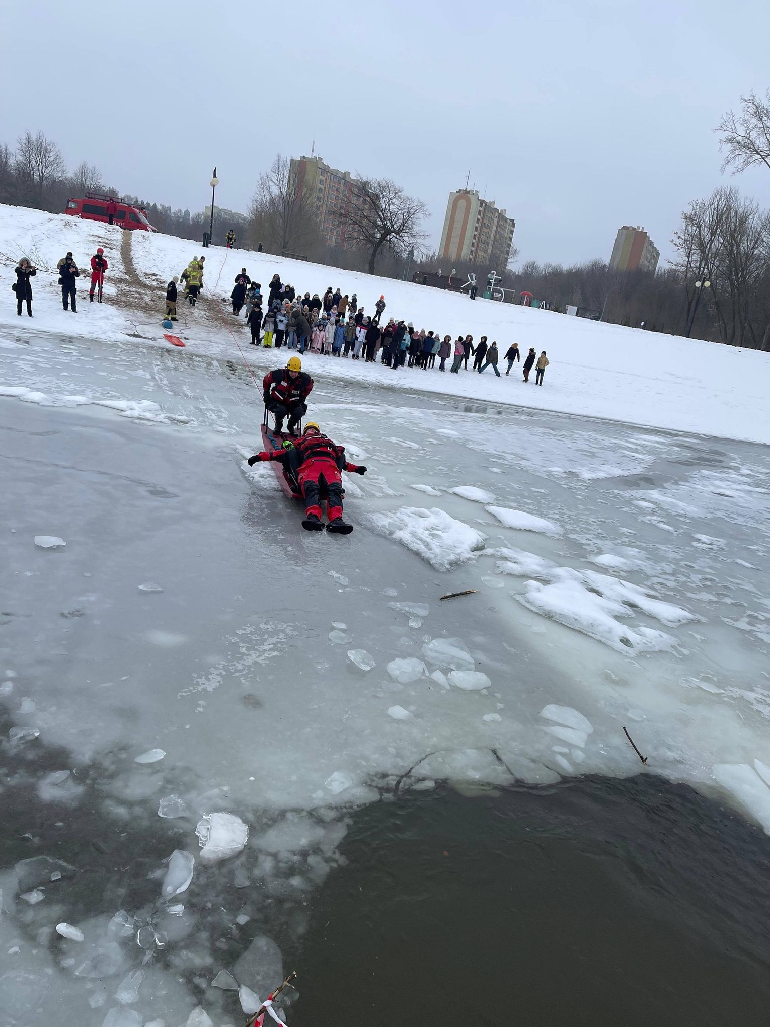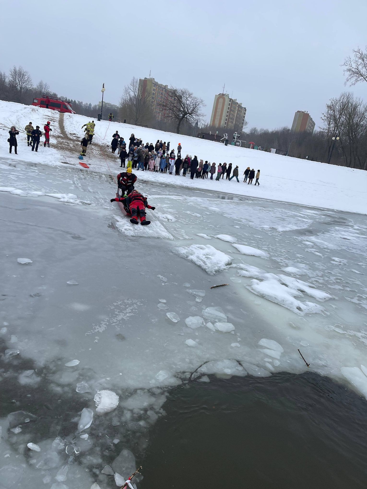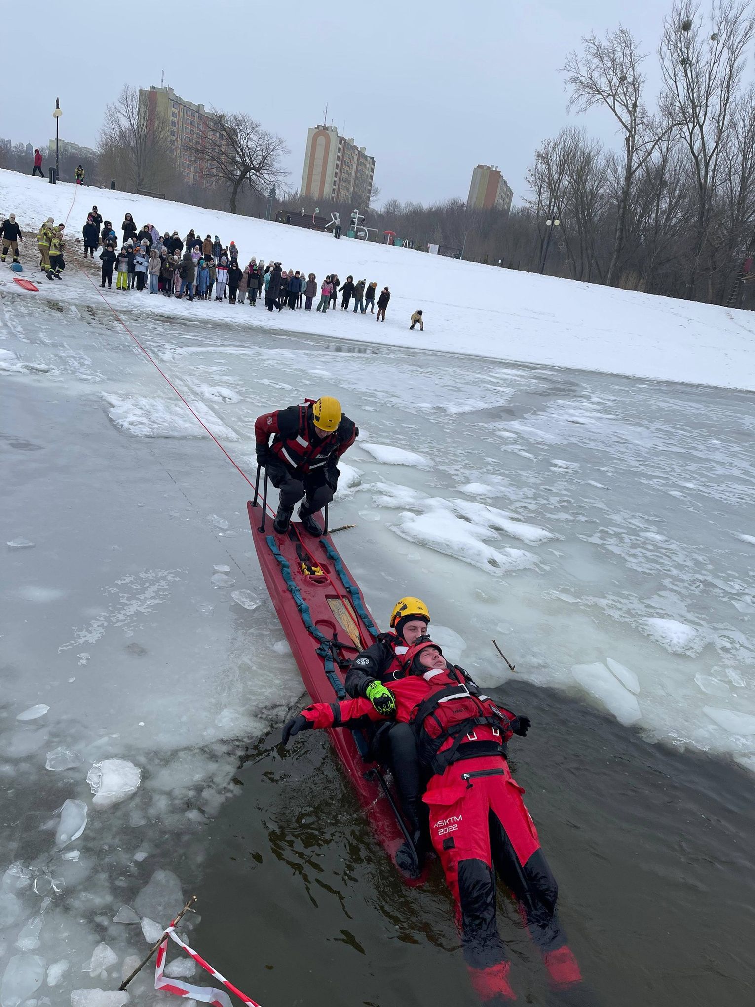 Po części teoretycznej, która przerodziła się w interesującą dyskusję z uczniami, przyszedł czas na praktykę. Uwieńczeniem spotkania były pokazy udzielania pomocy osobie, pod którą załamał się lód. W tę część akcji zaangażowali się również strażacy z Komendy Miejskiej Państwowej Straży Pożarnej w Radomiu, którzy prowadzili w tym czasie własne działania nad tym samym akwenem.
