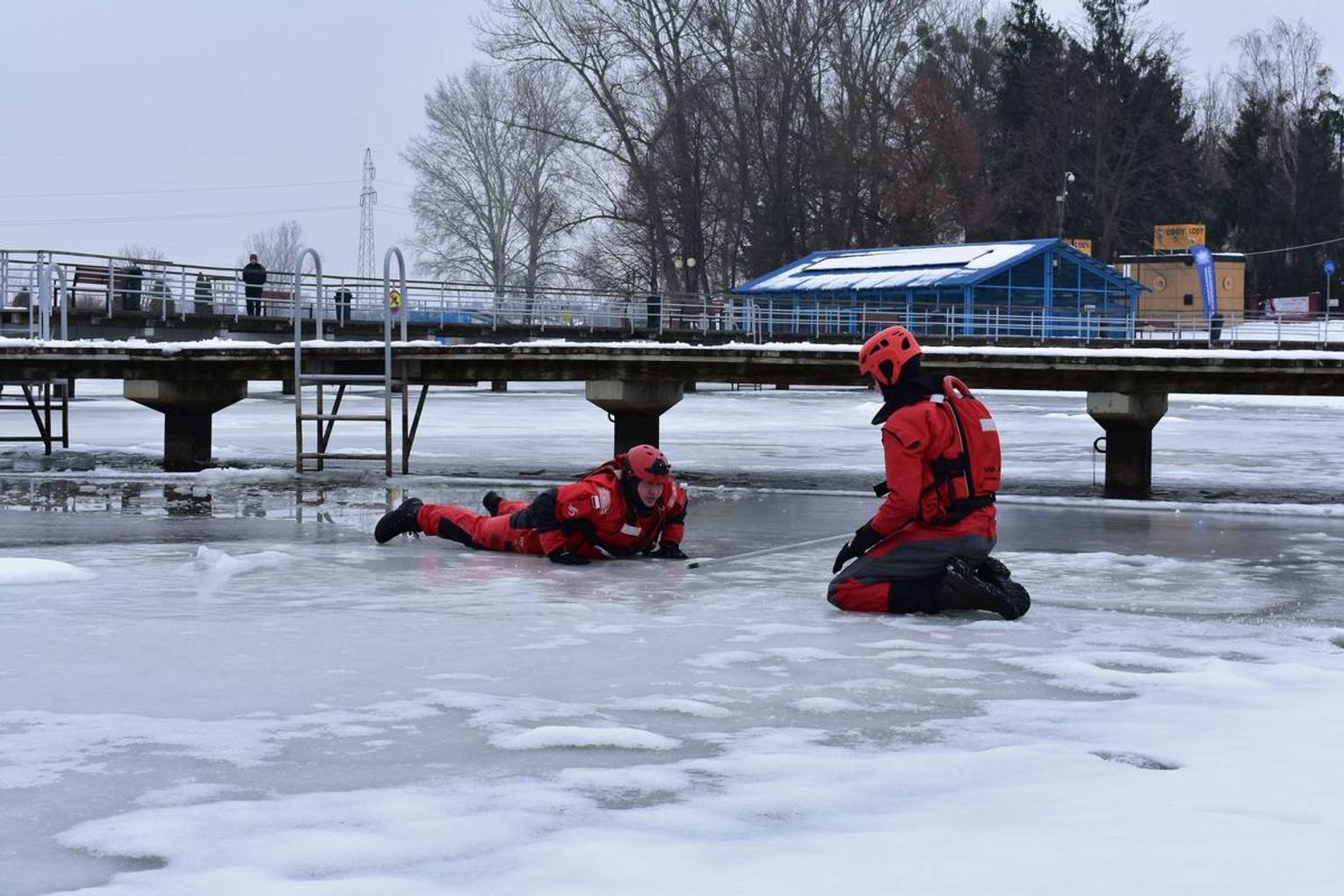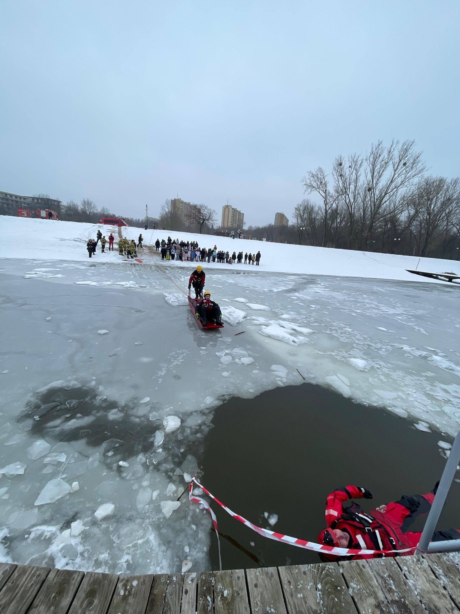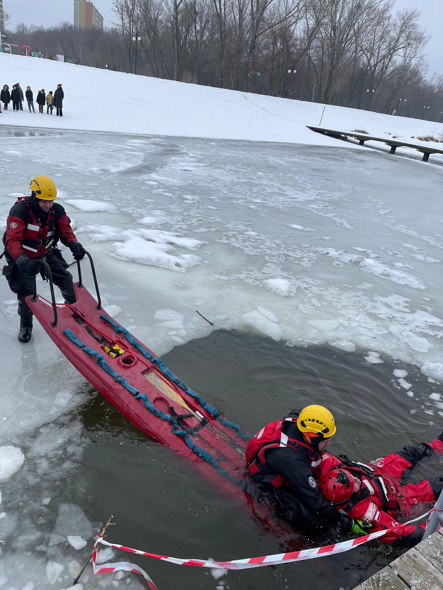 Po części teoretycznej, która przerodziła się w interesującą dyskusję z uczniami, przyszedł czas na praktykę. Uwieńczeniem spotkania były pokazy udzielania pomocy osobie, pod którą załamał się lód. W tę część akcji zaangażowali się również strażacy z Komendy Miejskiej Państwowej Straży Pożarnej w Radomiu, którzy prowadzili w tym czasie własne działania nad tym samym akwenem.