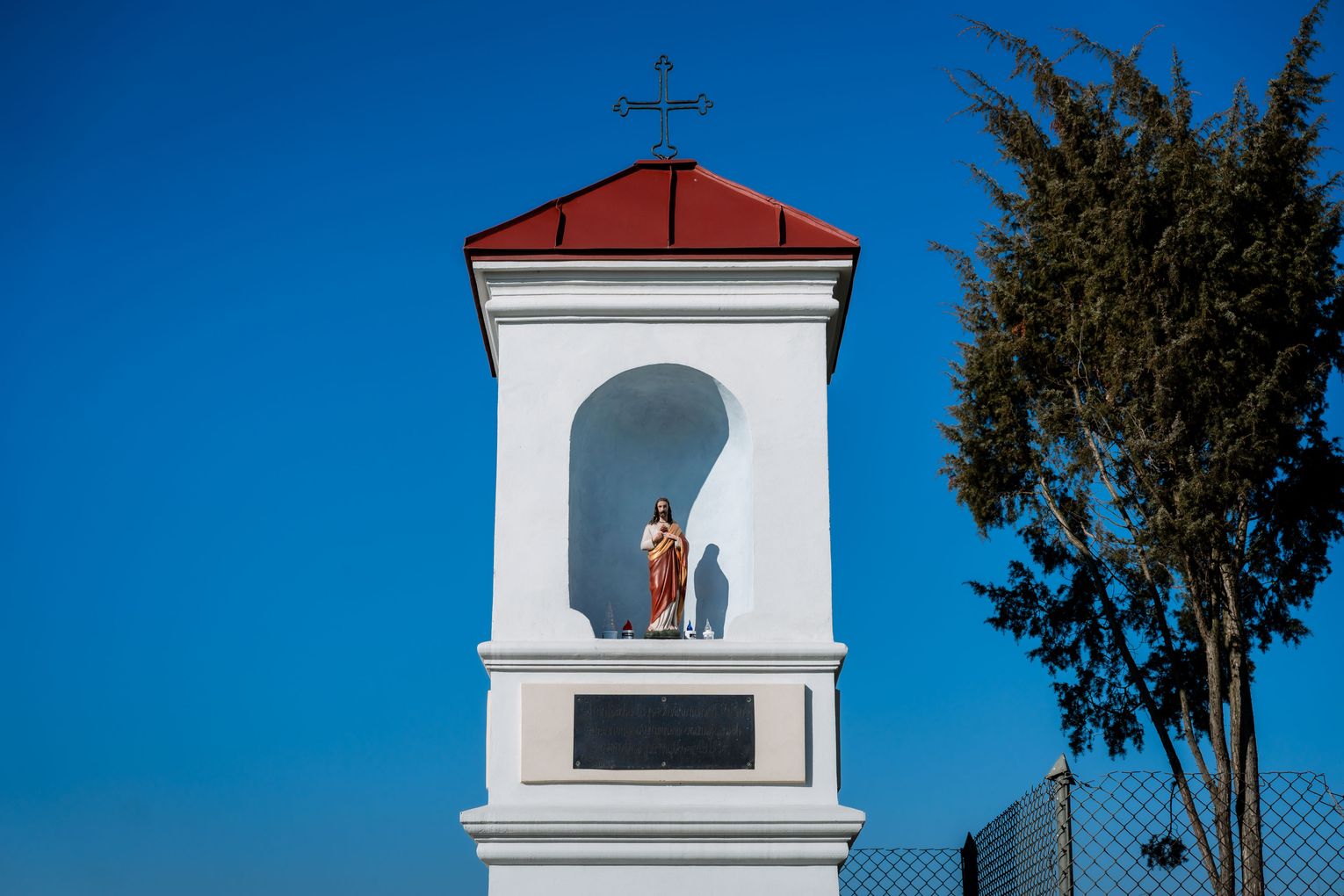 Tablica inskrypcyjna powstała w pracowni Kazimierza Szorca (1874-1955). Niewykluczone – jak czytamy w „Retropedii Radomia” - że to jedna z jego pierwszych radomskich prac, w „Kalendarzu adresowym rzemieślników chrześcijan w Radomiu na rok przestępny 1904” mowa jest bowiem o nowo otworzonej przy ul. Lubelskiej 27 Warszawskiej Artystyczno-Grawerskiej Pracowni Kazimierza Szorca. W 2015 roku tablica została skradziona. Po nagłośnieniu kradzieży sprawca grawer oddał - położył u stóp kapliczki.