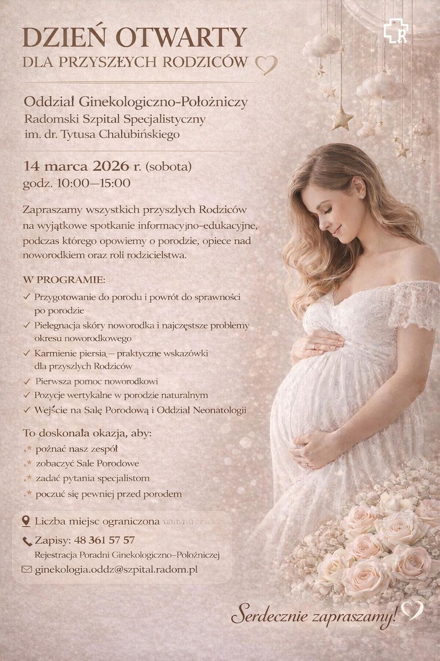 Udział w wydarzeniu jest bezpłatny. Obowiązują zapisy. Zgłosić się można pod numerem 48 361 57 57, w Rejestracji Poradni Ginekologiczno-Położniczej lub przez maila [email protected]
